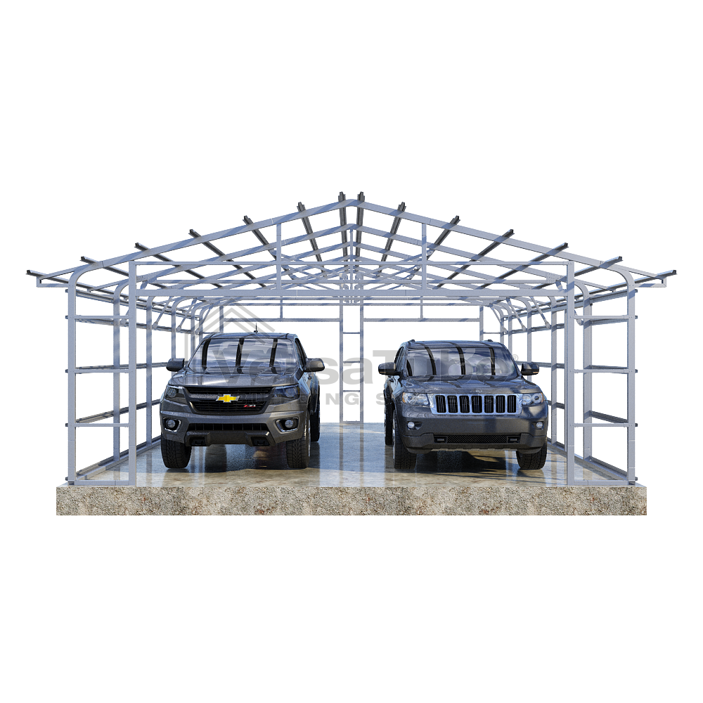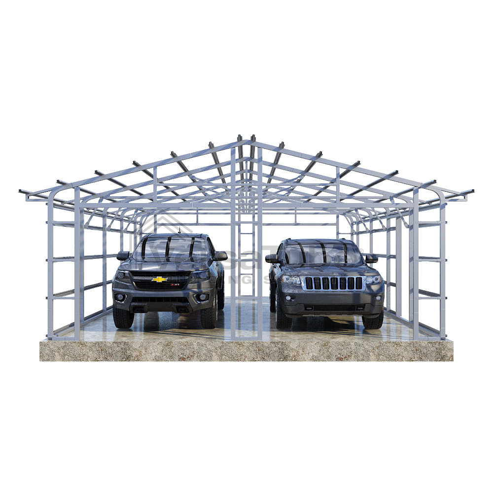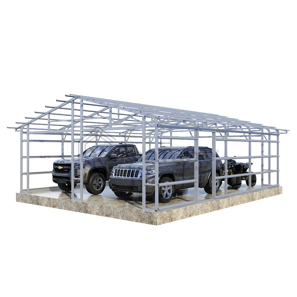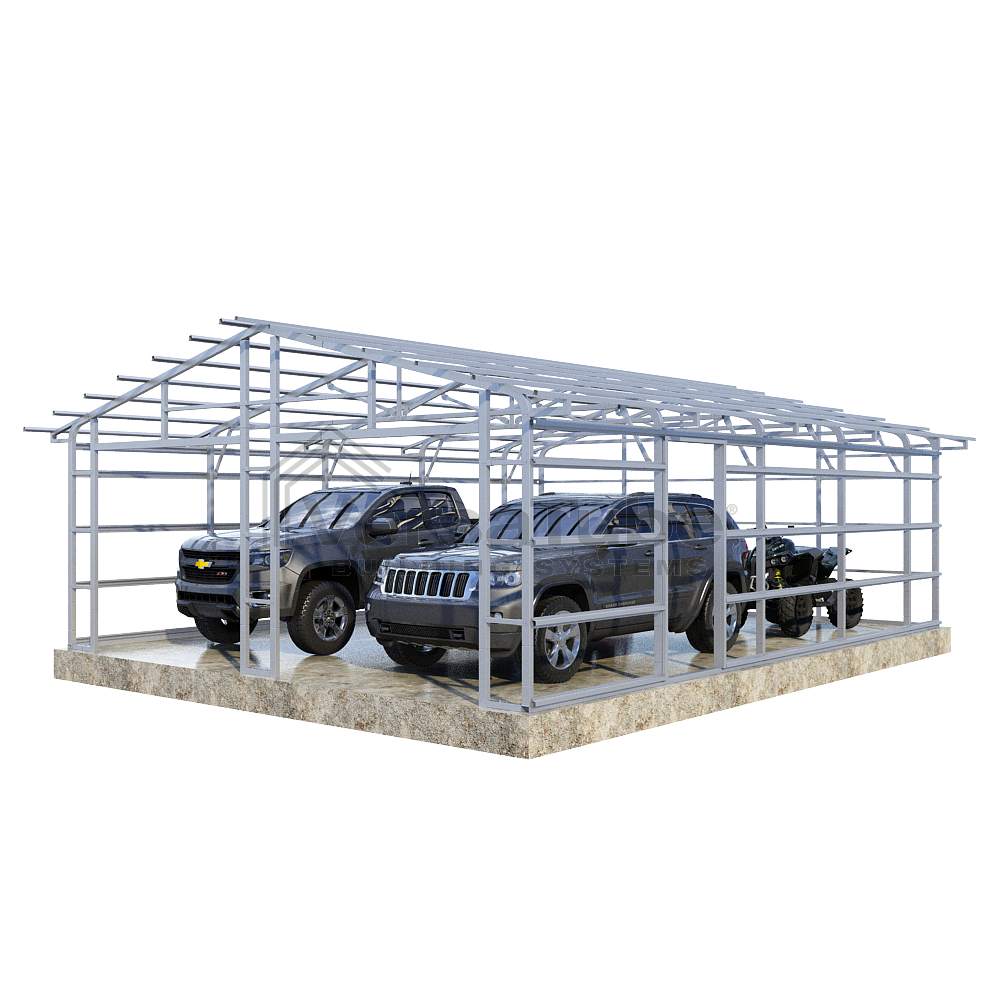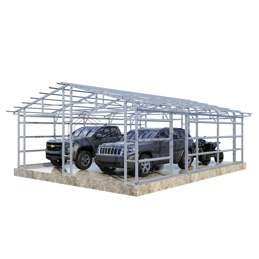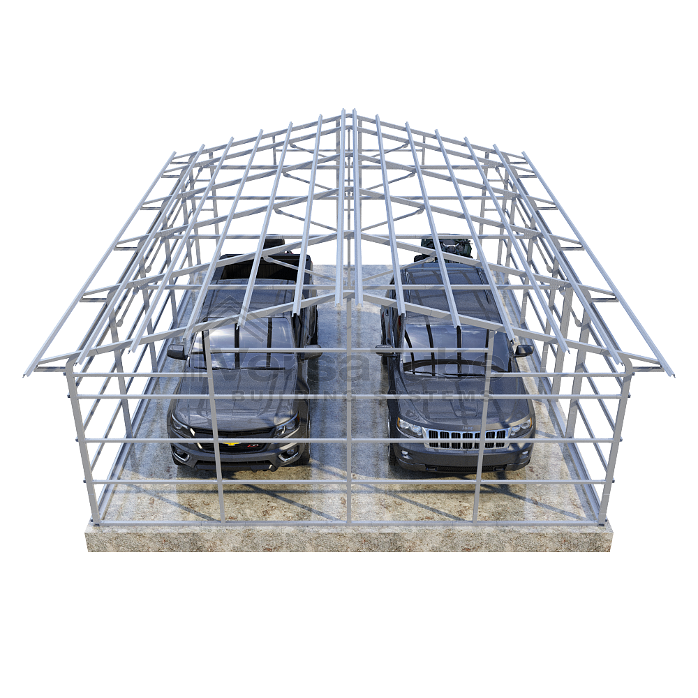 Summit Series DIY garage frame kit includes roof purlins and side girts for applying vertical sheet metal panels or other roofing or siding materials.