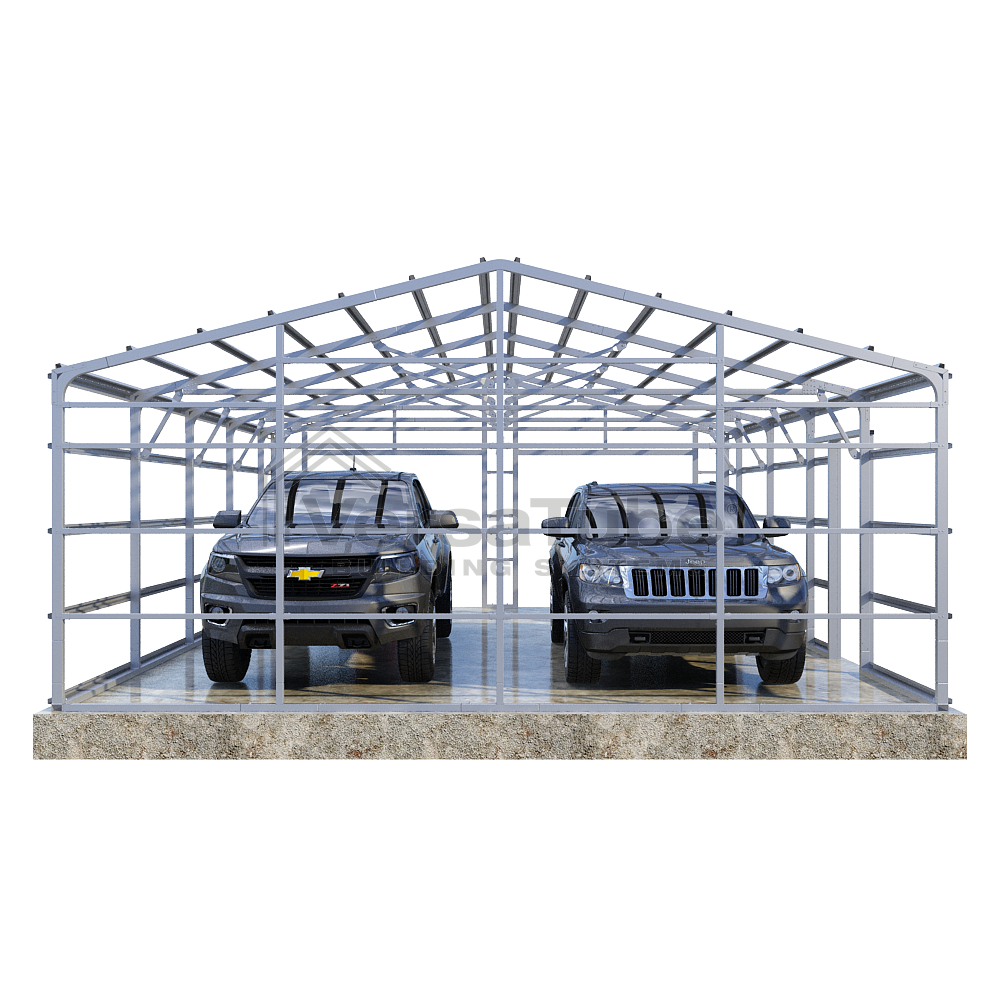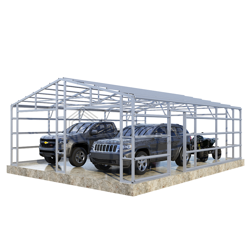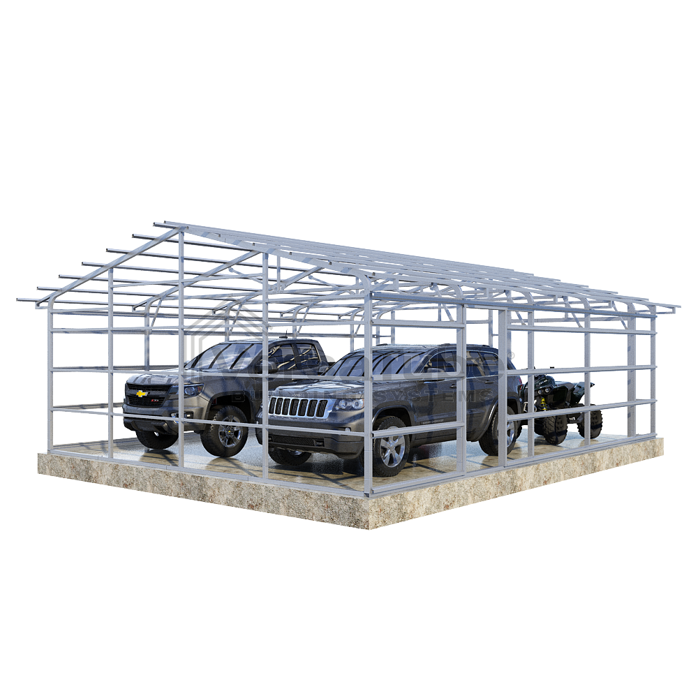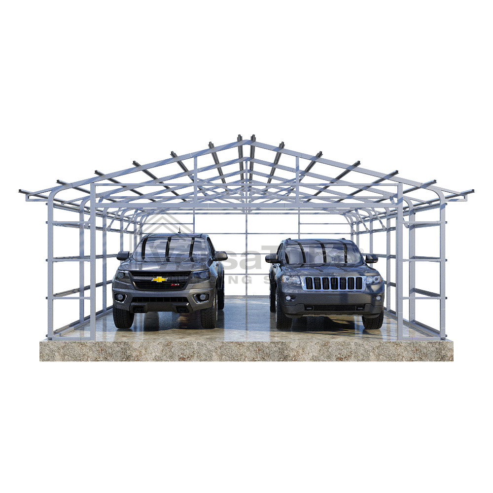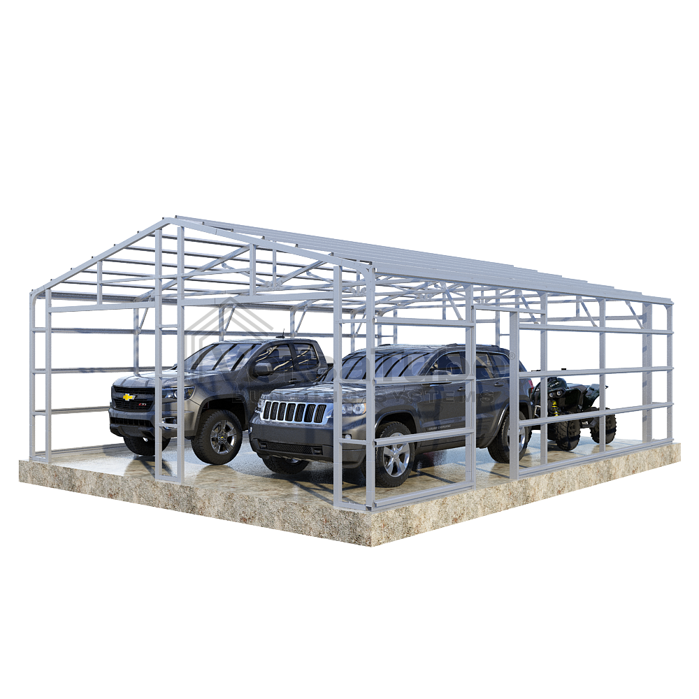 Summit Series DIY garage frame kit includes roof purlins and side girts for applying vertical sheet metal panels or other roofing or siding materials.