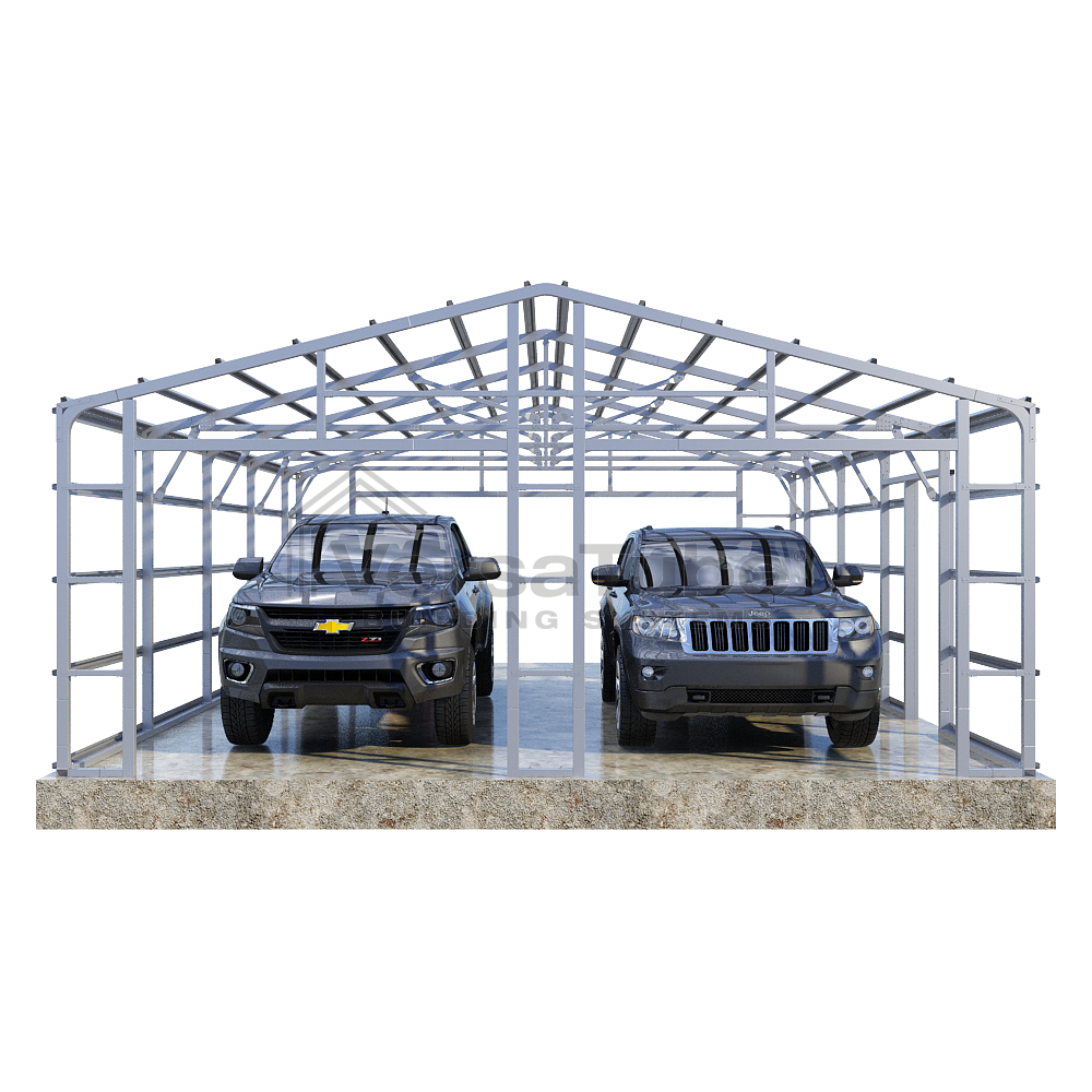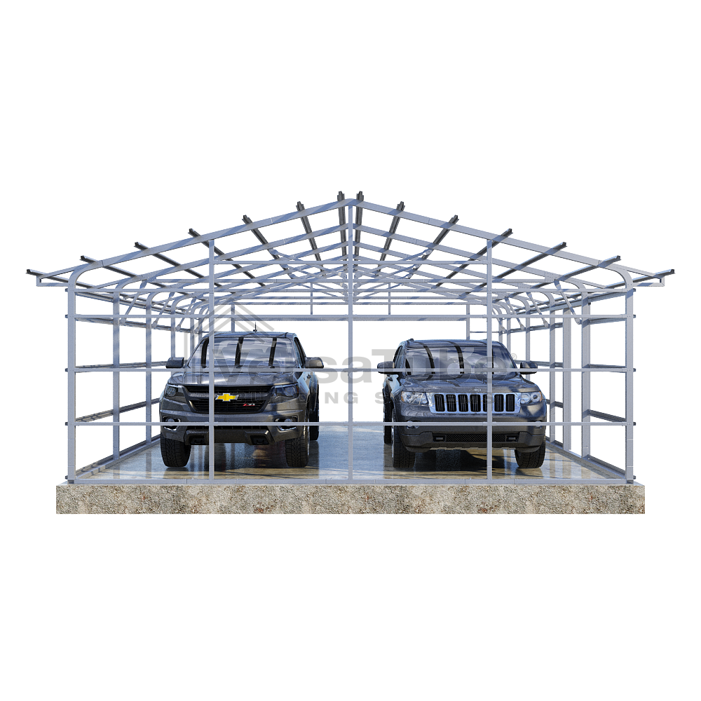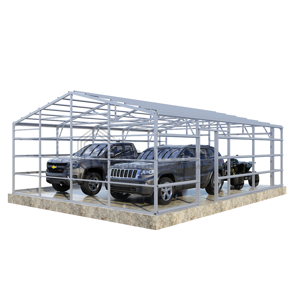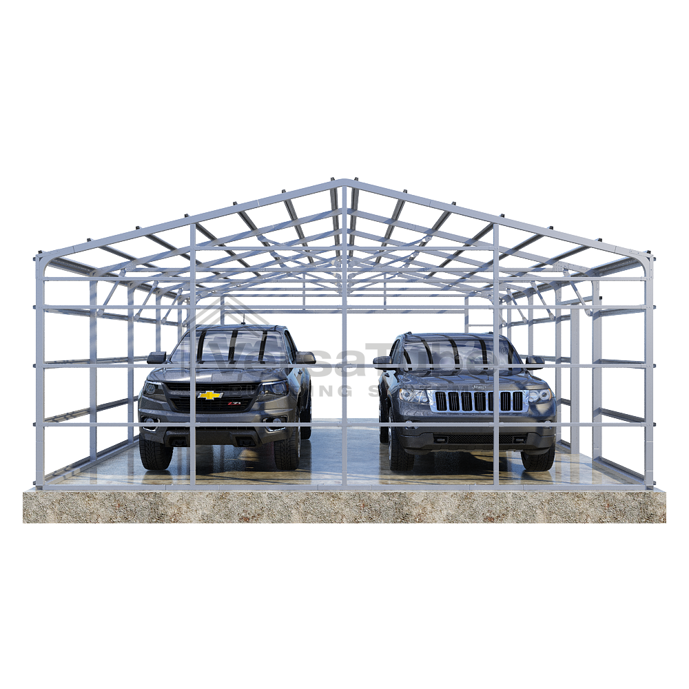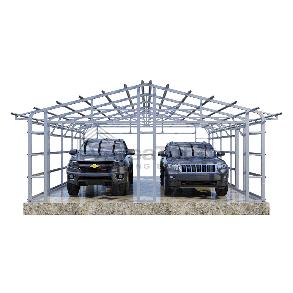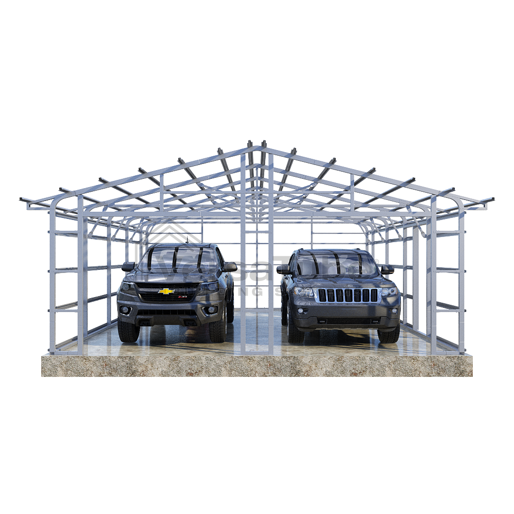 Summit Series DIY garage frame kit includes roof purlins and side girts for applying vertical sheet metal panels or other roofing or siding materials.