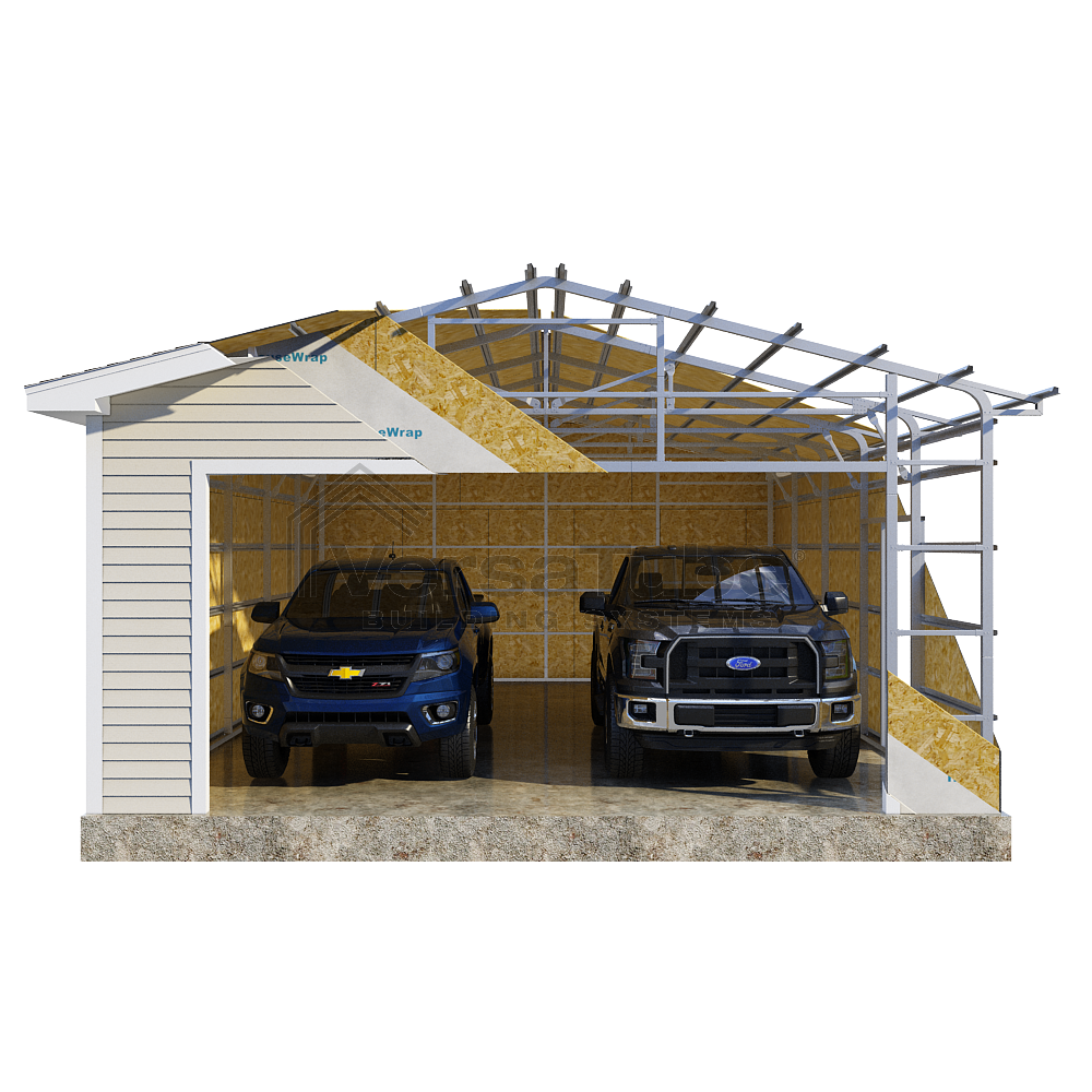 The required side girt components in the Summit design result in a more substantial building frame and allow for the use of plywood or OSB for vinyl or other siding products. And assembly time is drastically reduced with our patented Slip-Fit frame connections.