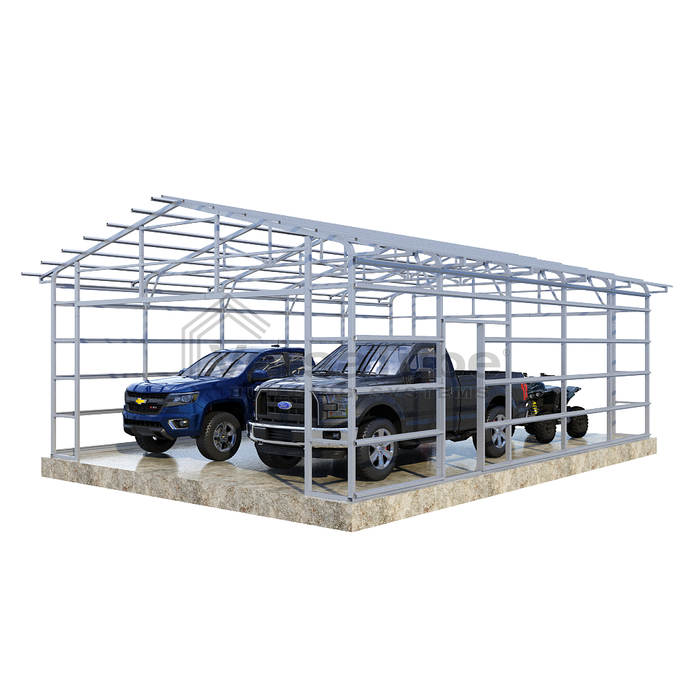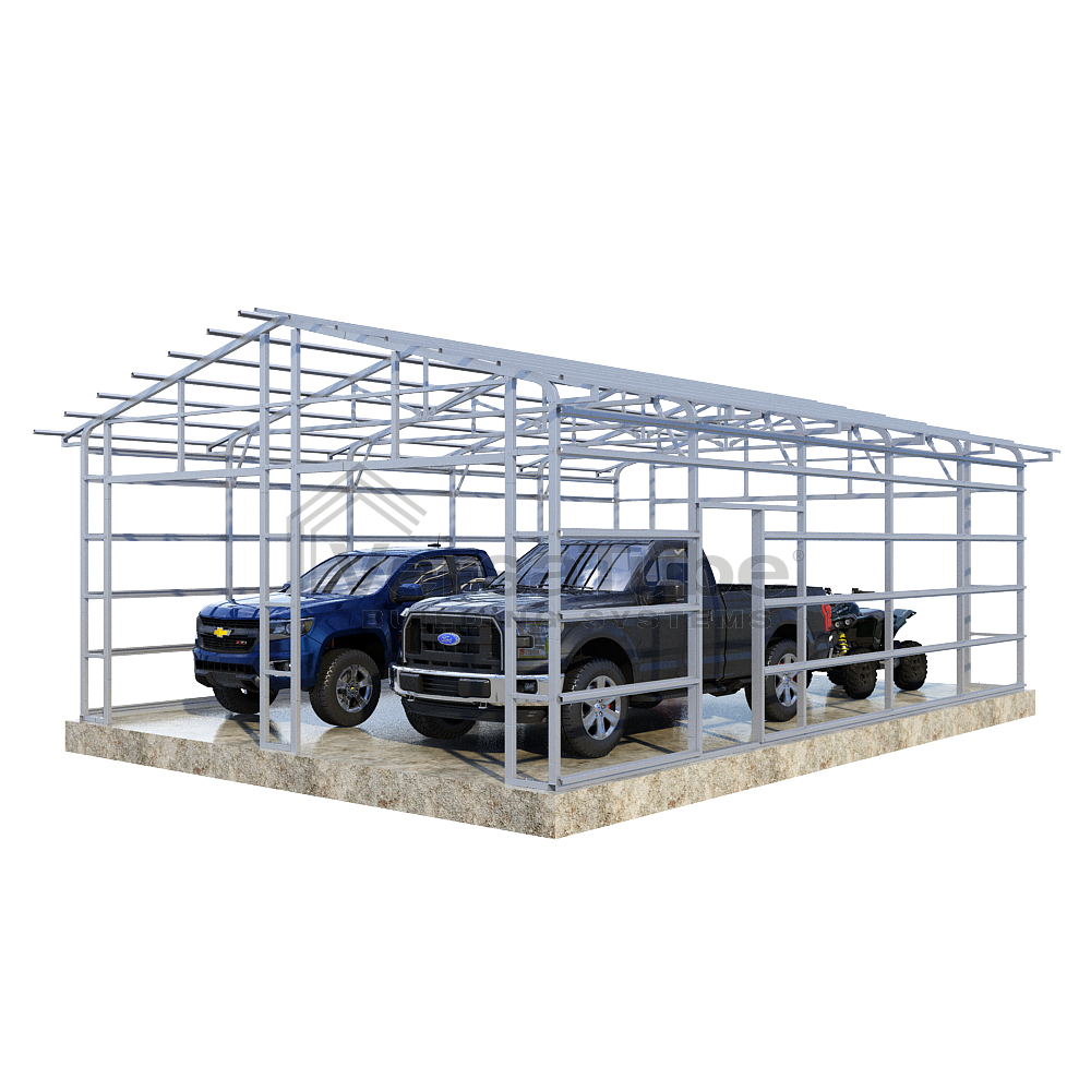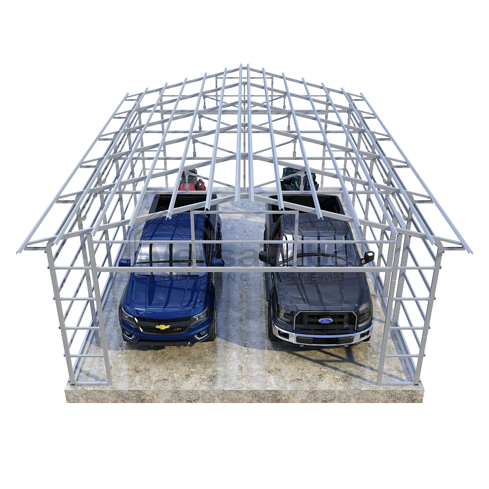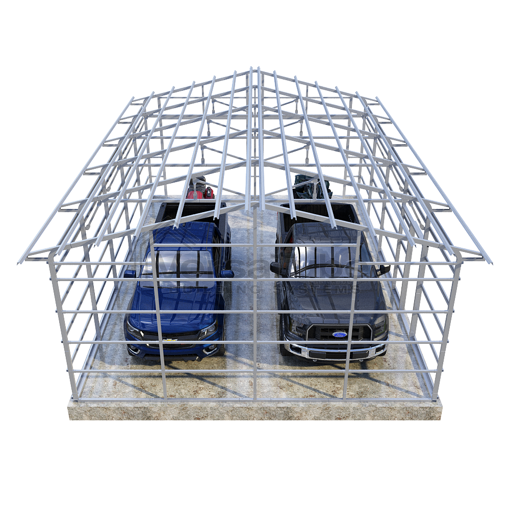 Summit Series DIY garage frame kit includes roof purlins and side girts for applying vertical sheet metal panels or other roofing or siding materials.