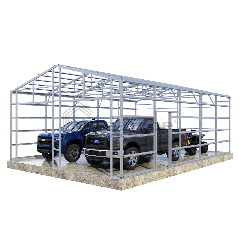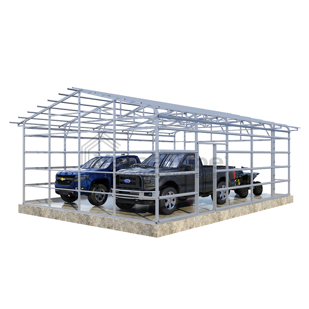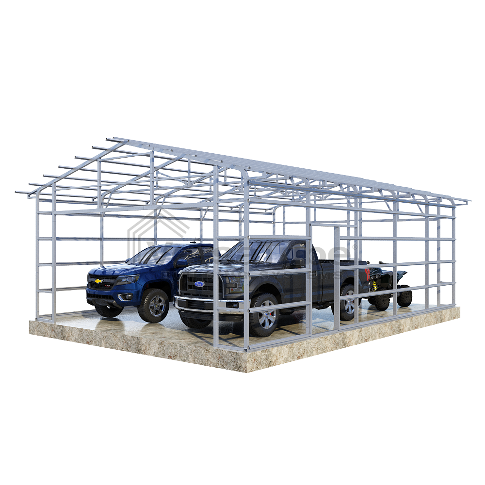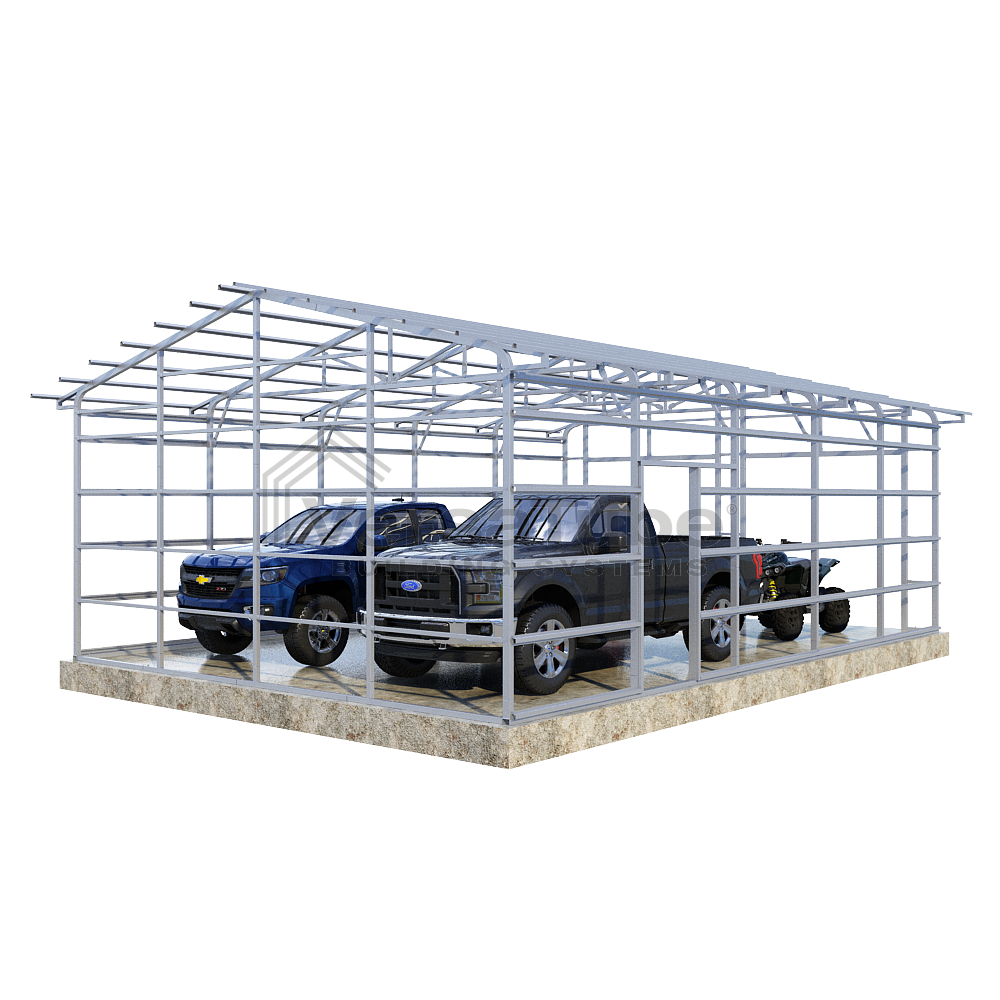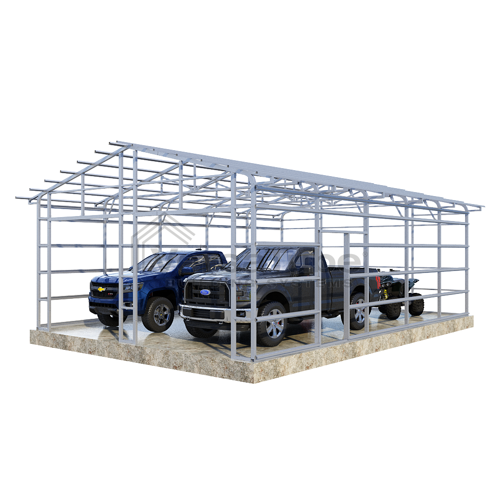 Summit Series DIY garage frame kit includes roof purlins and side girts for applying vertical sheet metal panels or other roofing or siding materials.
