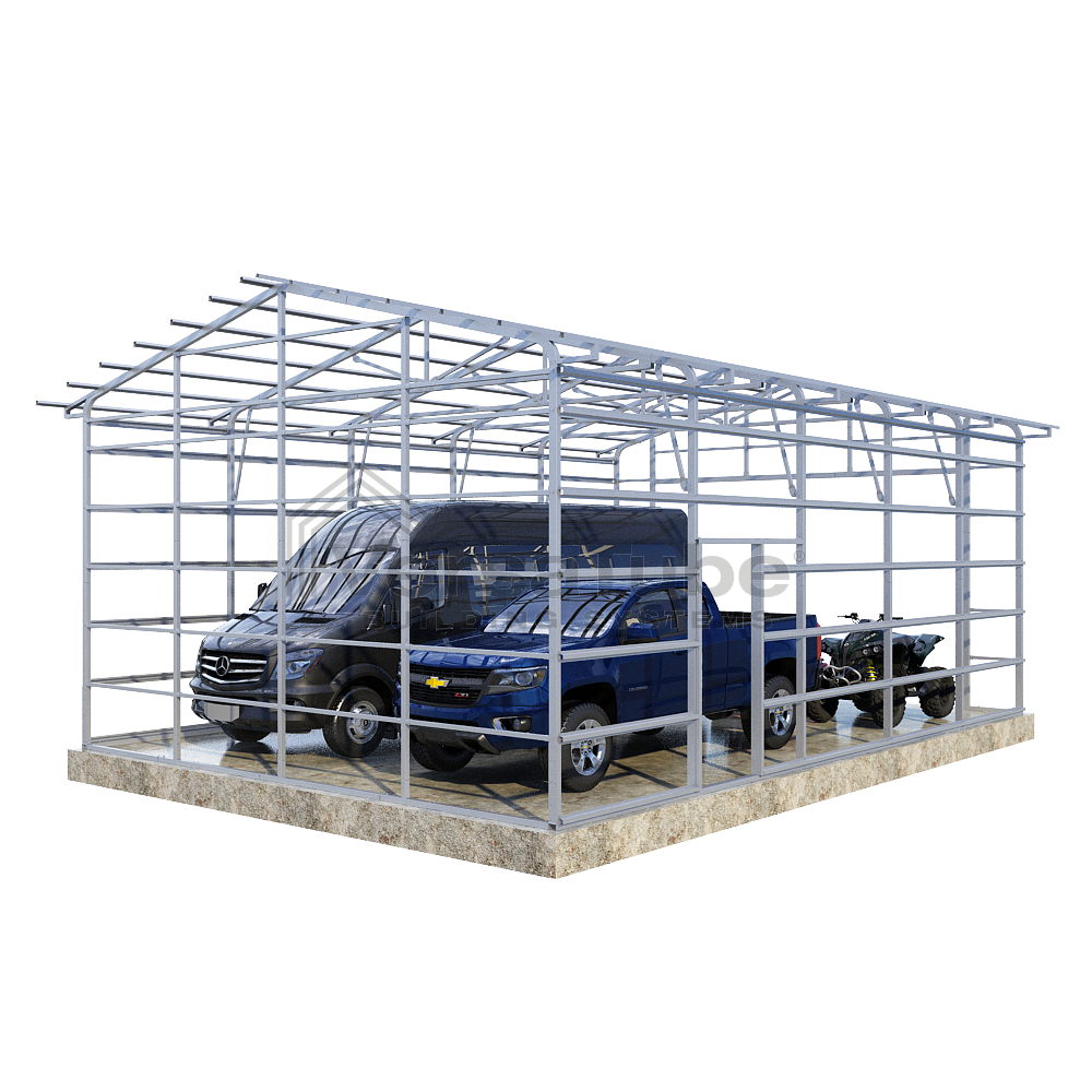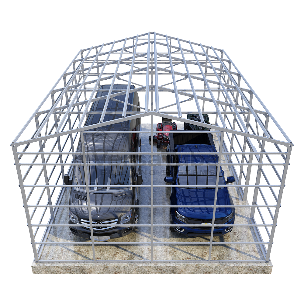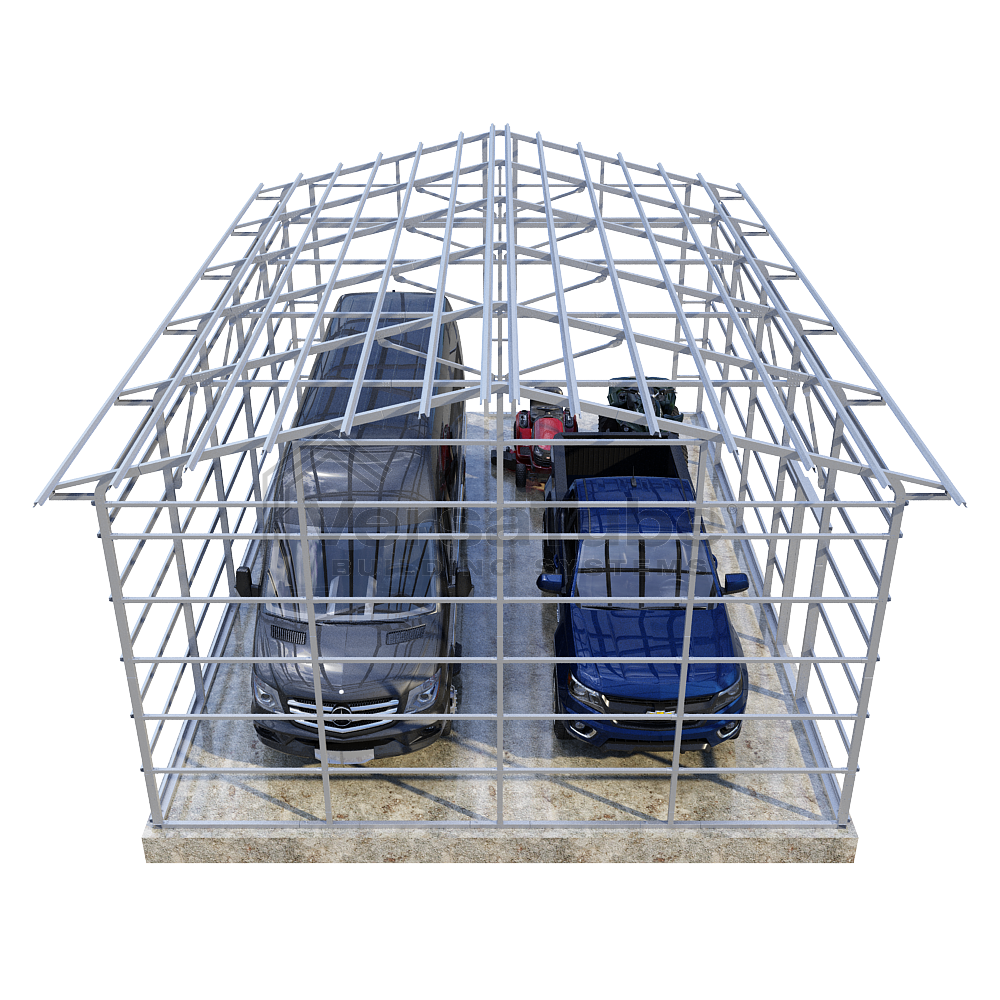 Summit Series DIY garage frame kit includes roof purlins and side girts for applying vertical sheet metal panels or other roofing or siding materials.