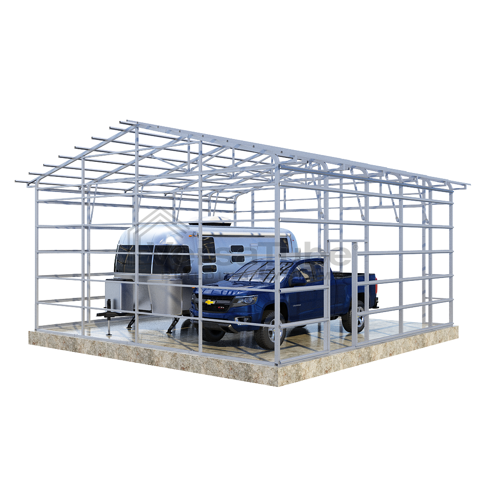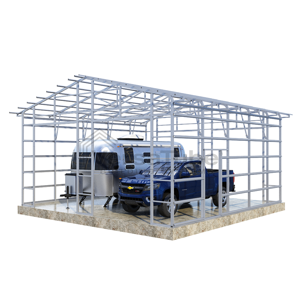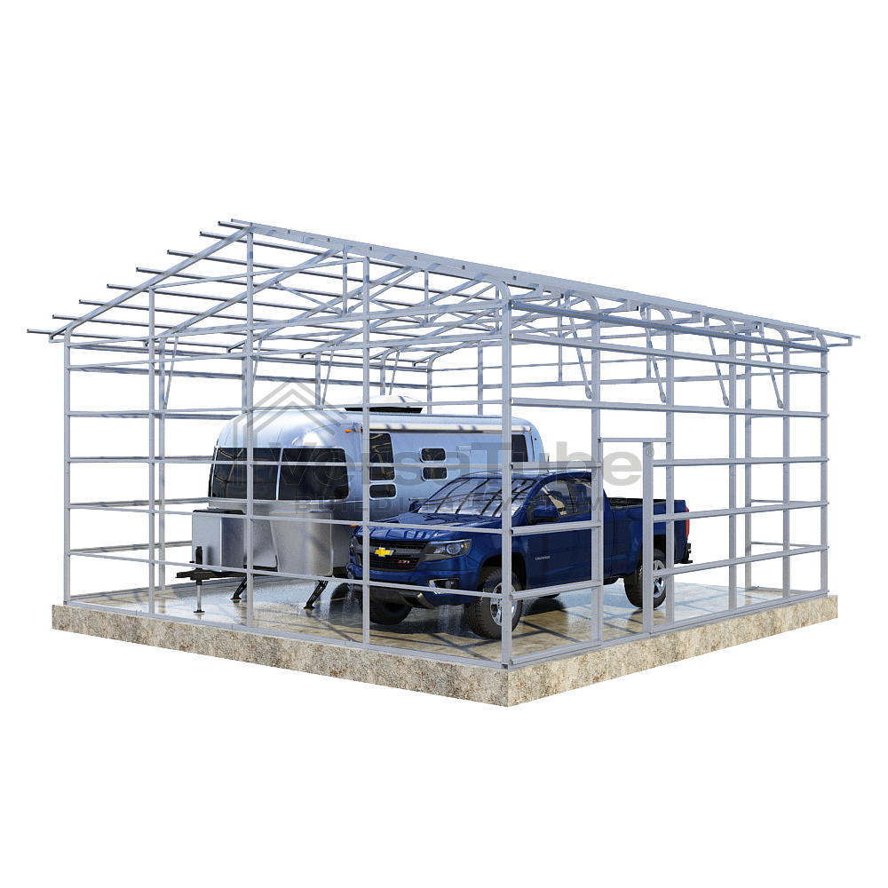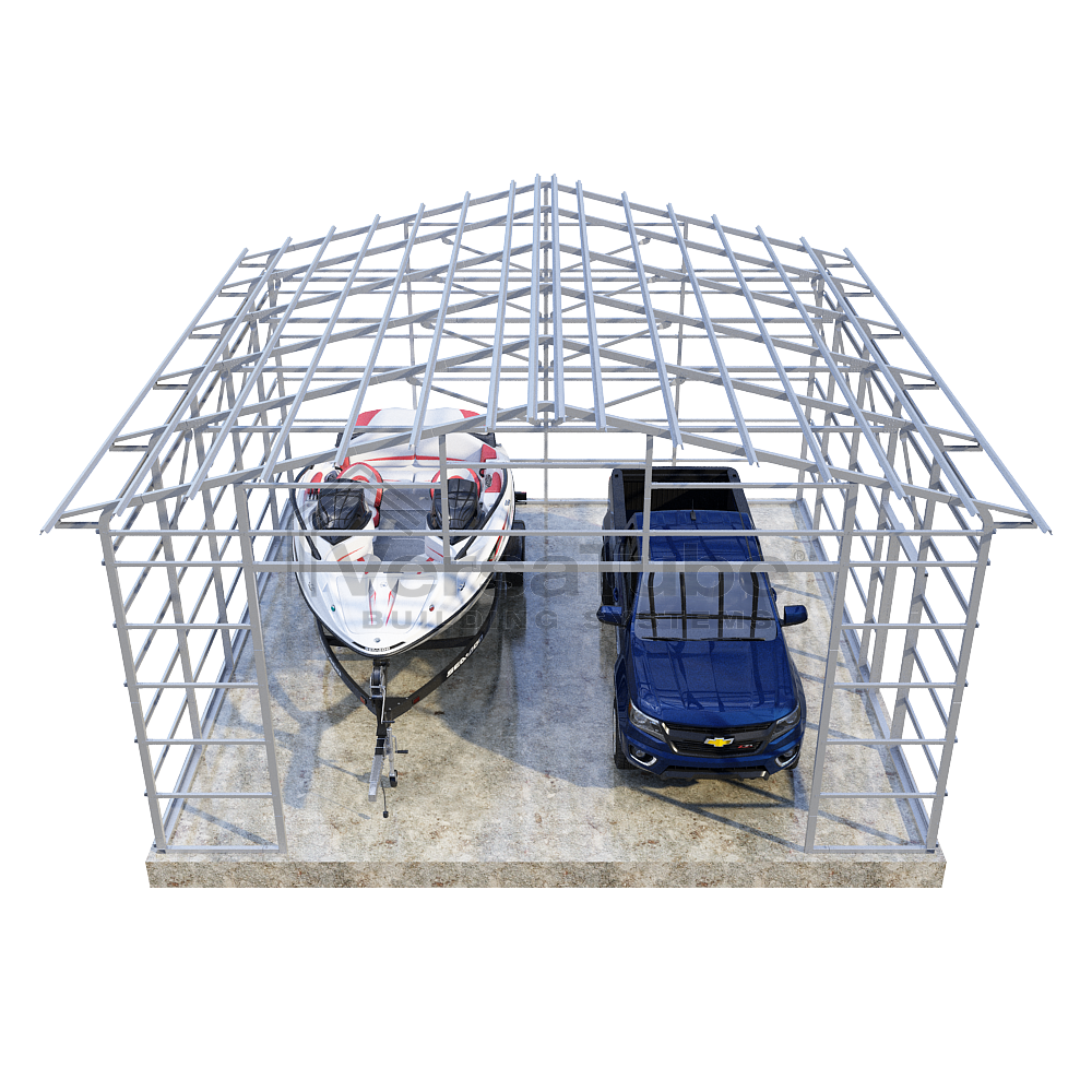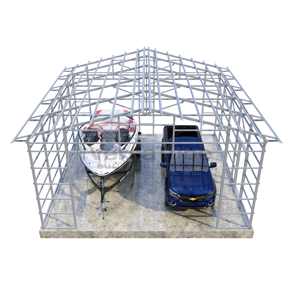 Summit Series DIY garage frame kit includes roof purlins and side girts for applying vertical sheet metal panels or other roofing or siding materials.
