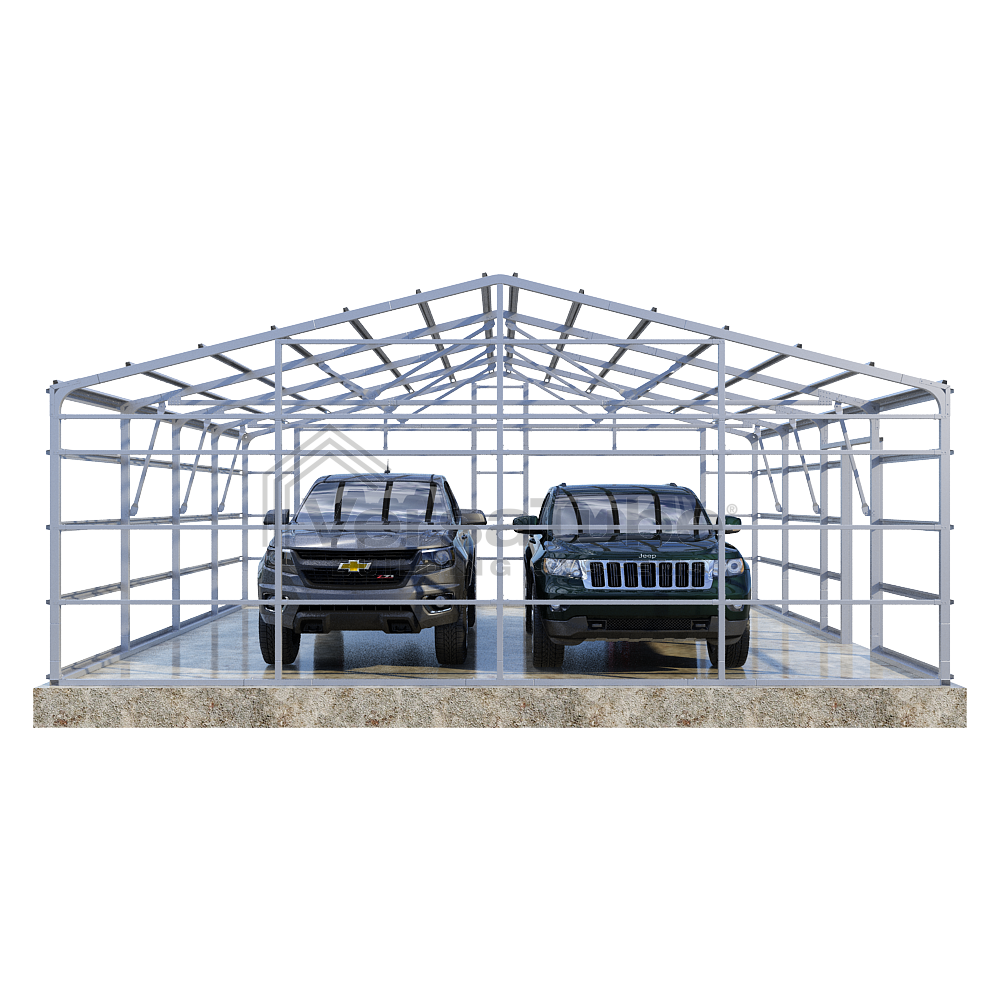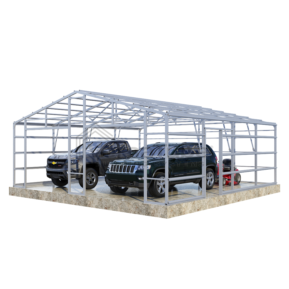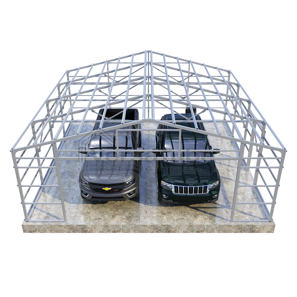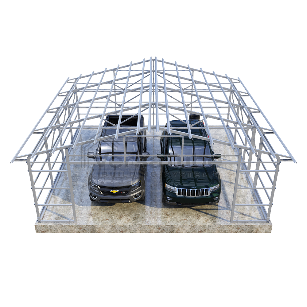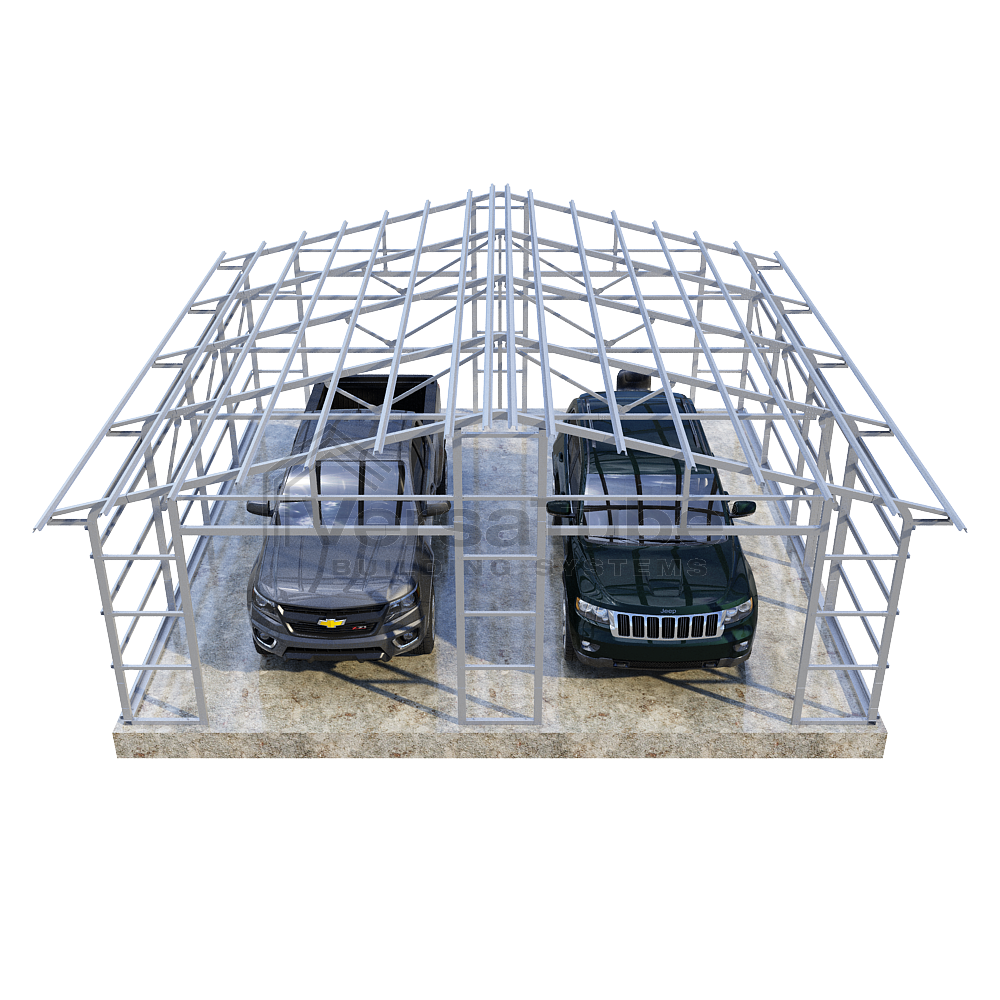 Summit Series DIY garage frame kit includes roof purlins and side girts for applying vertical sheet metal panels or other roofing or siding materials.