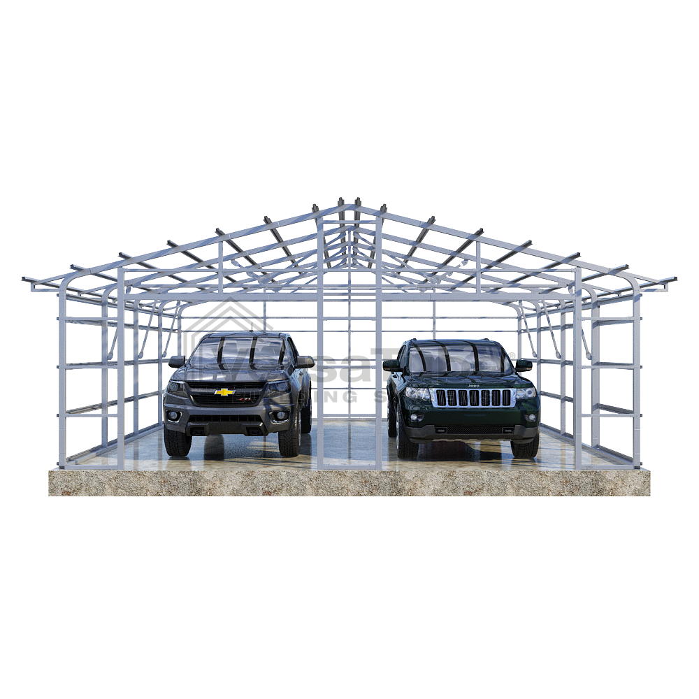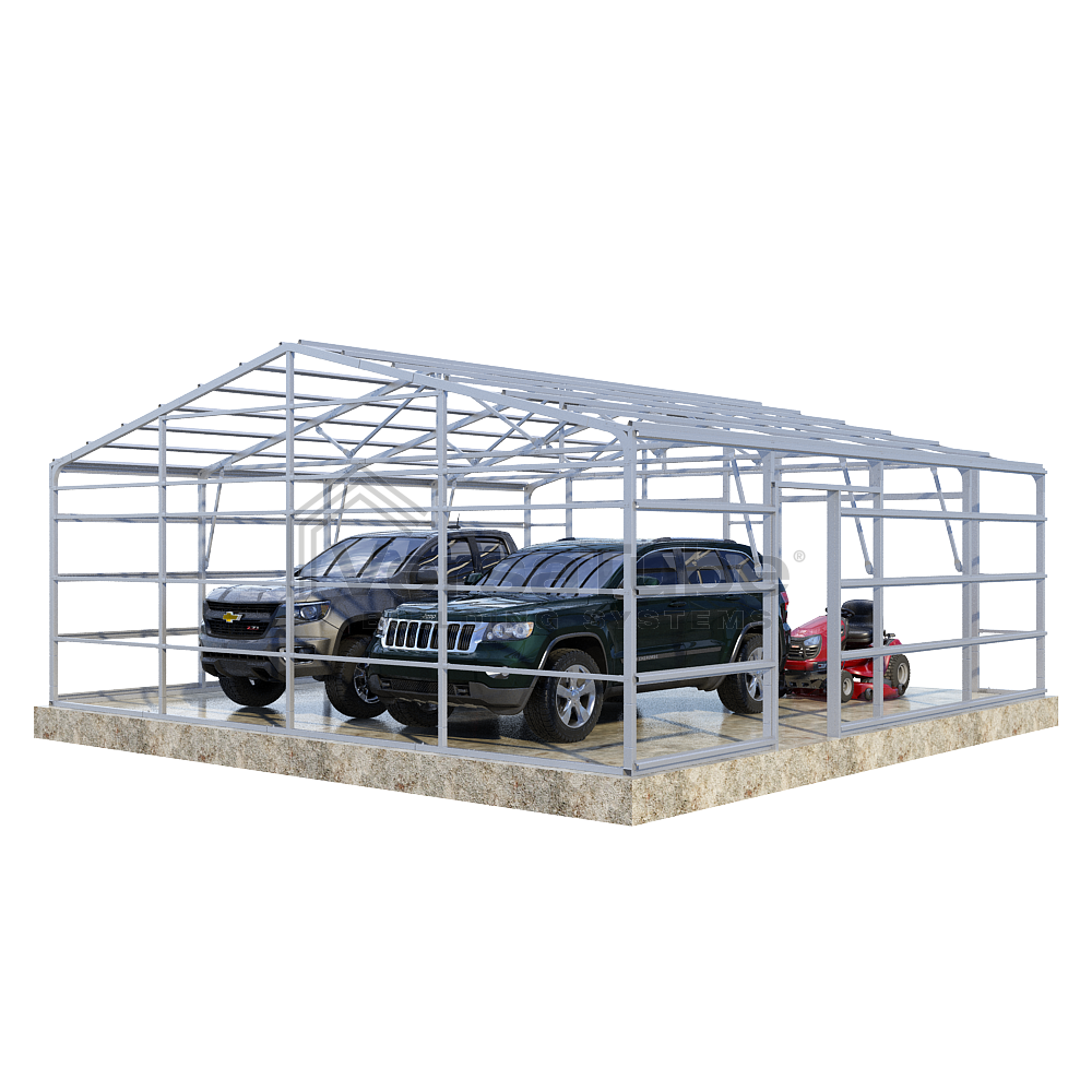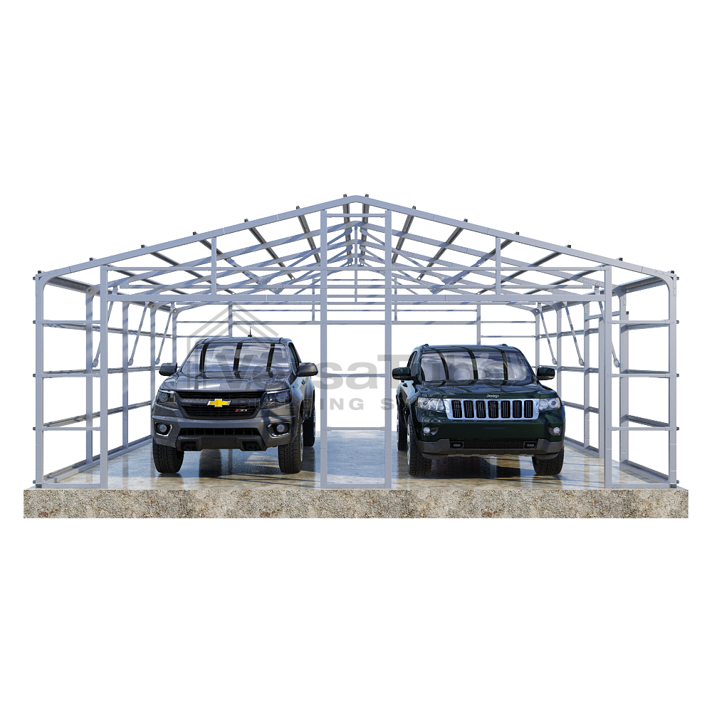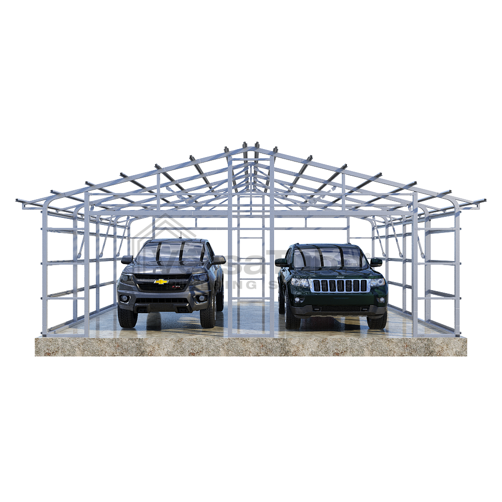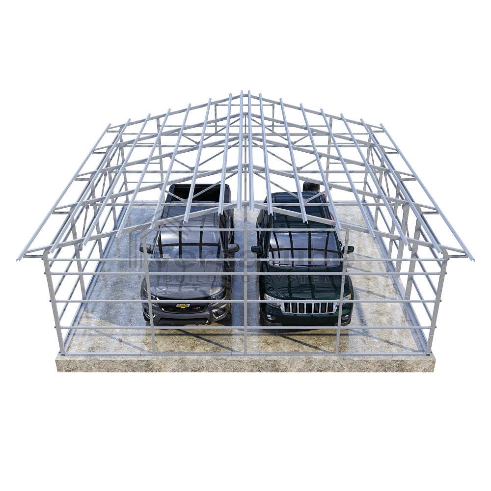Summit Series DIY garage frame kit includes roof purlins and side girts for applying vertical sheet metal panels or other roofing or siding materials.
