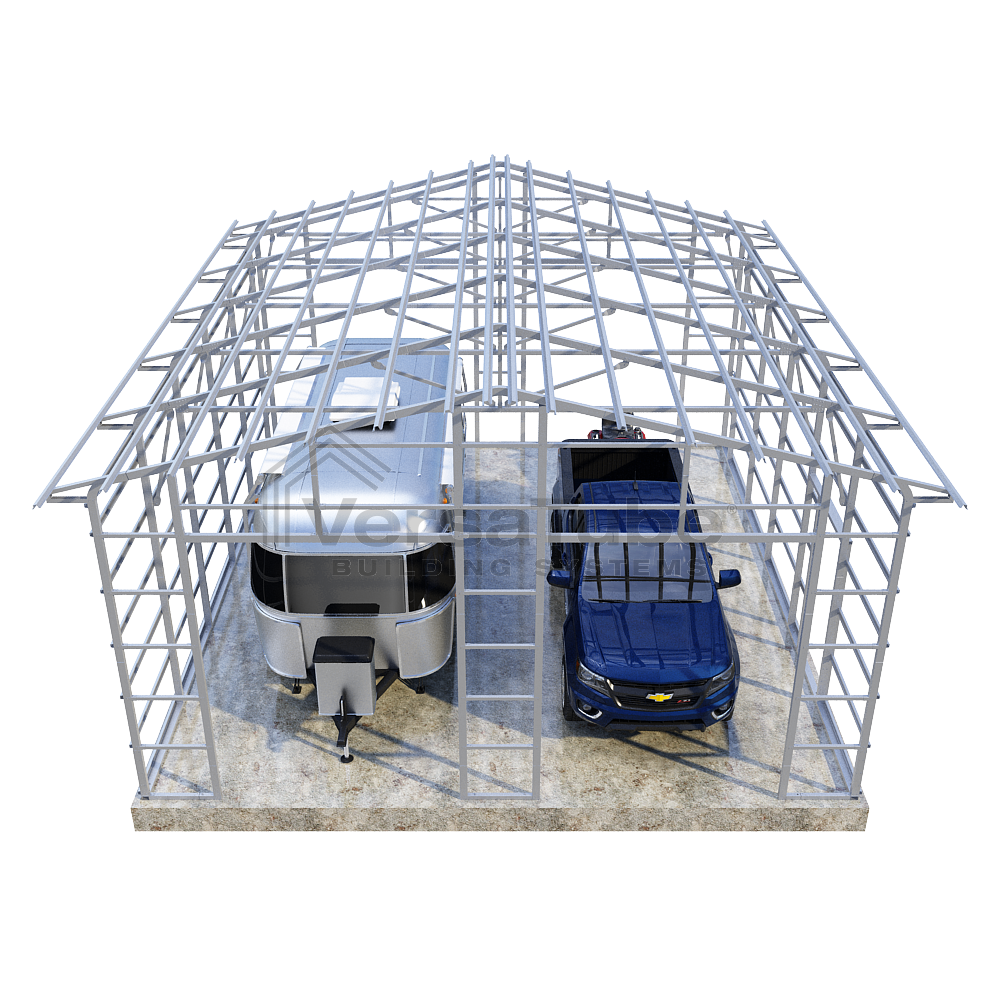 Summit Series DIY garage frame kit includes roof purlins and side girts for applying vertical sheet metal panels or other roofing or siding materials.