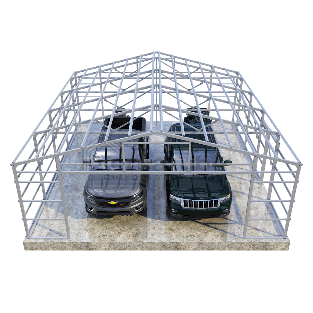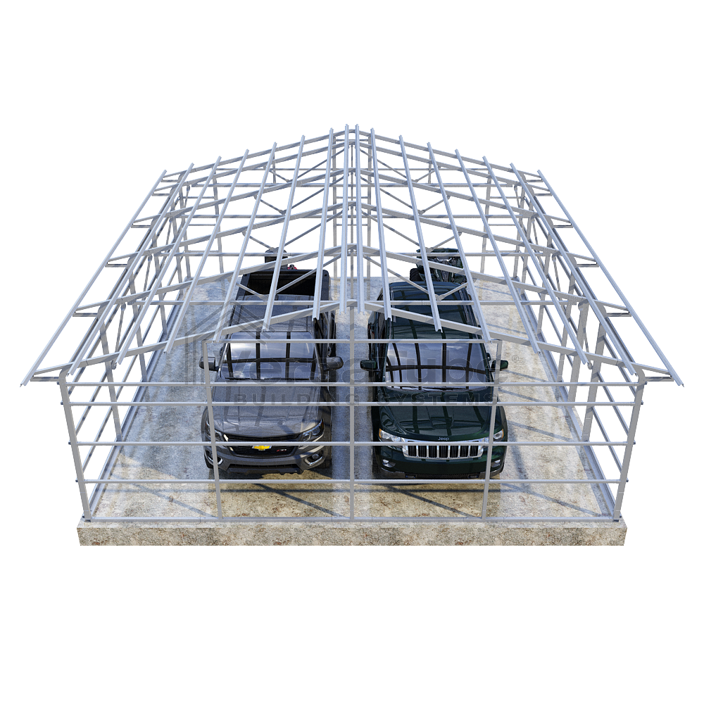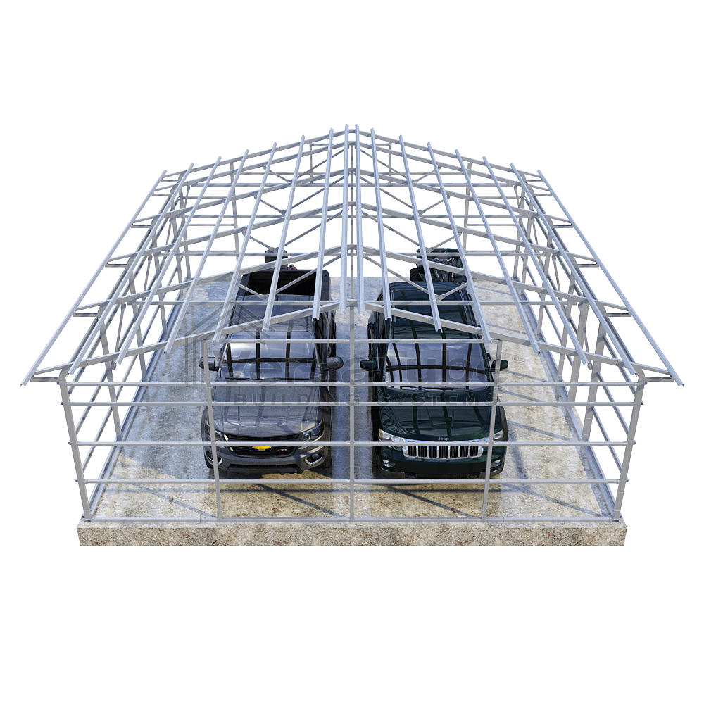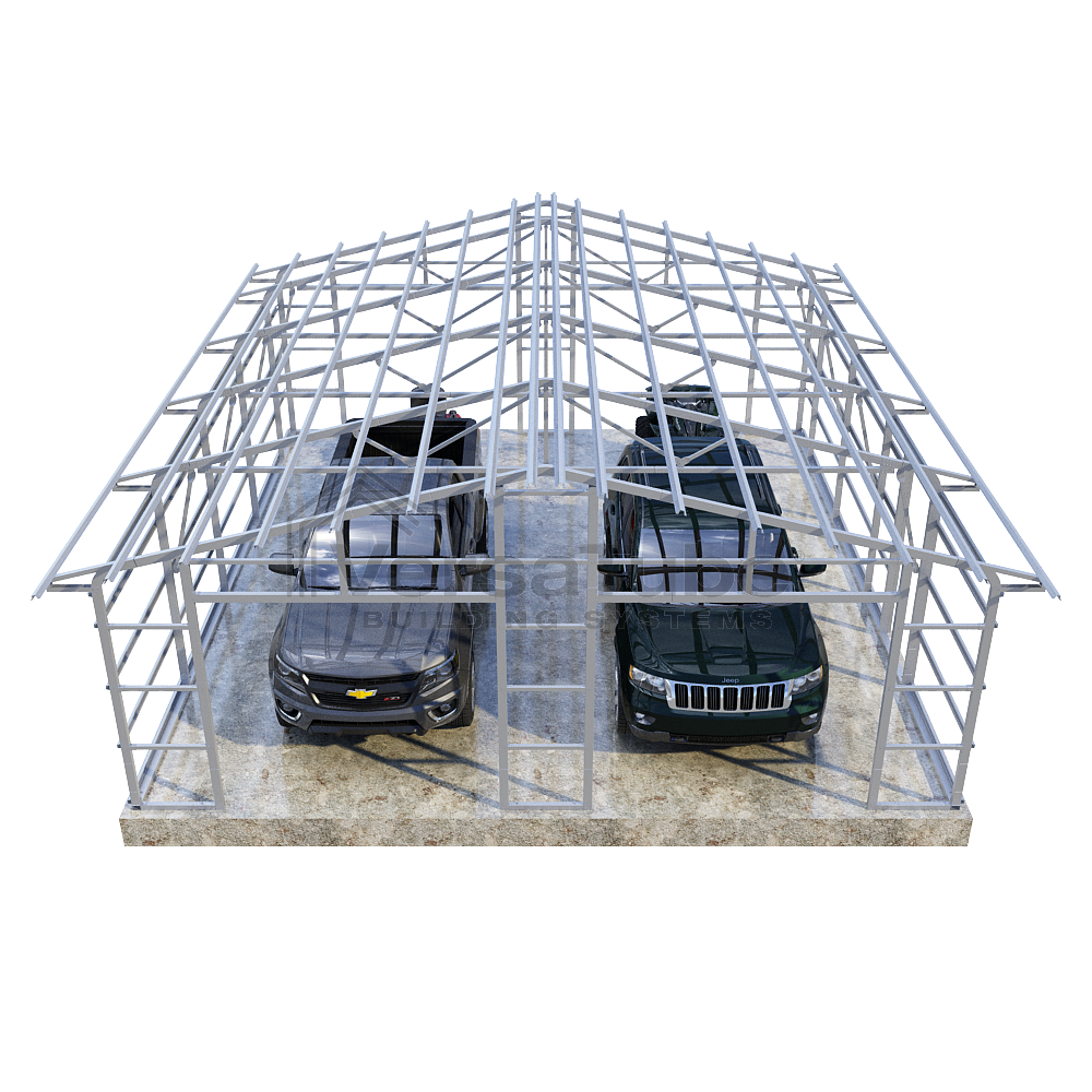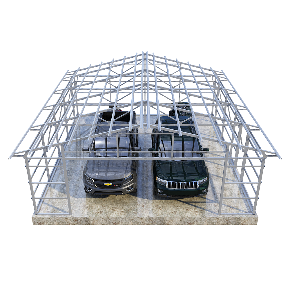Summit Series DIY garage frame kit includes roof purlins and side girts for applying vertical sheet metal panels or other roofing or siding materials.