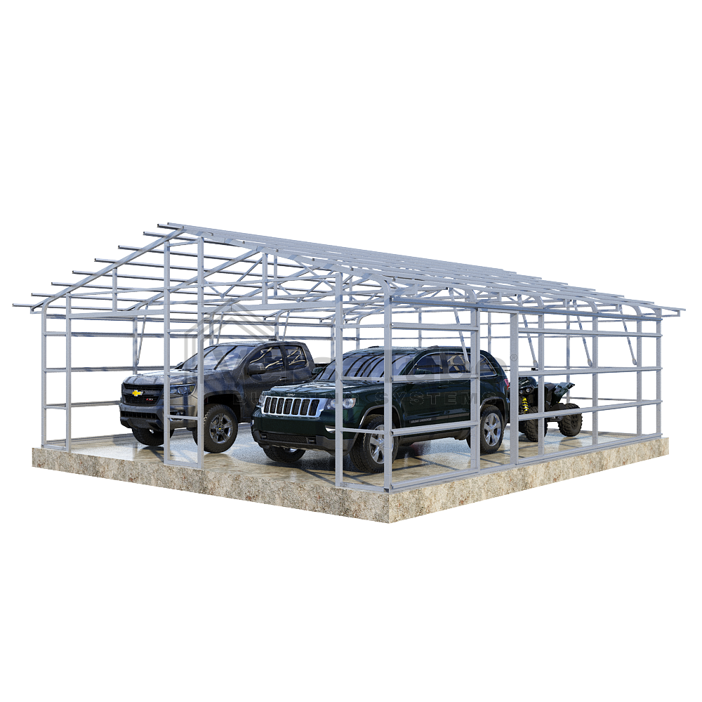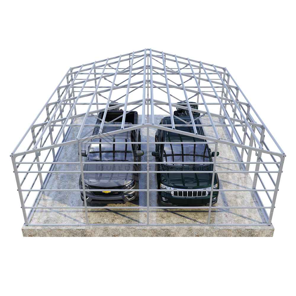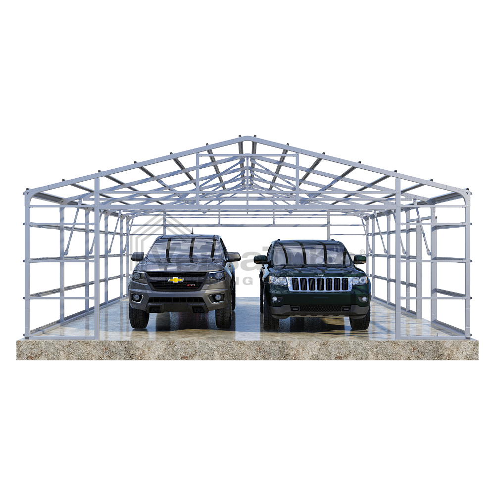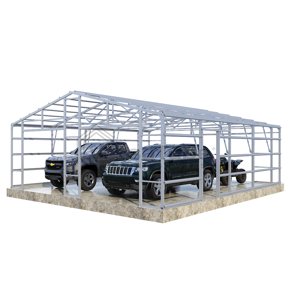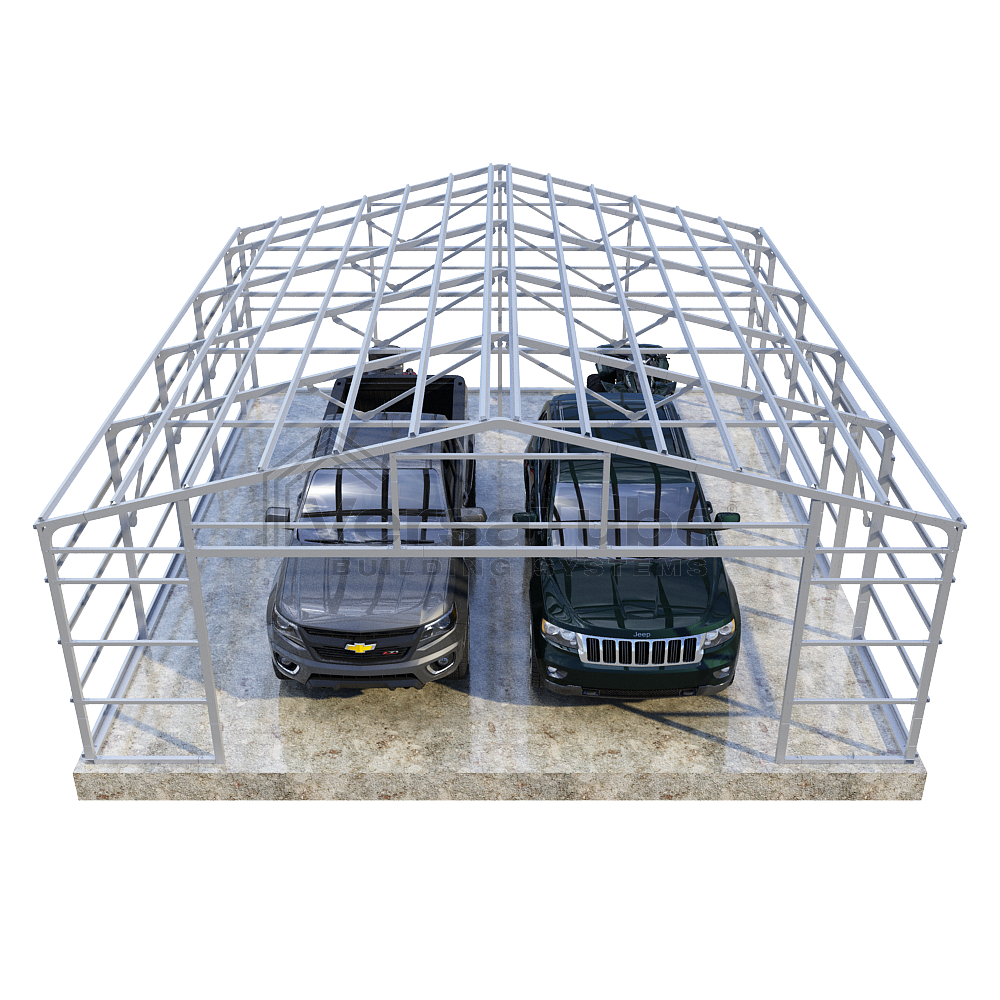 Summit Series DIY garage frame kit includes roof purlins and side girts for applying vertical sheet metal panels or other roofing or siding materials.