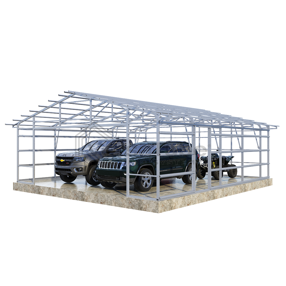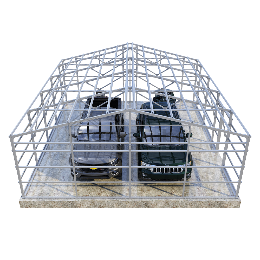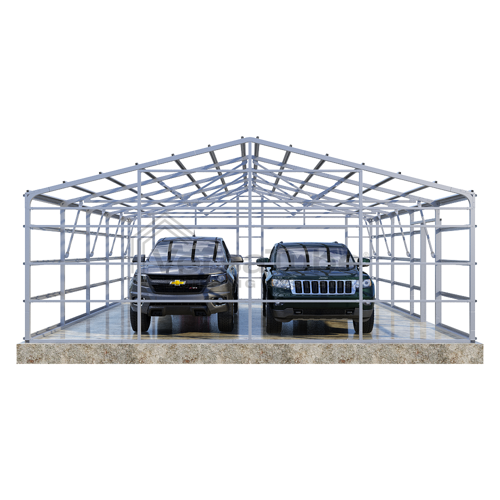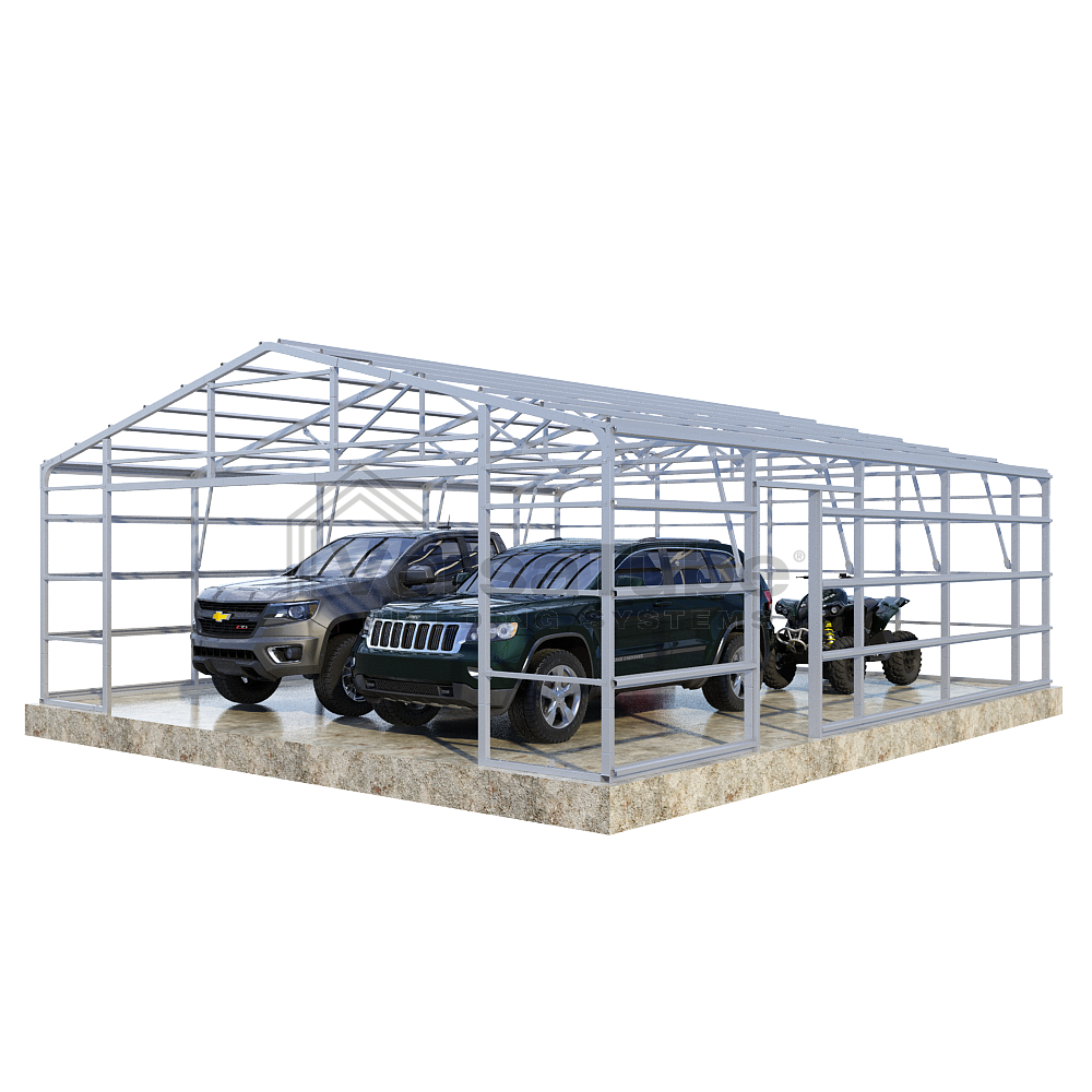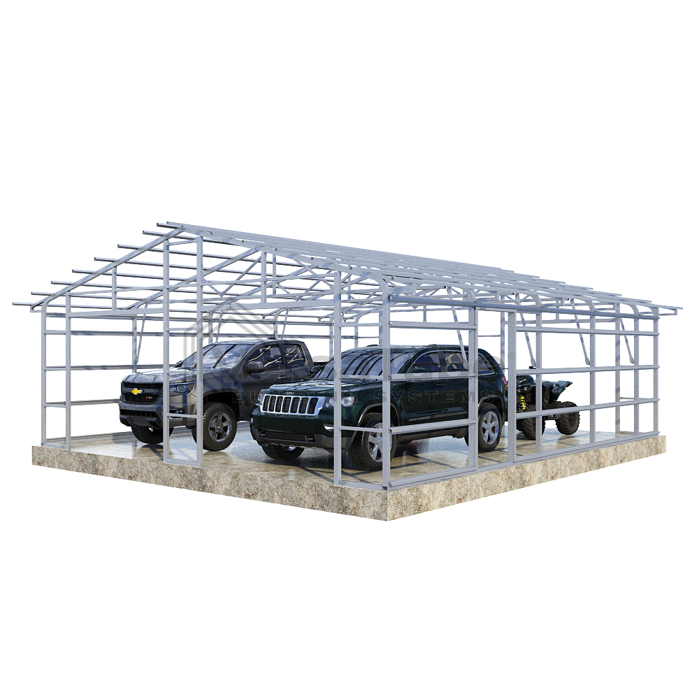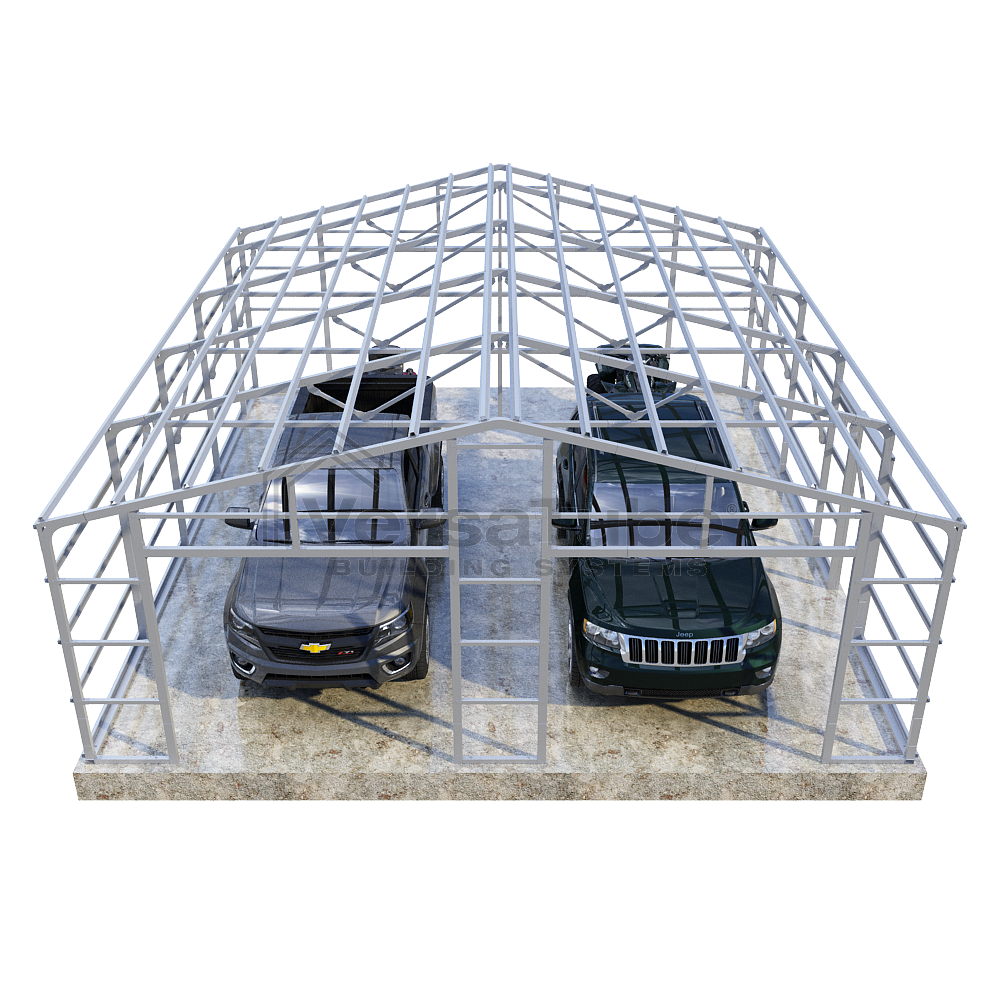 Summit Series DIY garage frame kit includes roof purlins and side girts for applying vertical sheet metal panels or other roofing or siding materials.