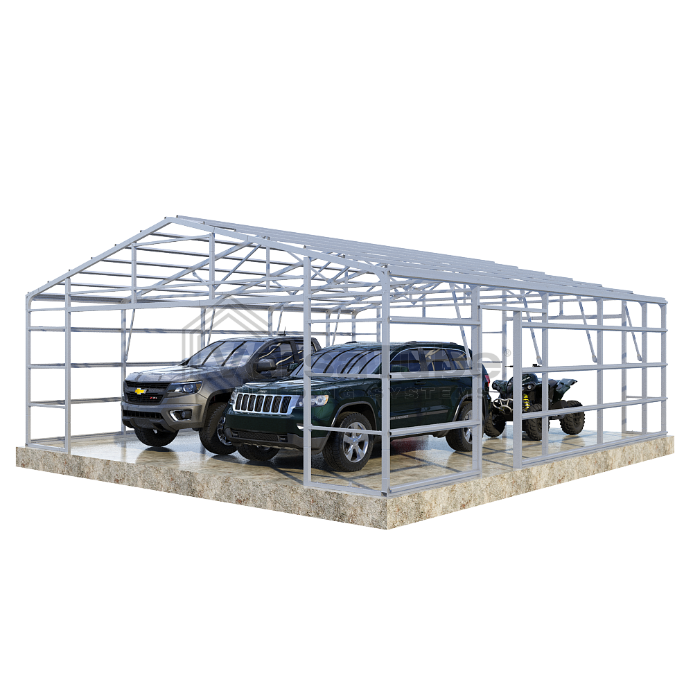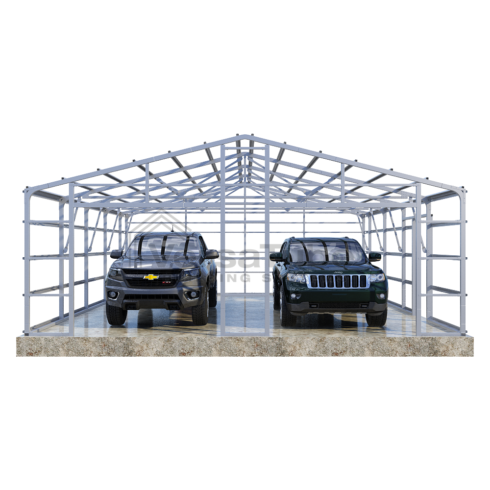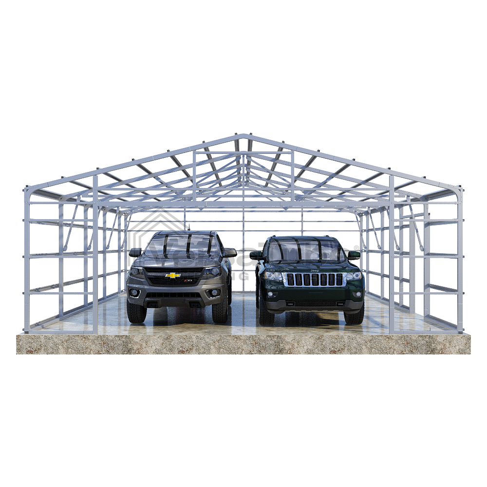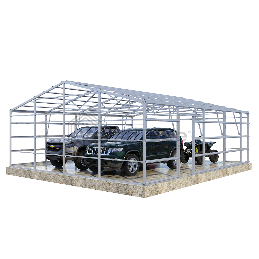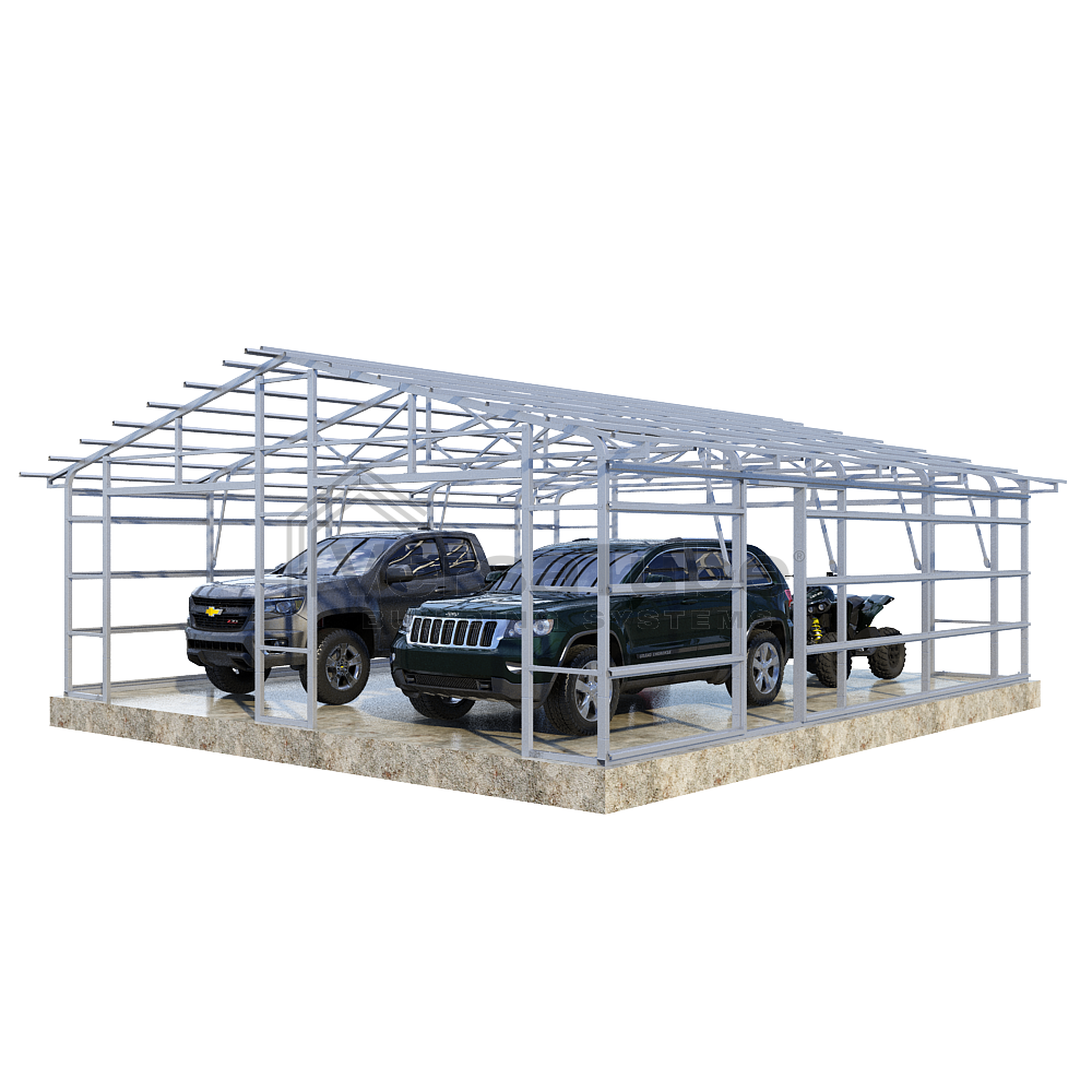 Summit Series DIY garage frame kit includes roof purlins and side girts for applying vertical sheet metal panels or other roofing or siding materials.