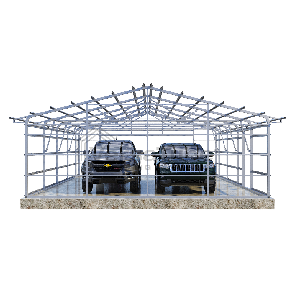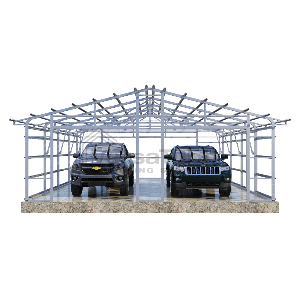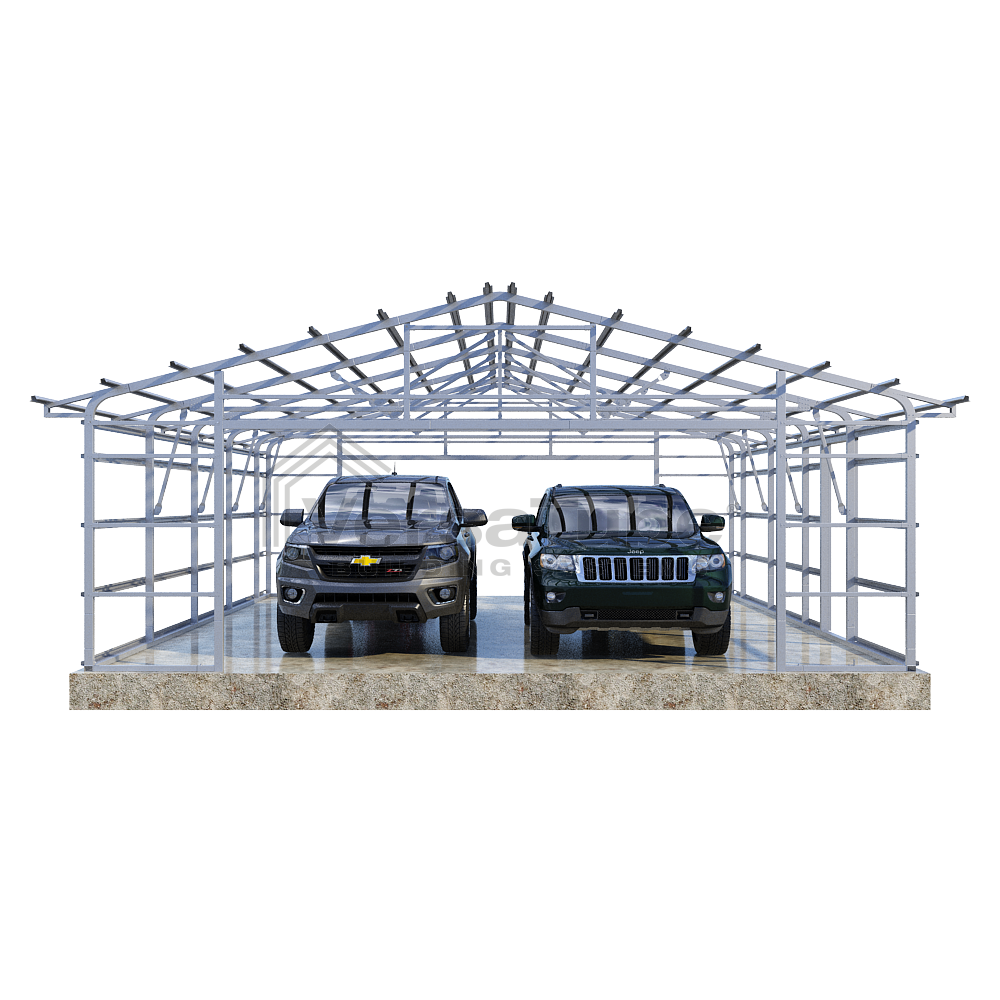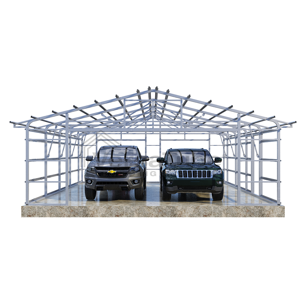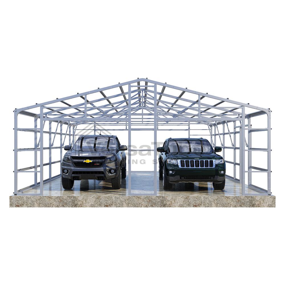 Summit Series DIY garage frame kit includes roof purlins and side girts for applying vertical sheet metal panels or other roofing or siding materials.