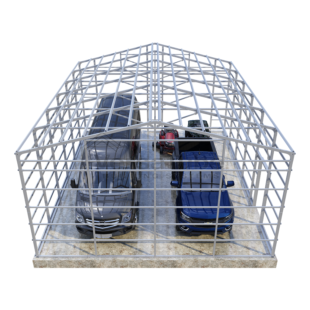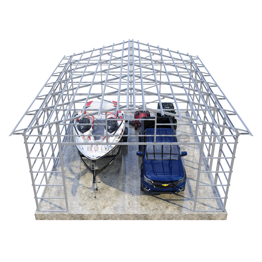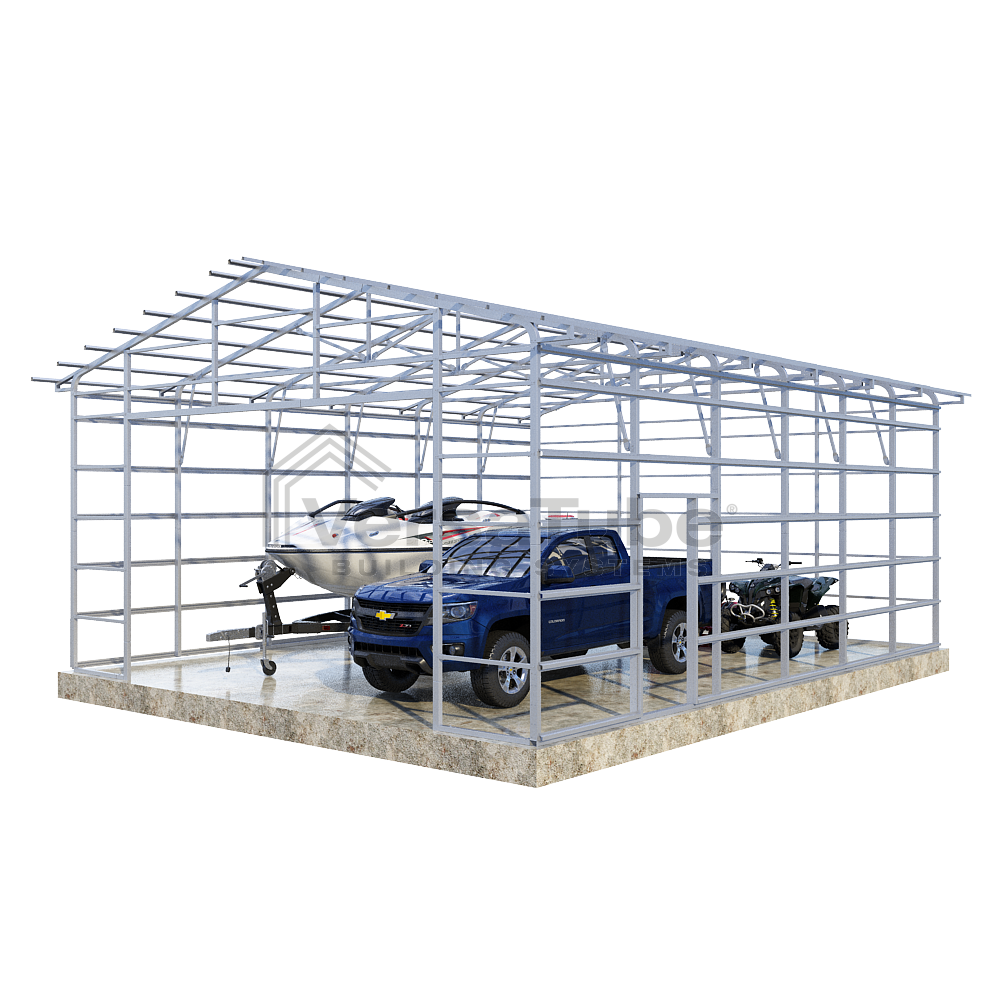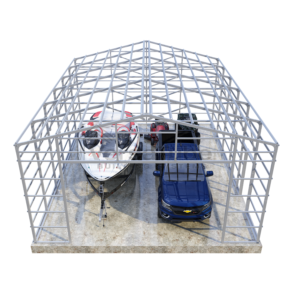 Summit Series DIY garage frame kit includes roof purlins and side girts for applying vertical sheet metal panels or other roofing or siding materials.