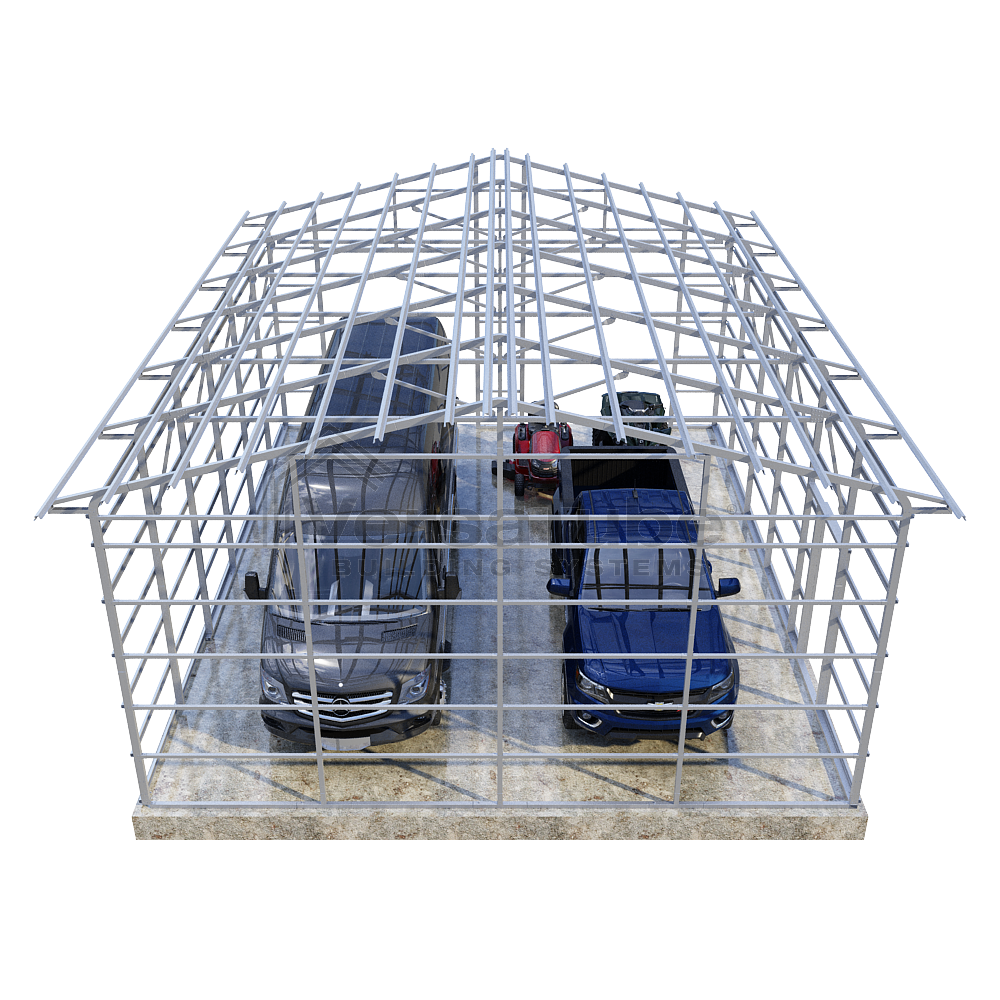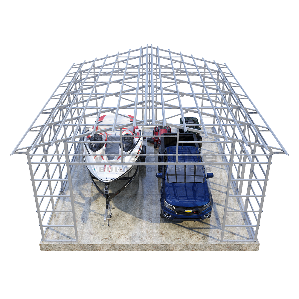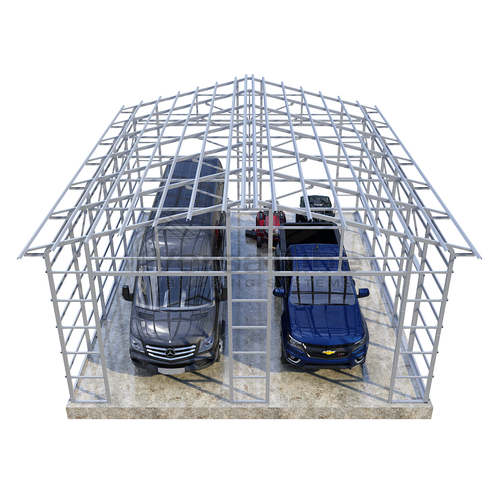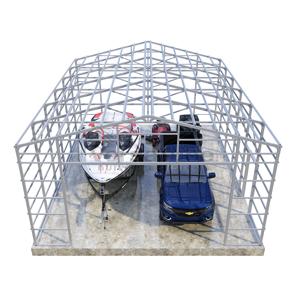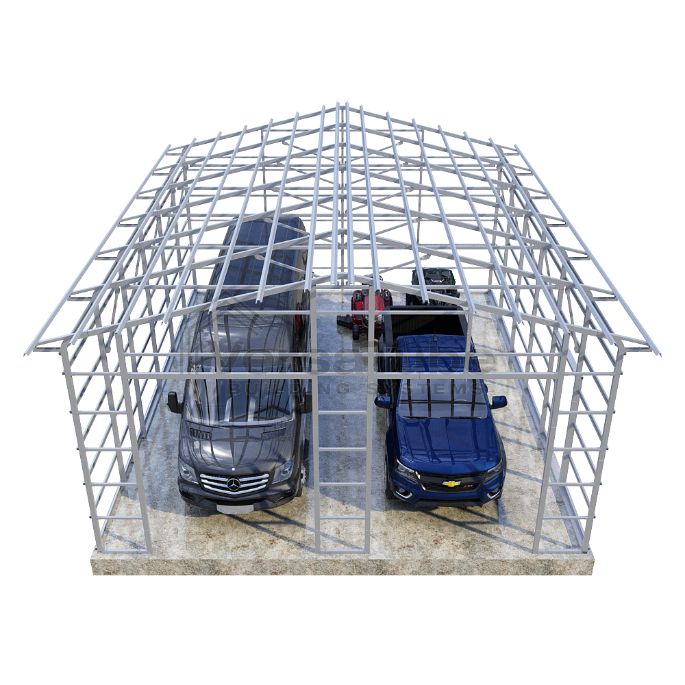 Summit Series DIY garage frame kit includes roof purlins and side girts for applying vertical sheet metal panels or other roofing or siding materials.
