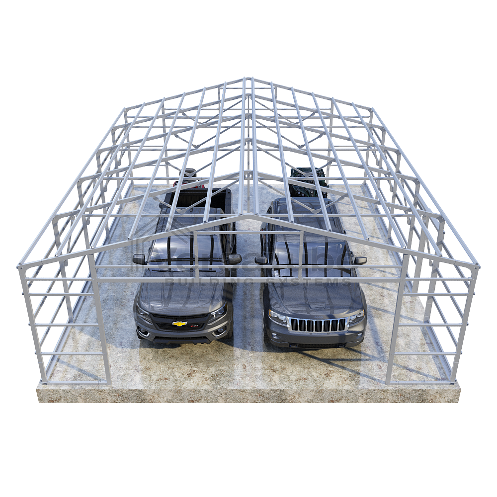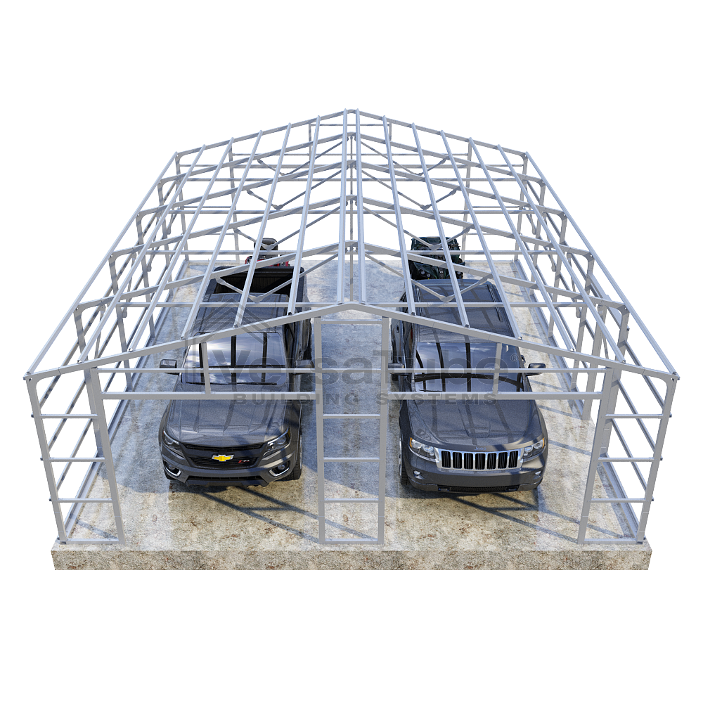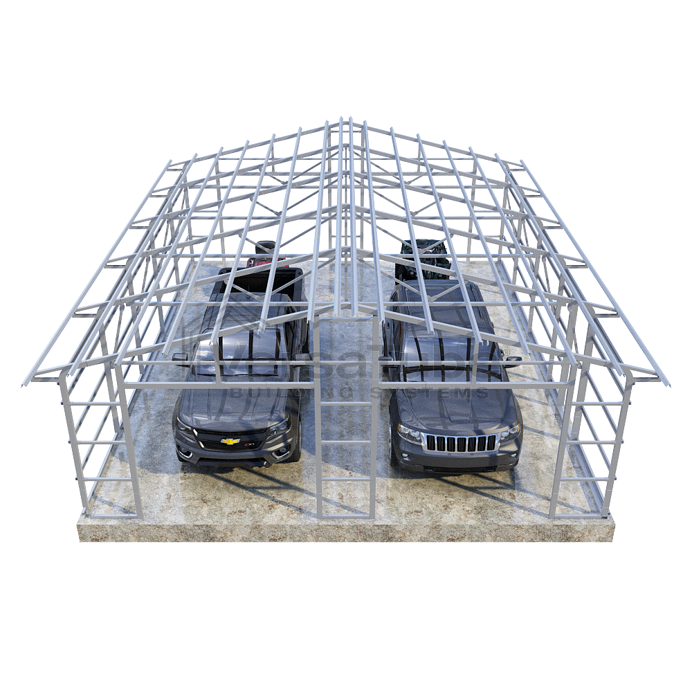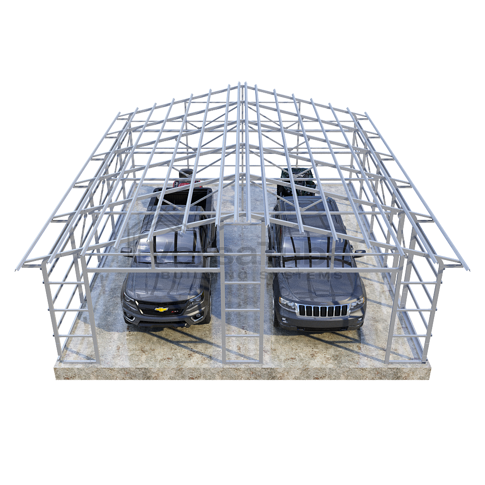 Summit Series DIY garage frame kit includes roof purlins and side girts for applying vertical sheet metal panels or other roofing or siding materials.
