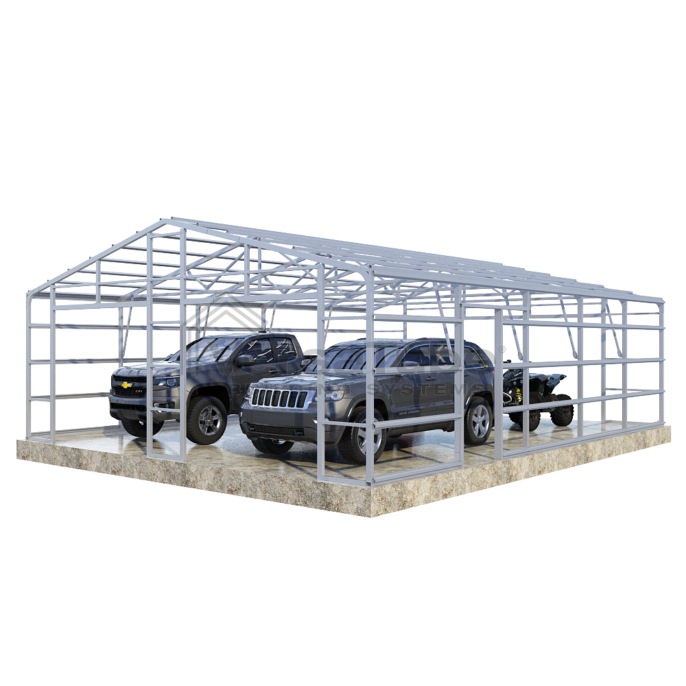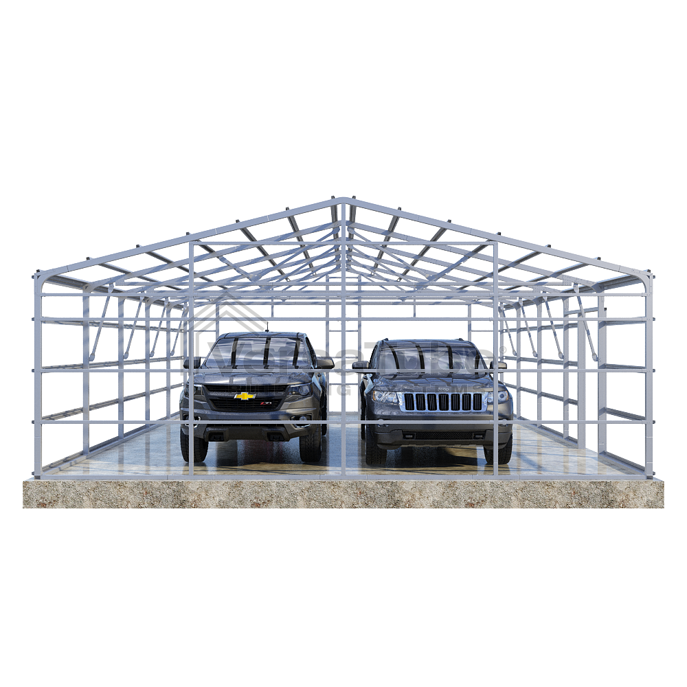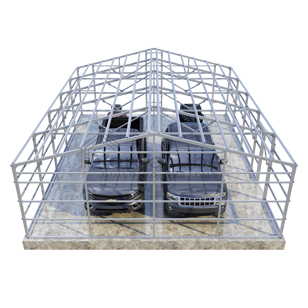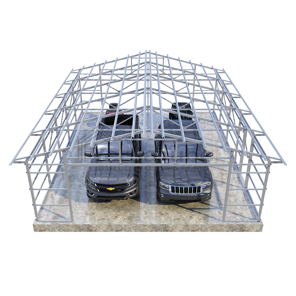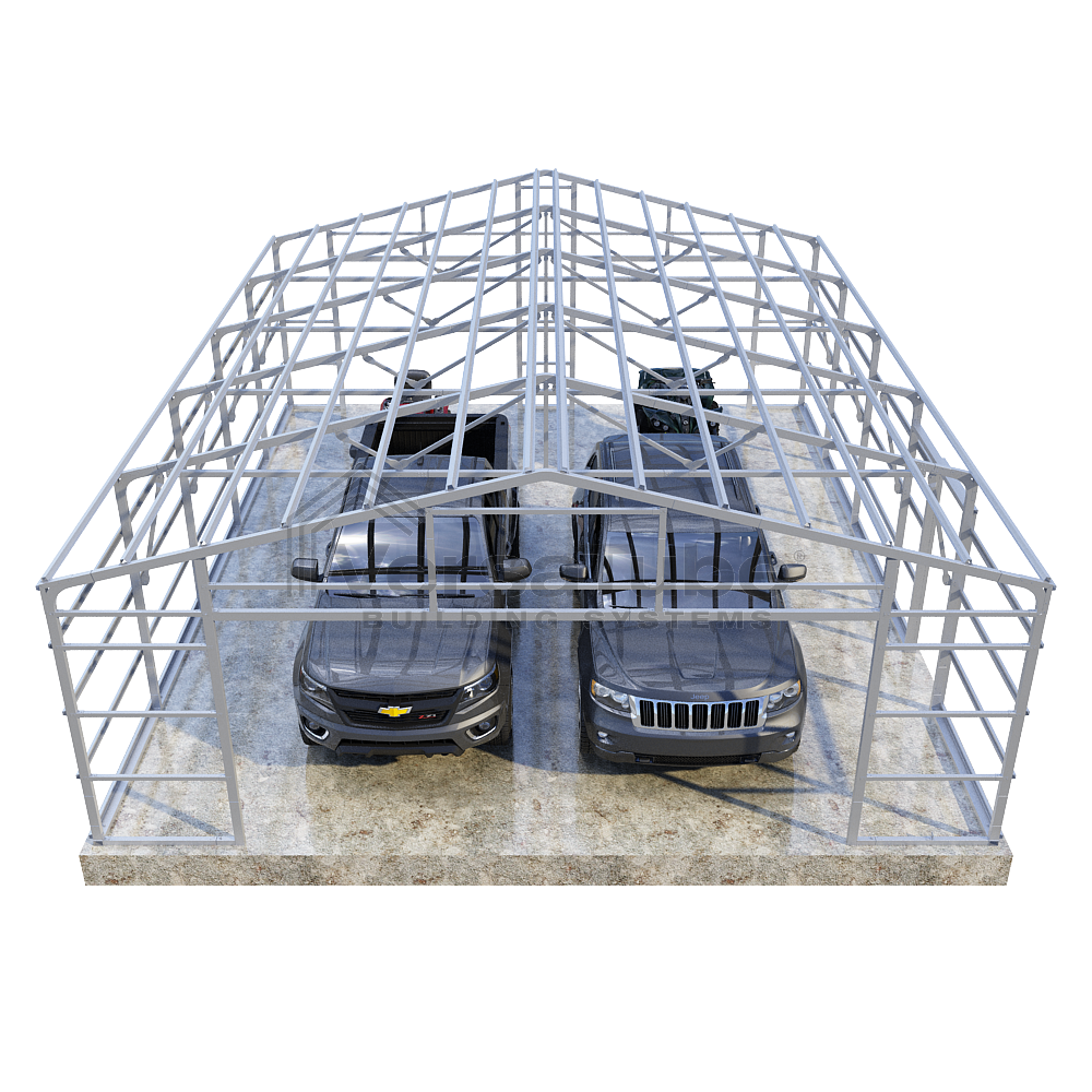 Summit Series DIY garage frame kit includes roof purlins and side girts for applying vertical sheet metal panels or other roofing or siding materials.