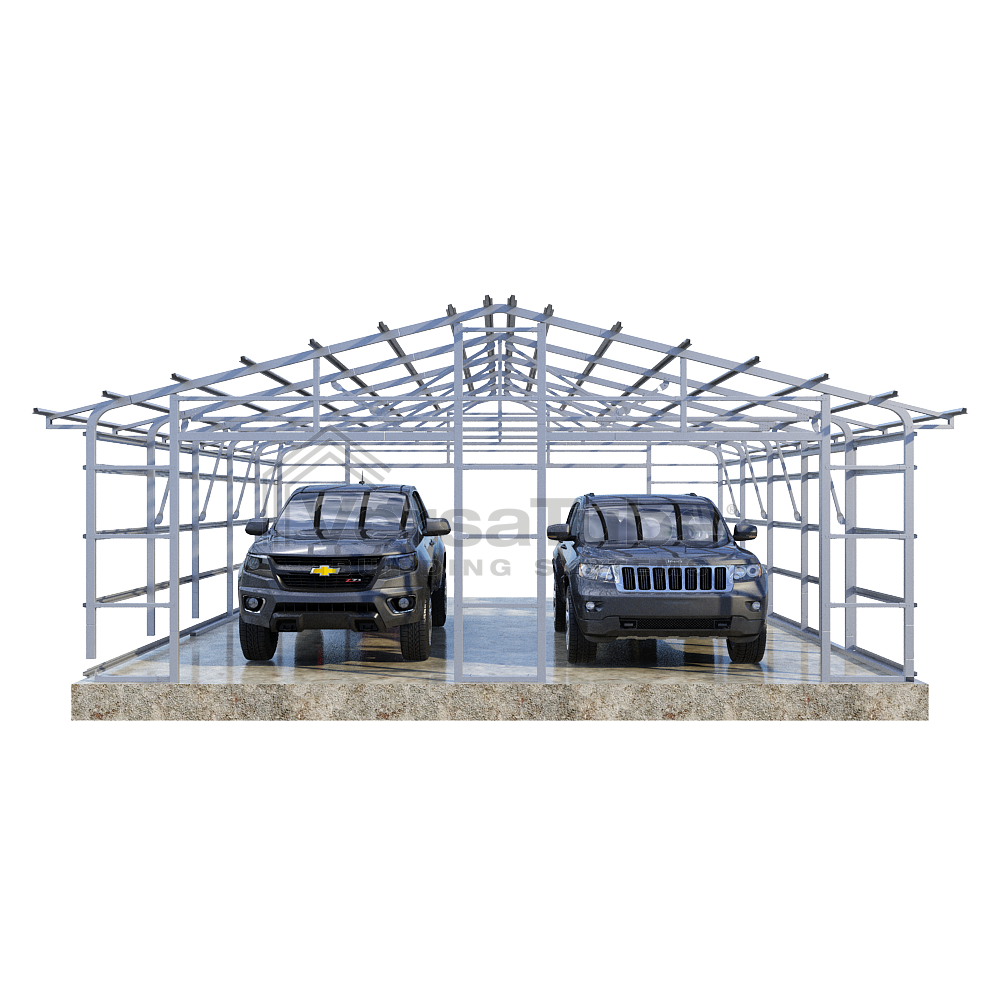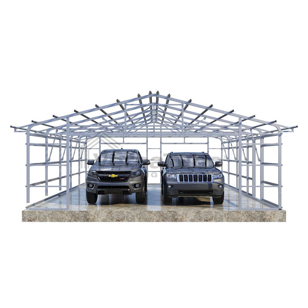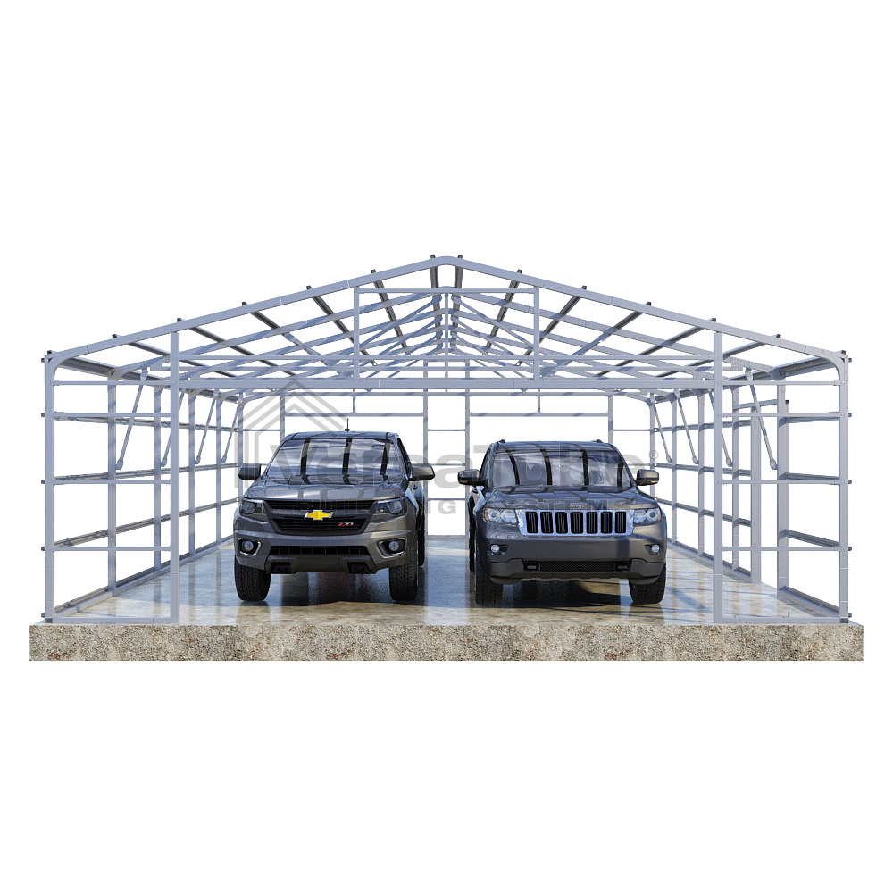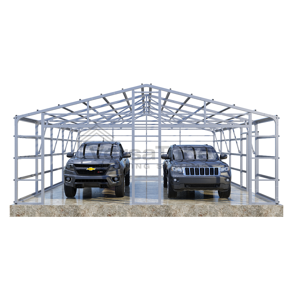 Summit Series DIY garage frame kit includes roof purlins and side girts for applying vertical sheet metal panels or other roofing or siding materials.