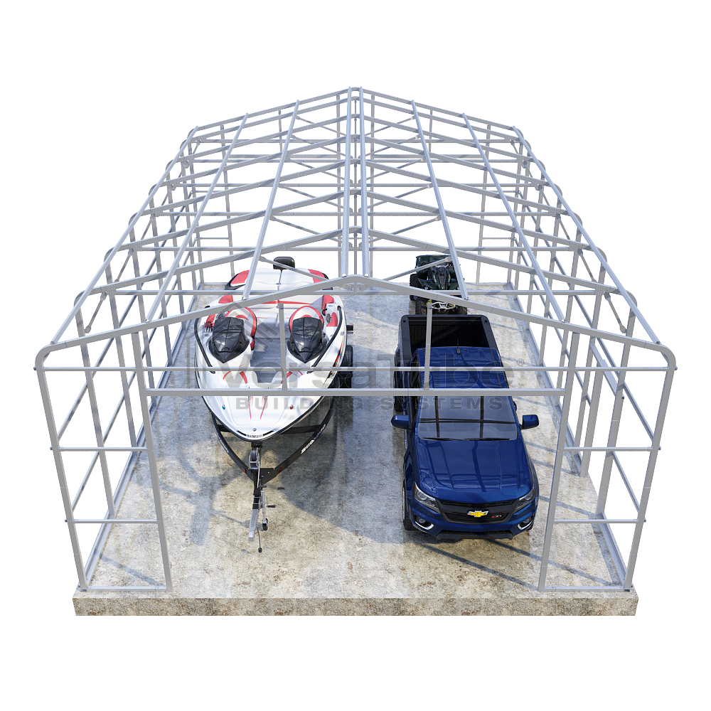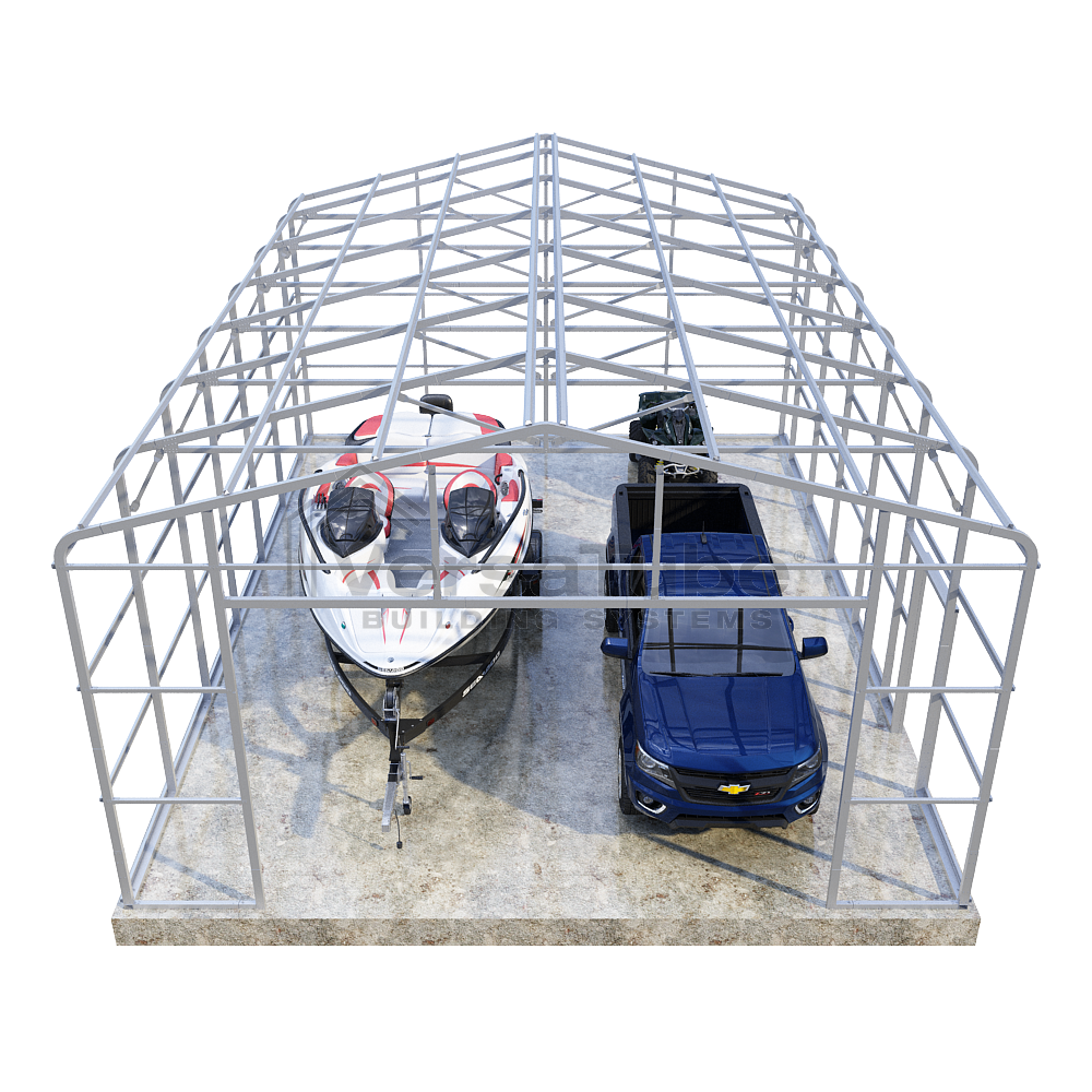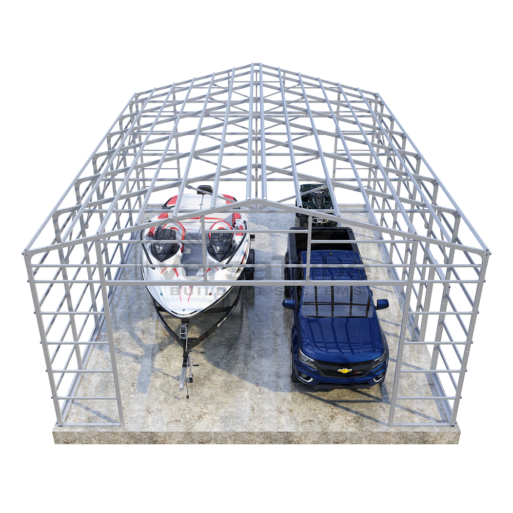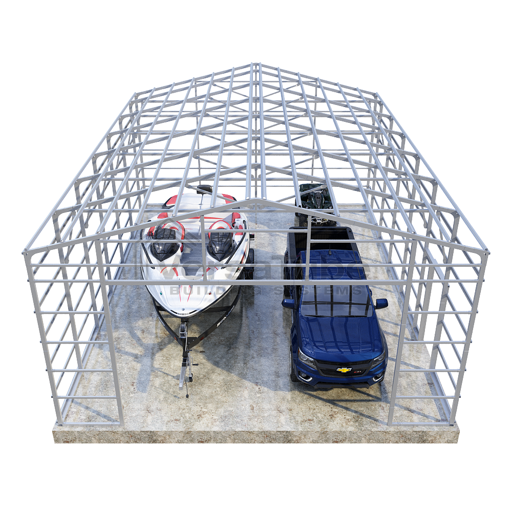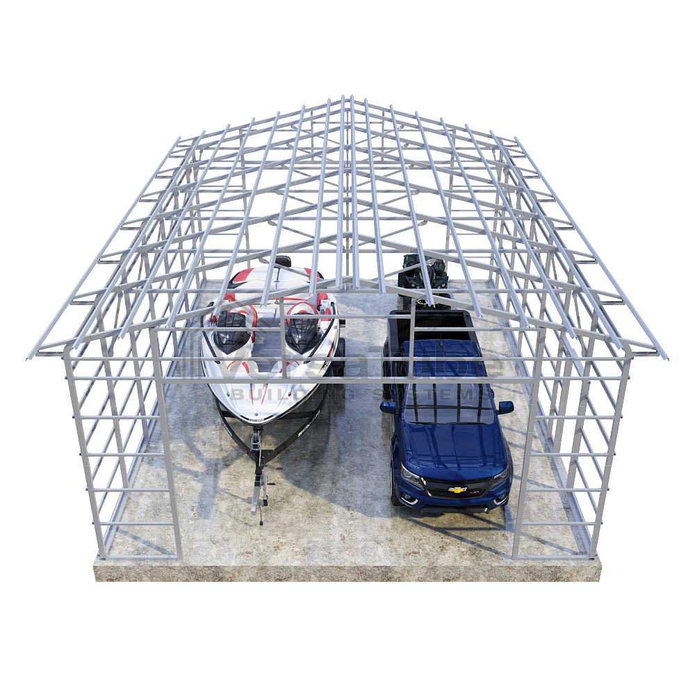 Summit Series DIY garage frame kit includes roof purlins and side girts for applying vertical sheet metal panels or other roofing or siding materials.