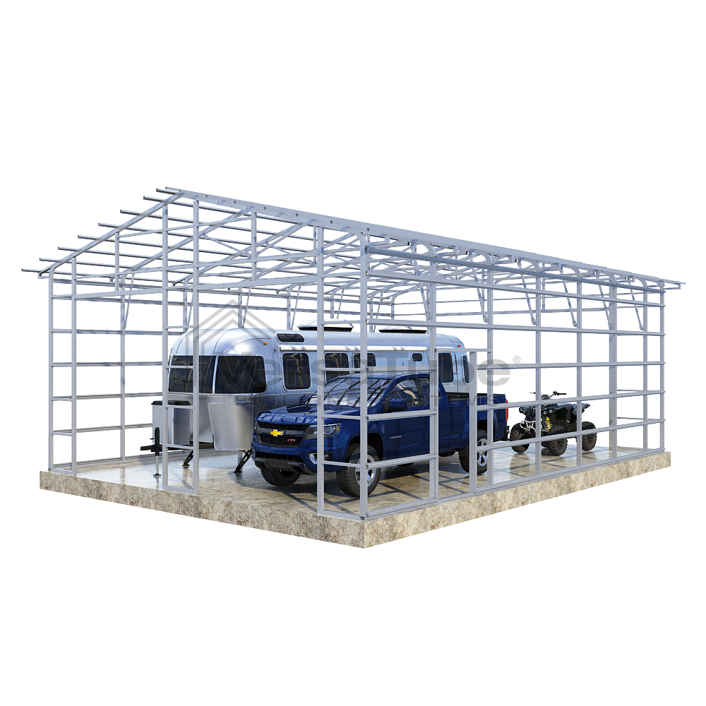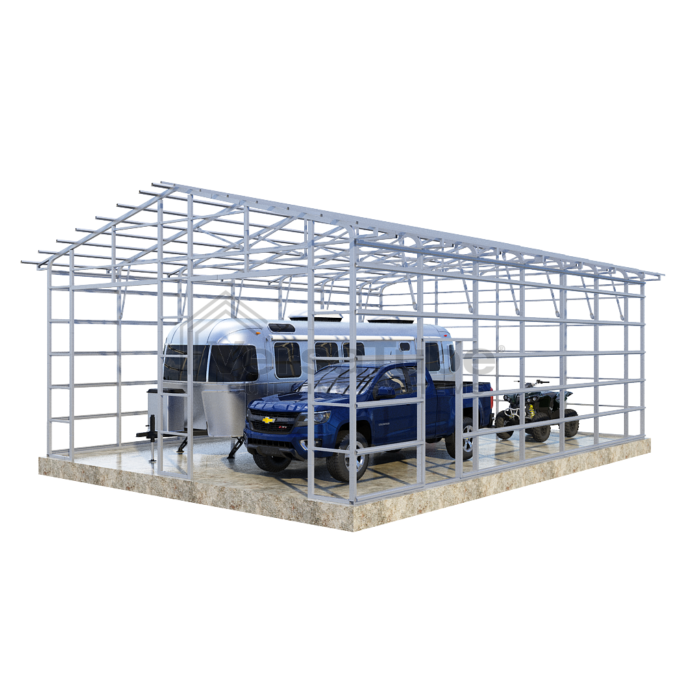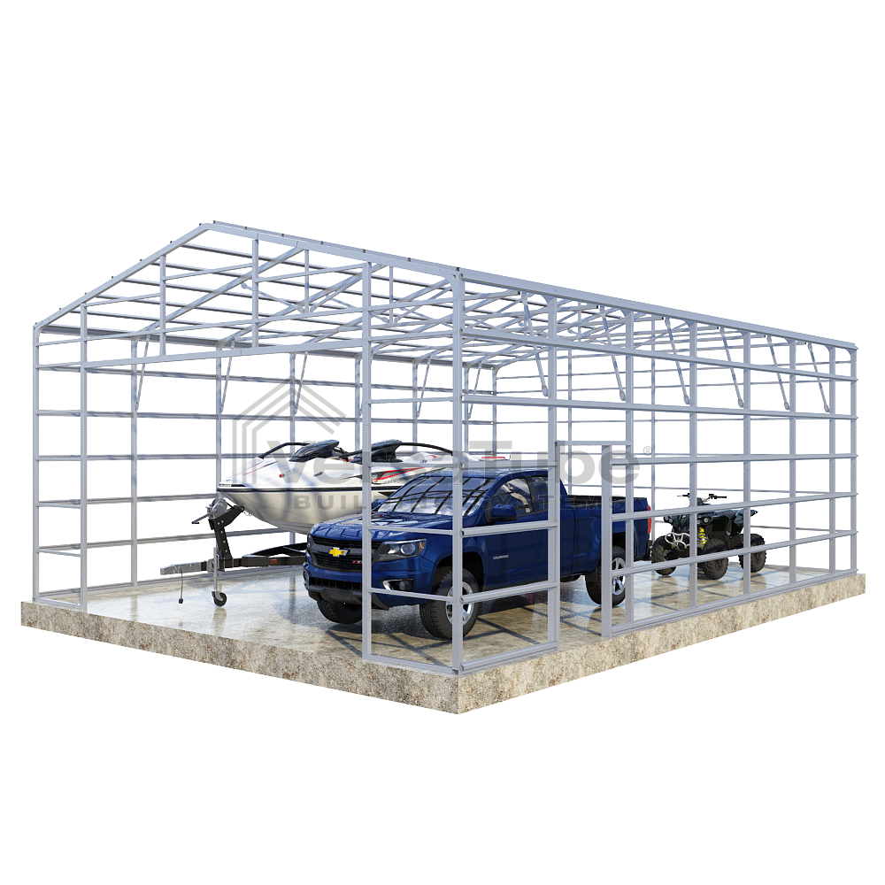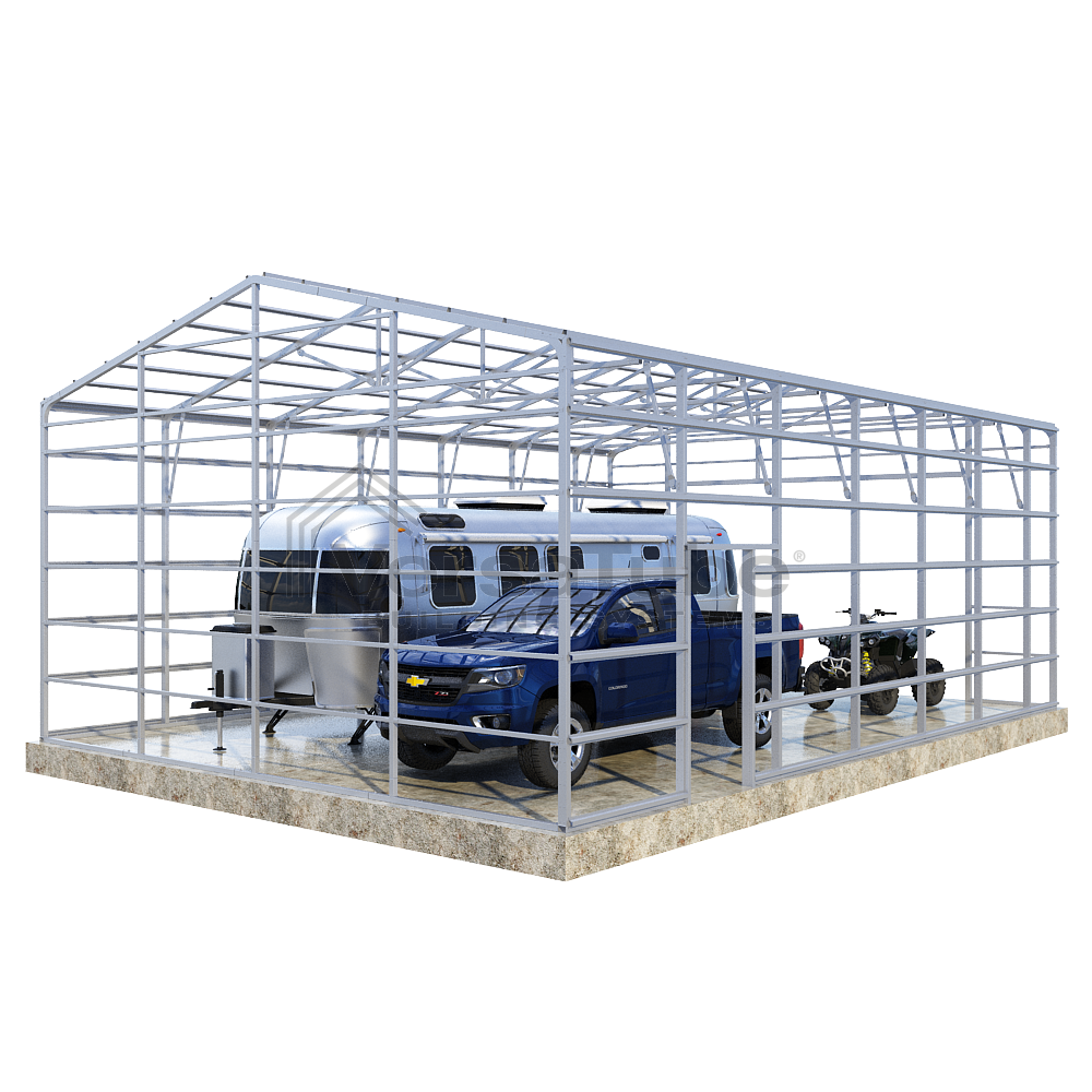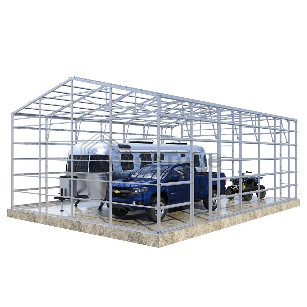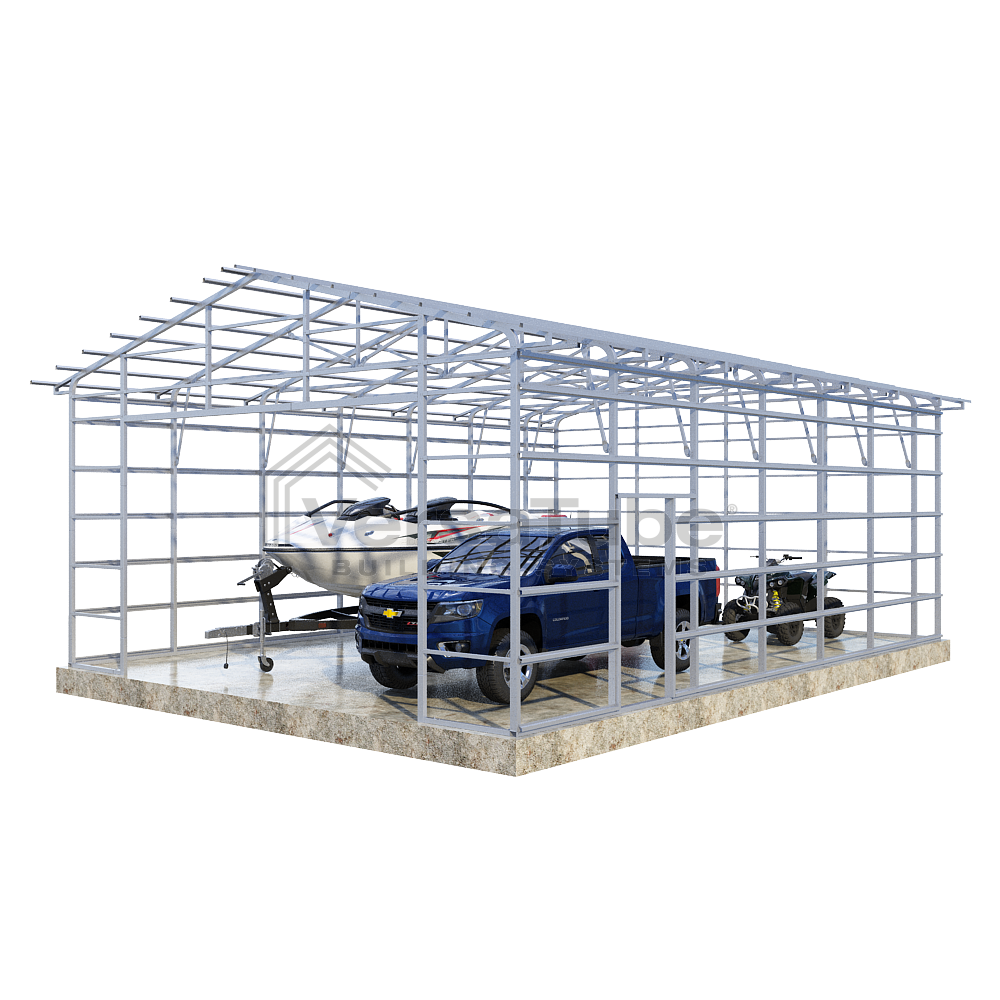 Summit Series DIY garage frame kit includes roof purlins and side girts for applying vertical sheet metal panels or other roofing or siding materials.