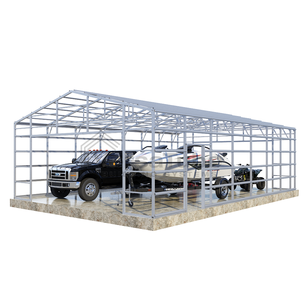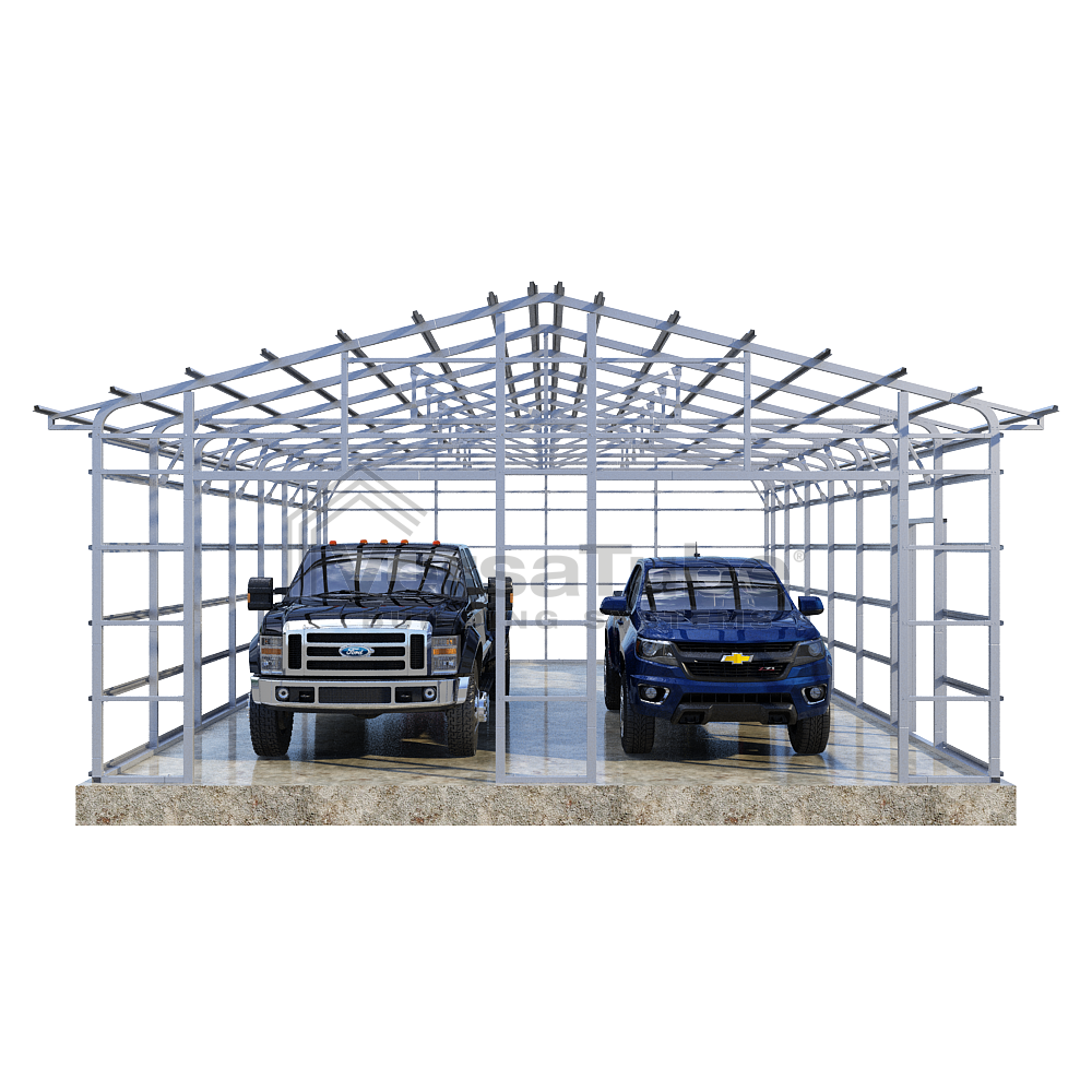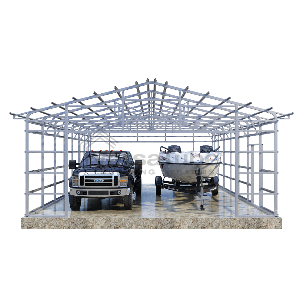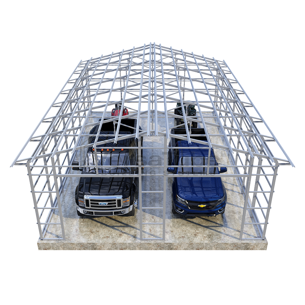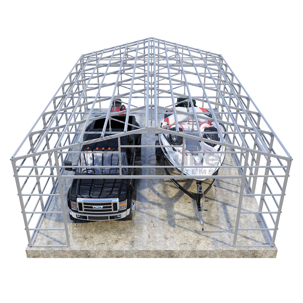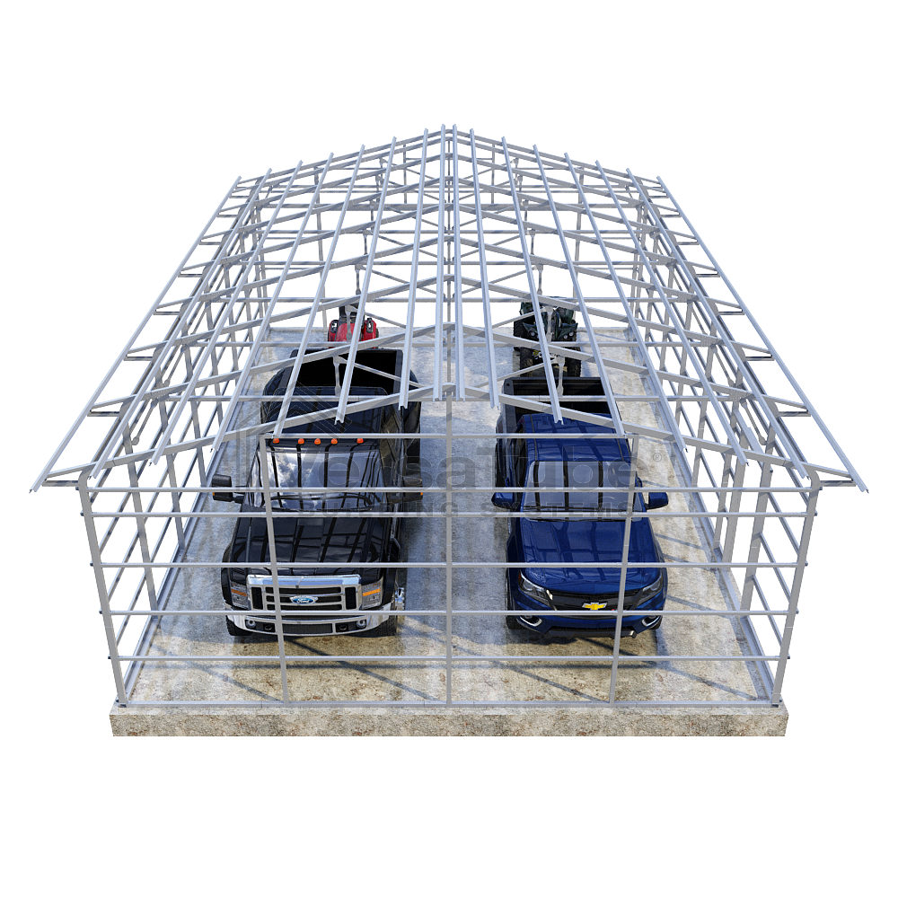 Summit Series DIY garage frame kit includes roof purlins and side girts for applying vertical sheet metal panels or other roofing or siding materials.
