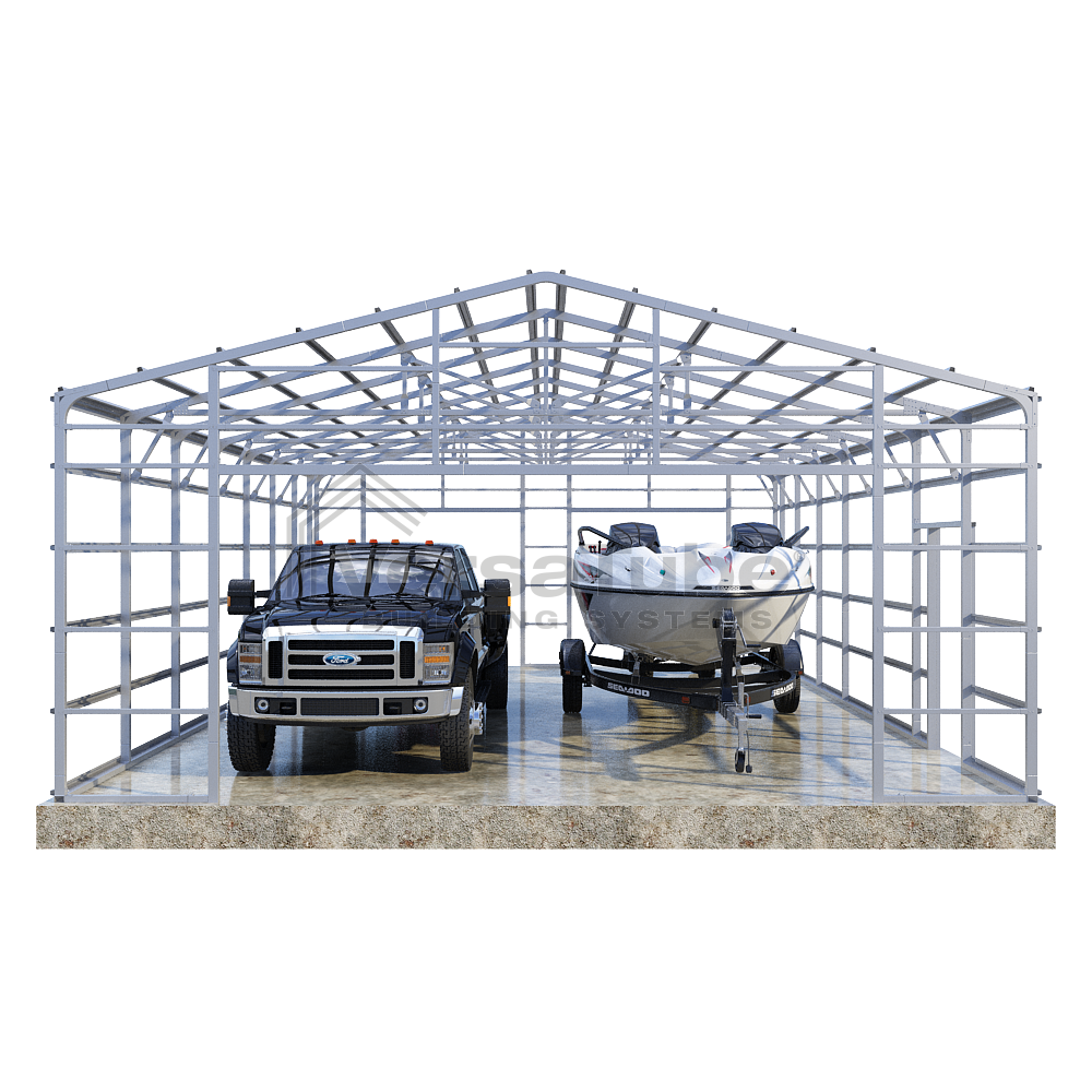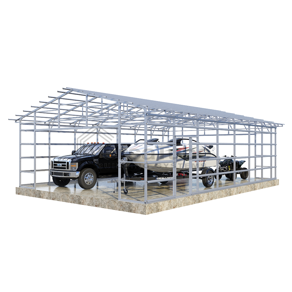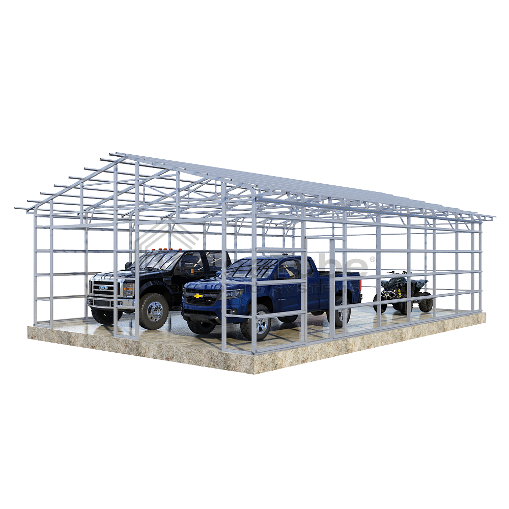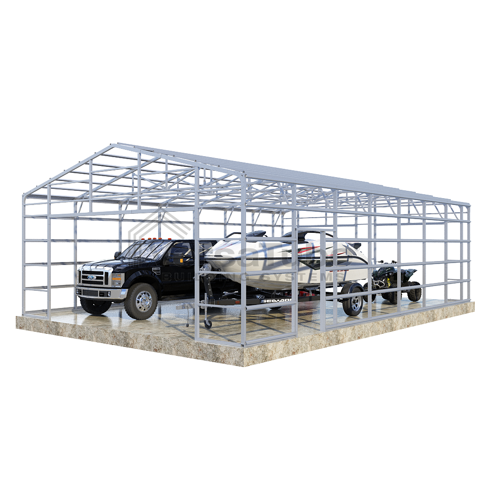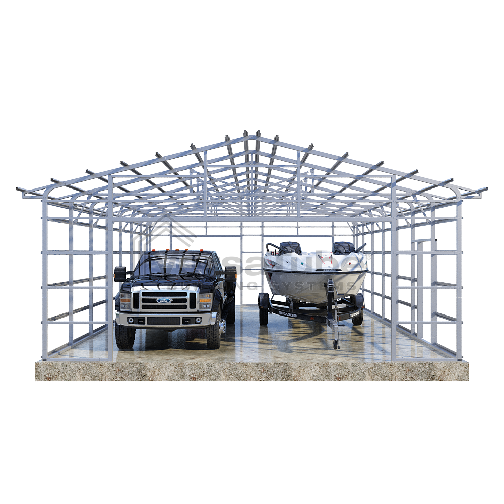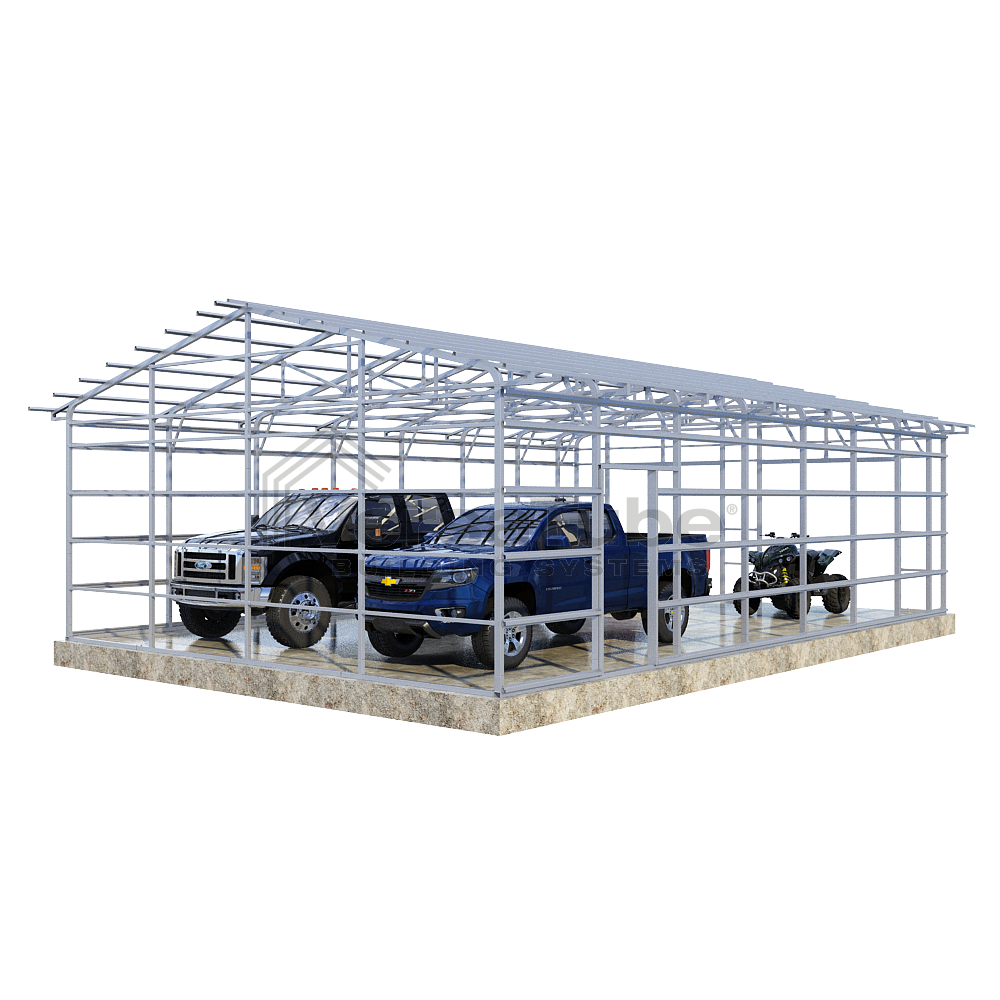 Summit Series DIY garage frame kit includes roof purlins and side girts for applying vertical sheet metal panels or other roofing or siding materials.