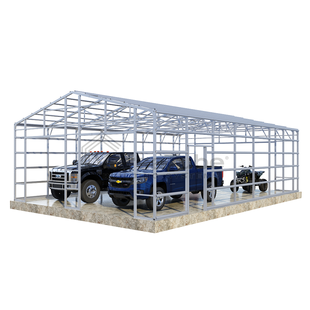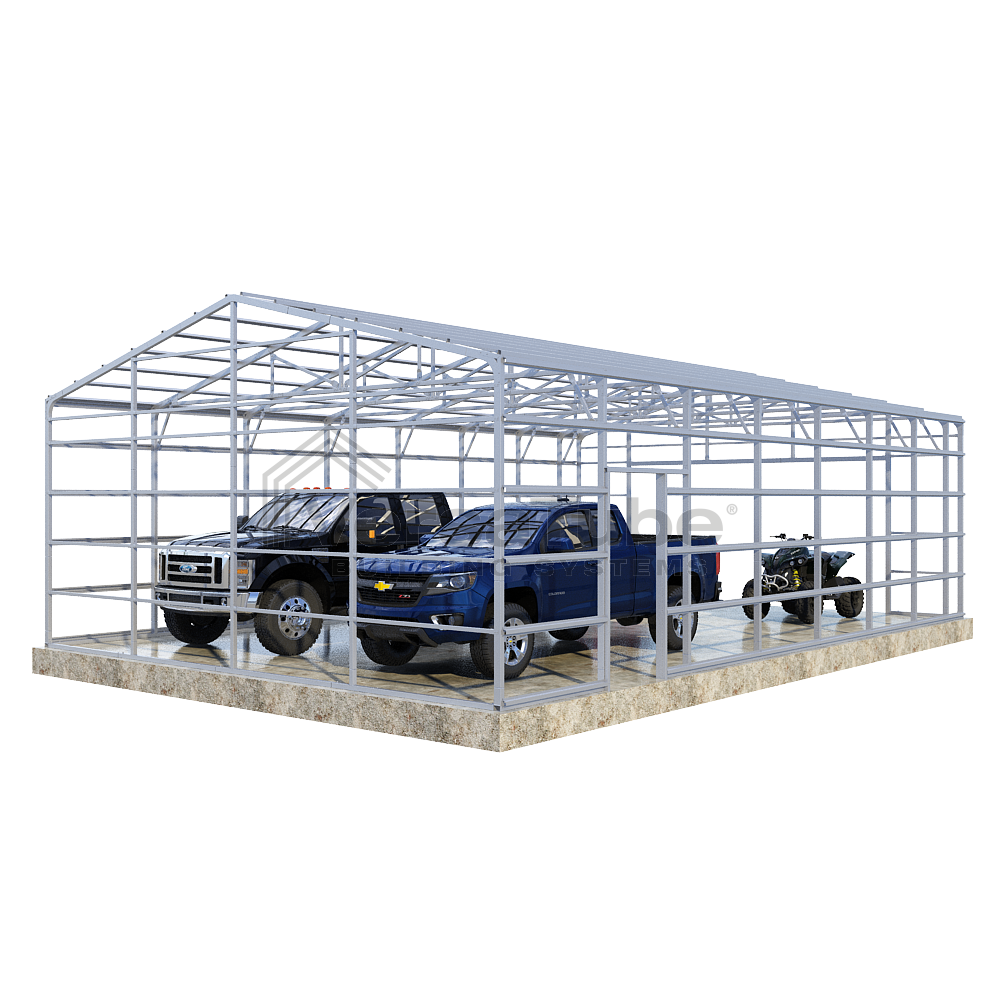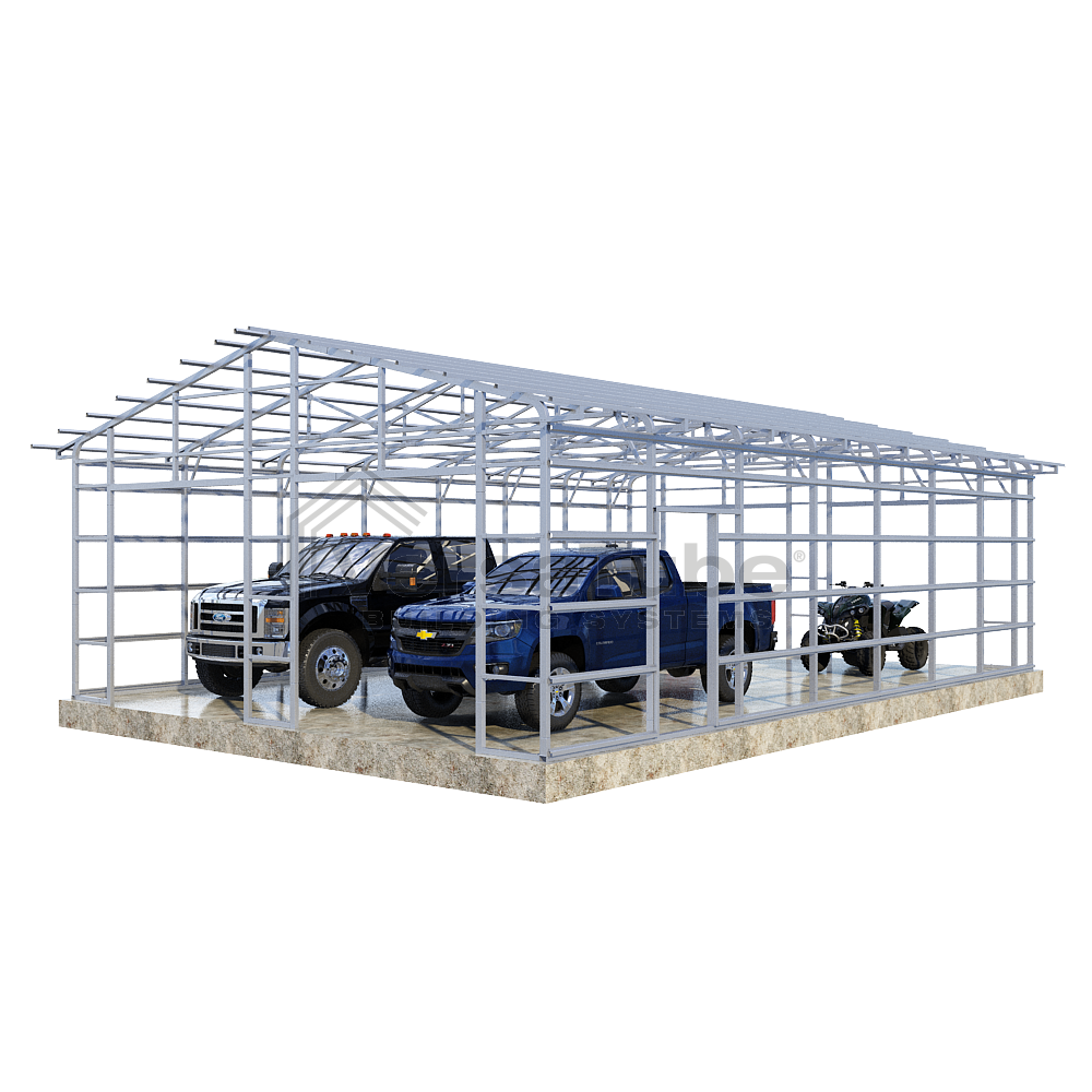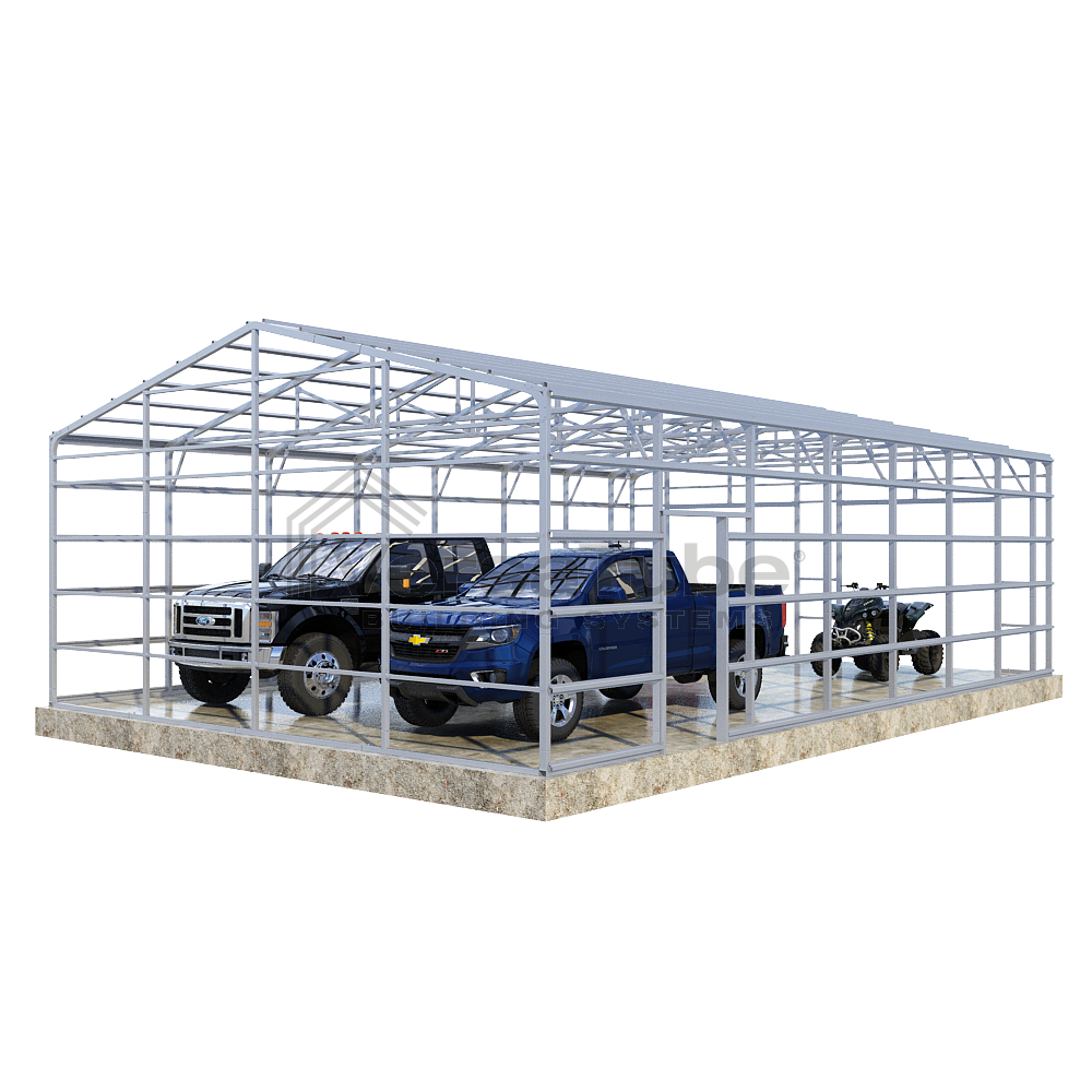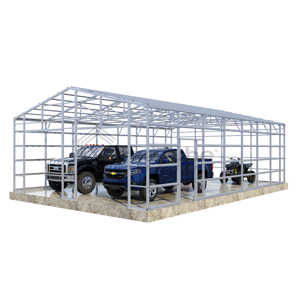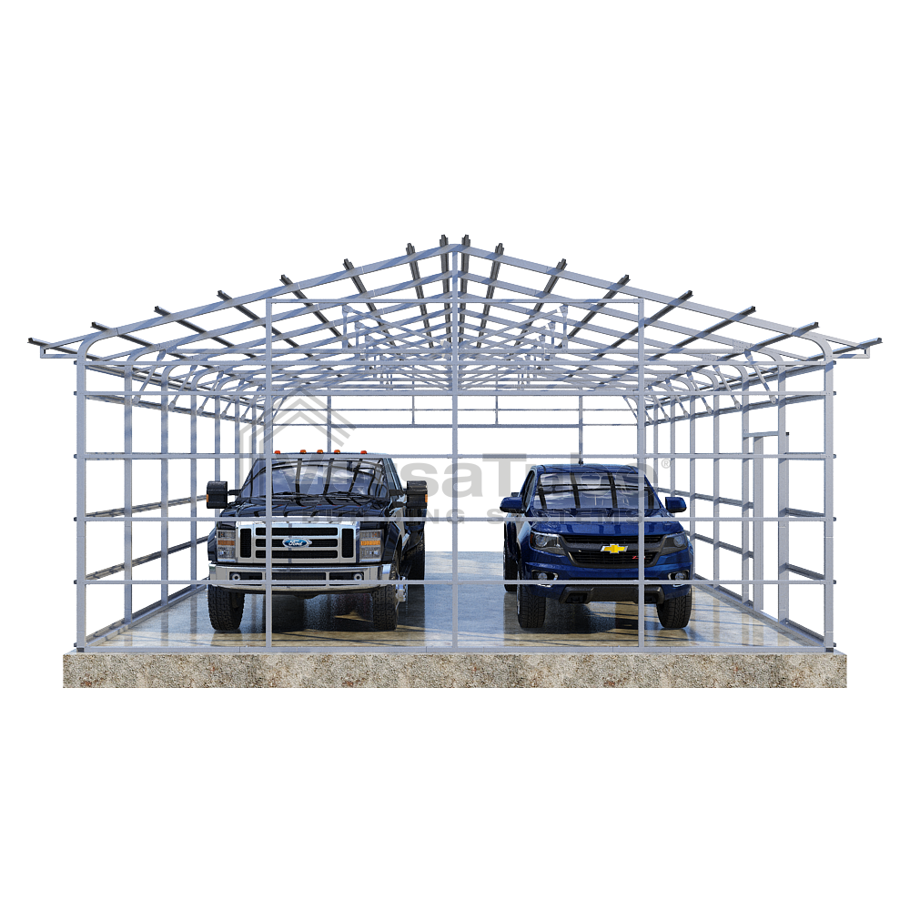 Summit Series DIY garage frame kit includes roof purlins and side girts for applying vertical sheet metal panels or other roofing or siding materials.