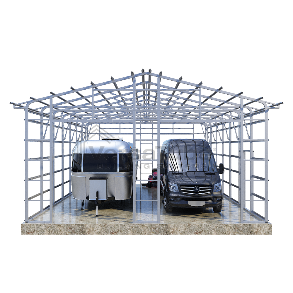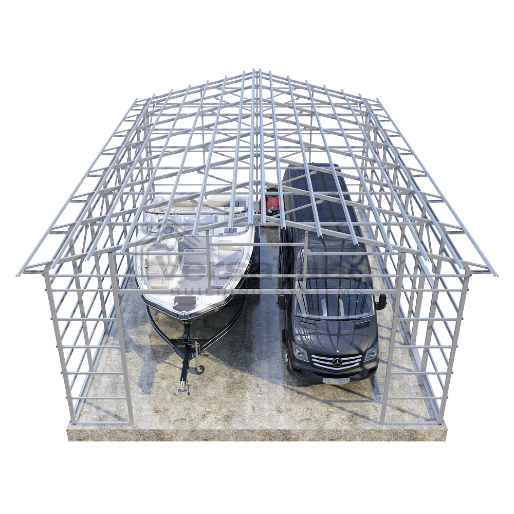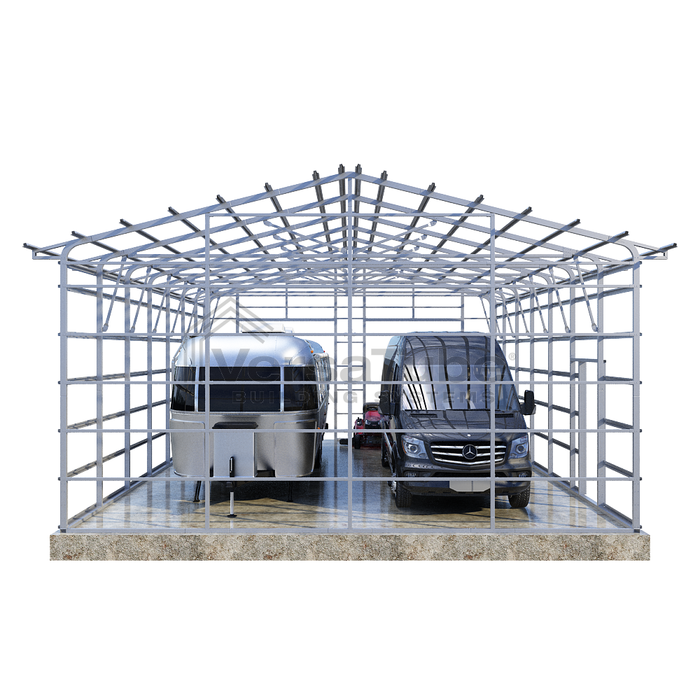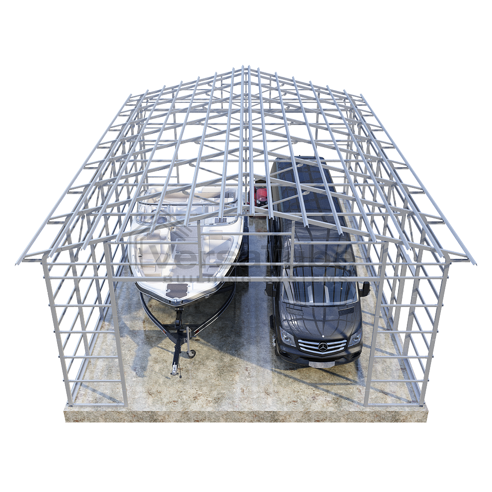 Summit Series DIY garage frame kit includes roof purlins and side girts for applying vertical sheet metal panels or other roofing or siding materials.