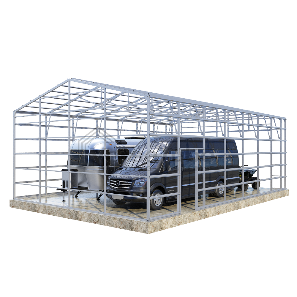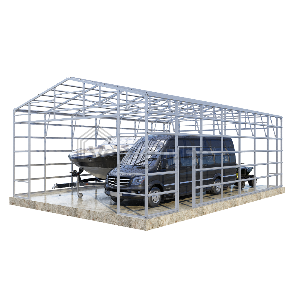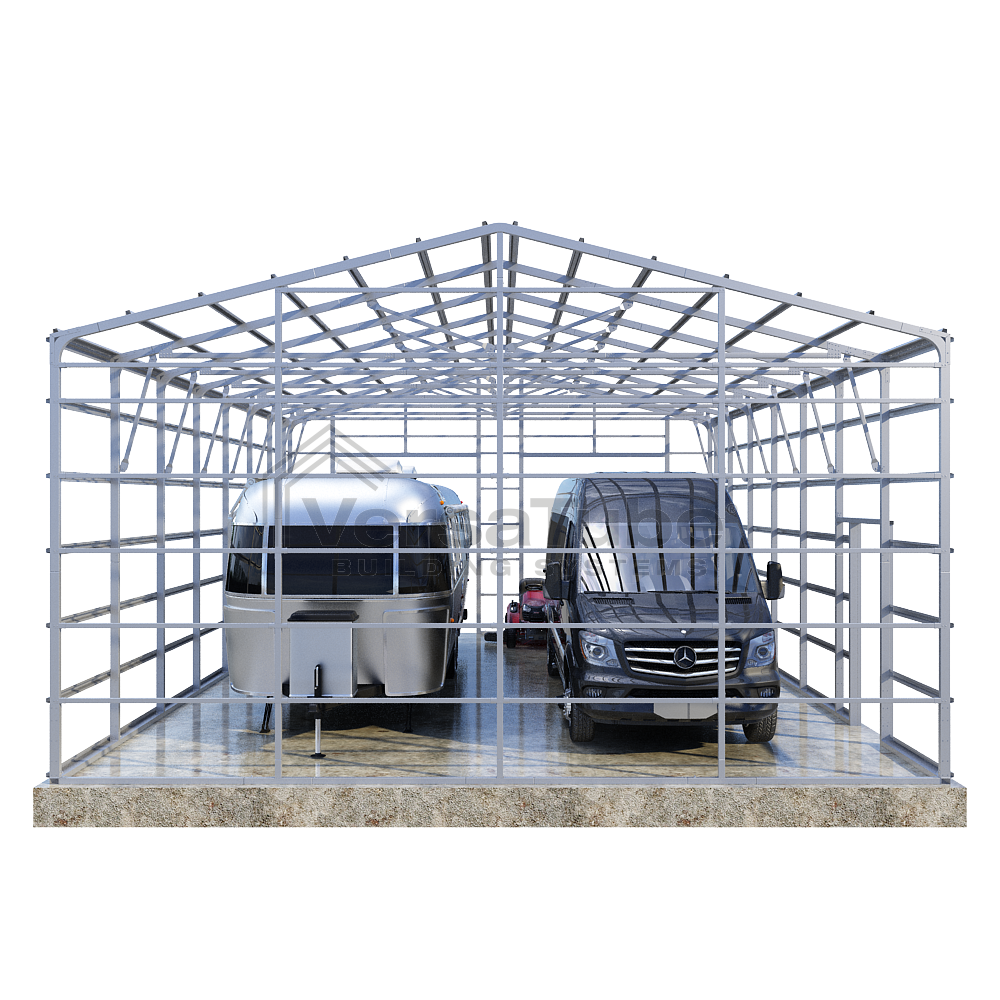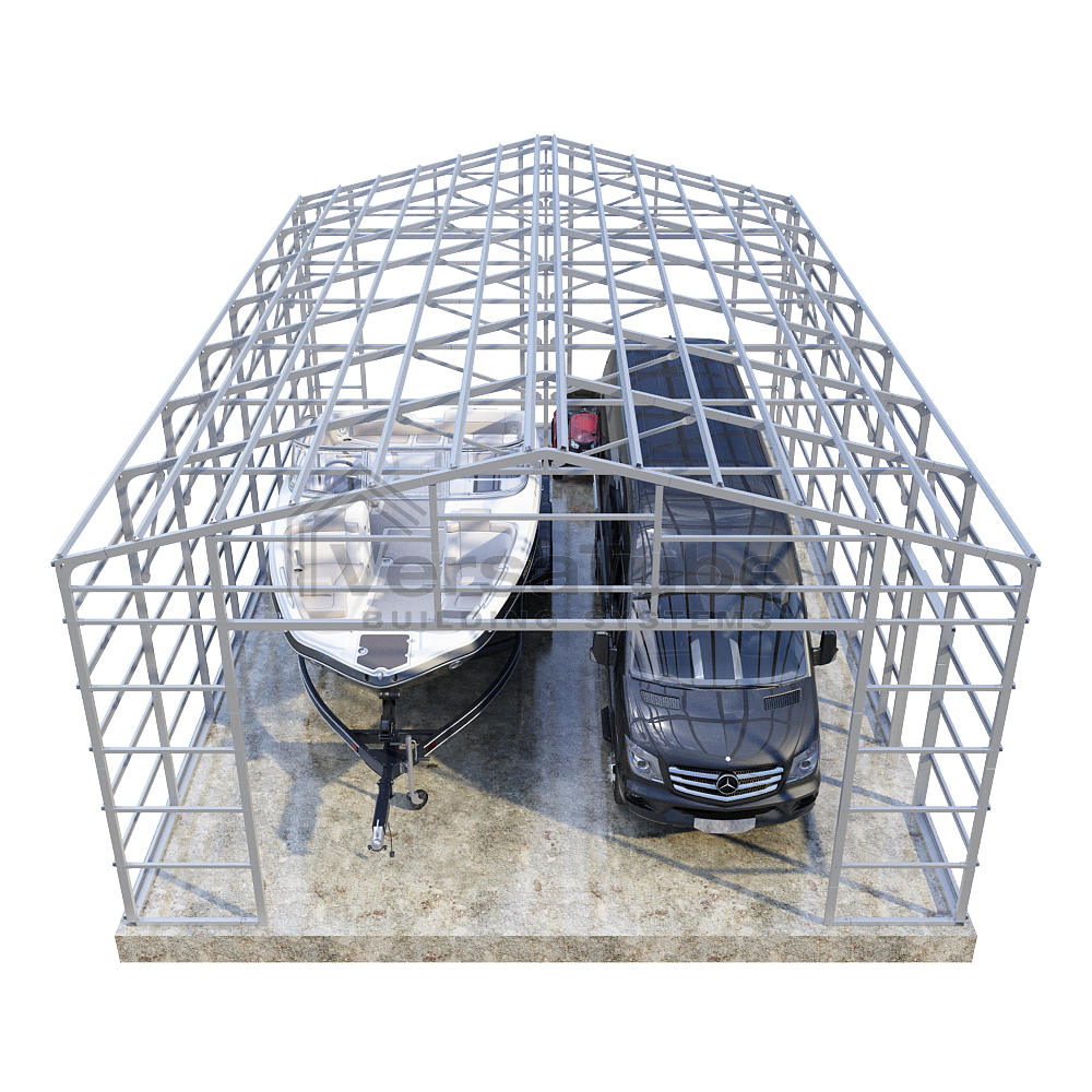 Summit Series DIY garage frame kit includes roof purlins and side girts for applying vertical sheet metal panels or other roofing or siding materials.