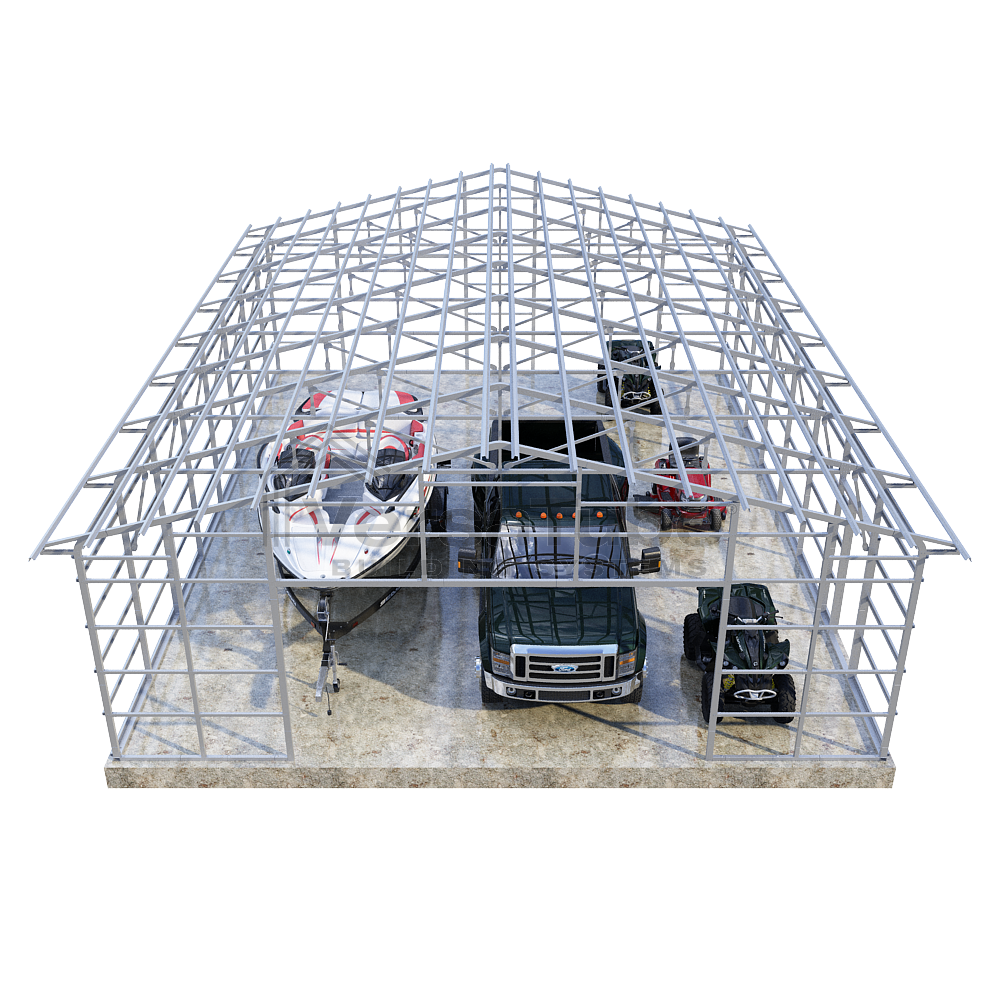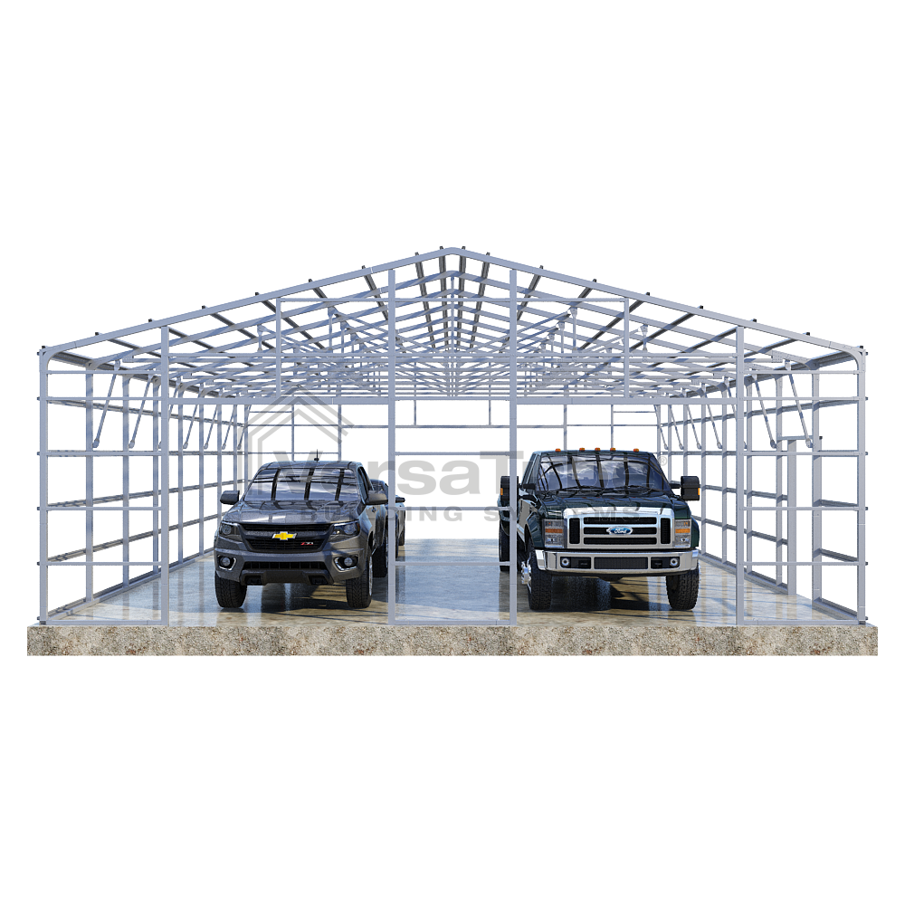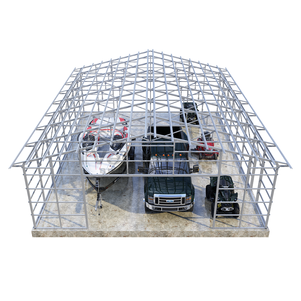 Summit Series DIY garage frame kit includes roof purlins and side girts for applying vertical sheet metal panels or other roofing or siding materials.