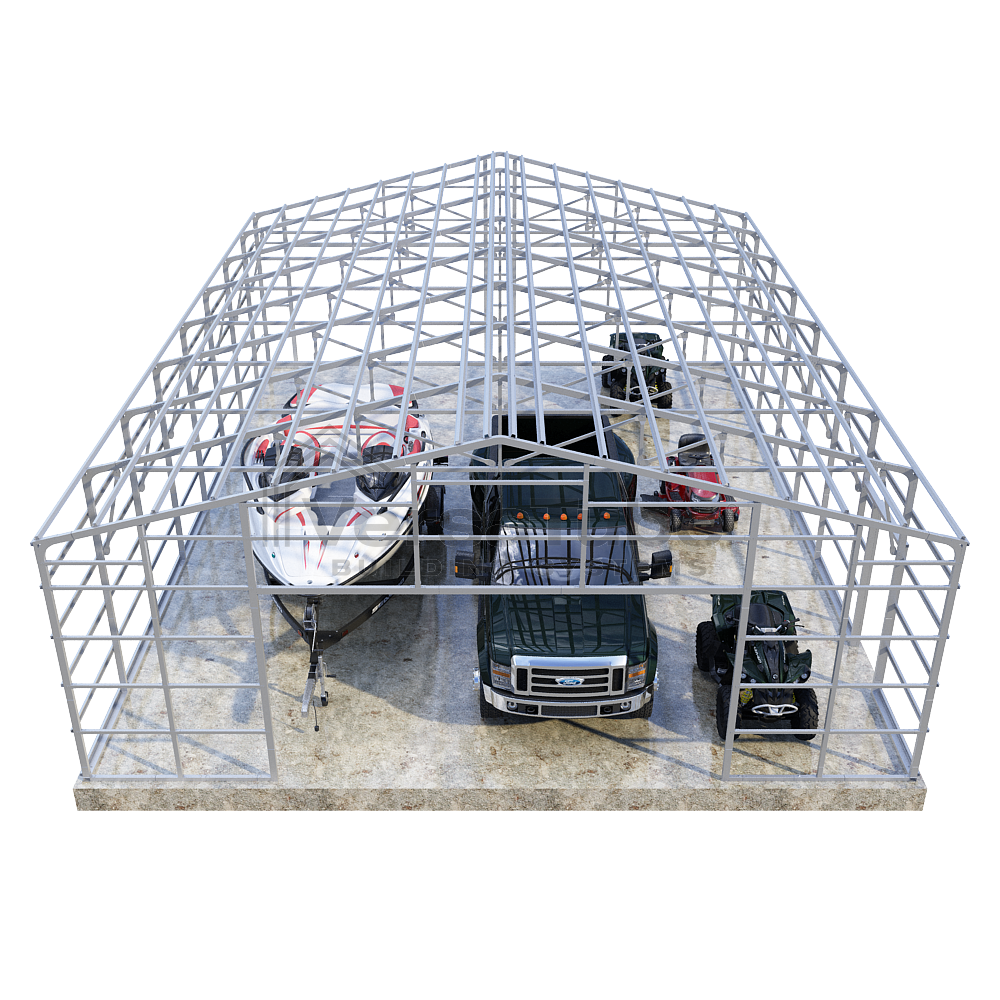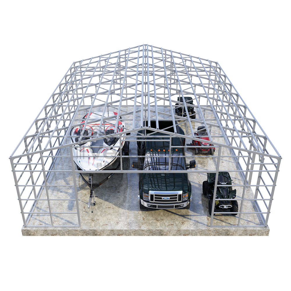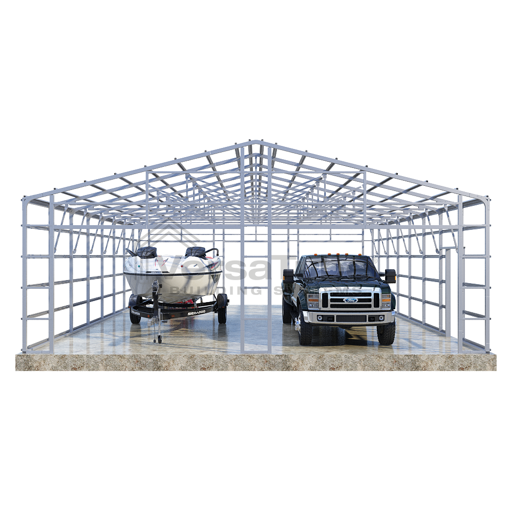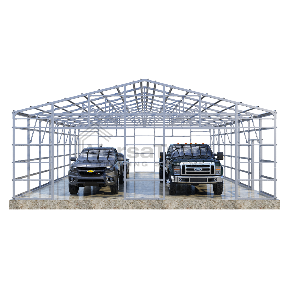 Summit Series DIY garage frame kit includes roof purlins and side girts for applying vertical sheet metal panels or other roofing or siding materials.