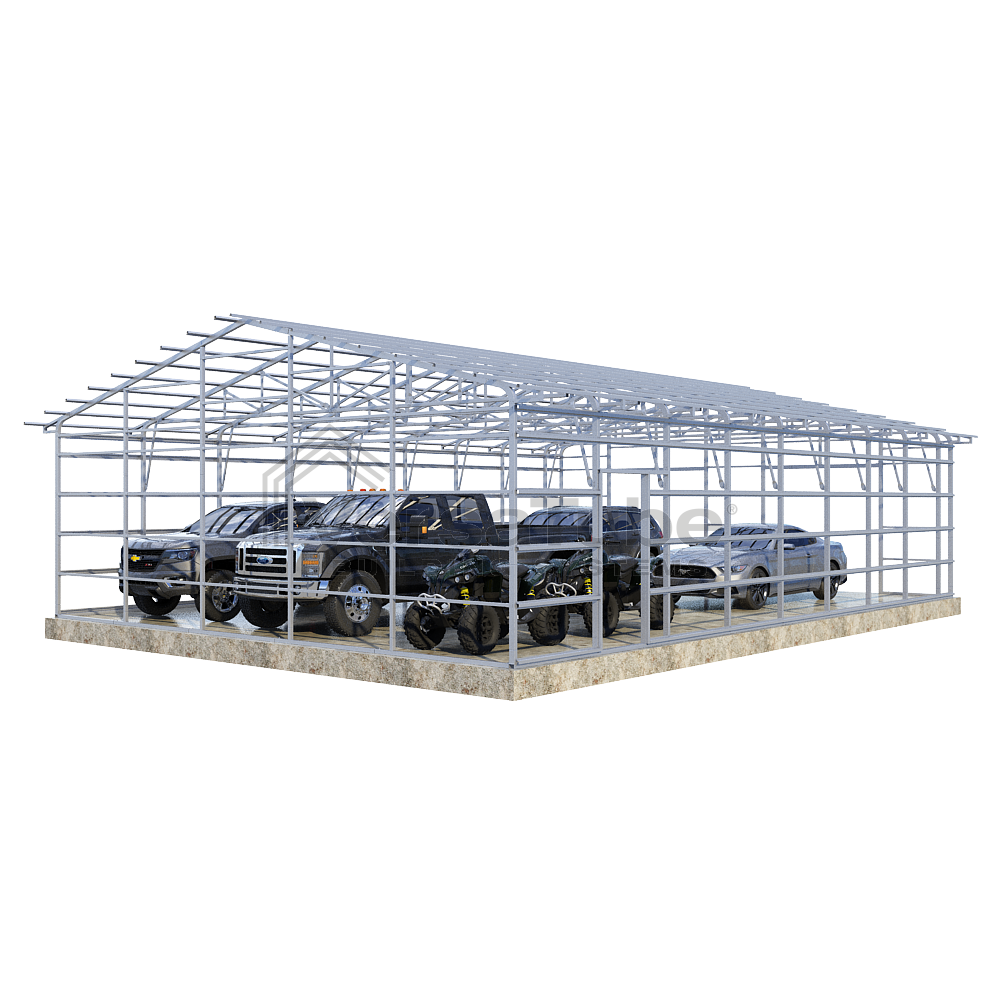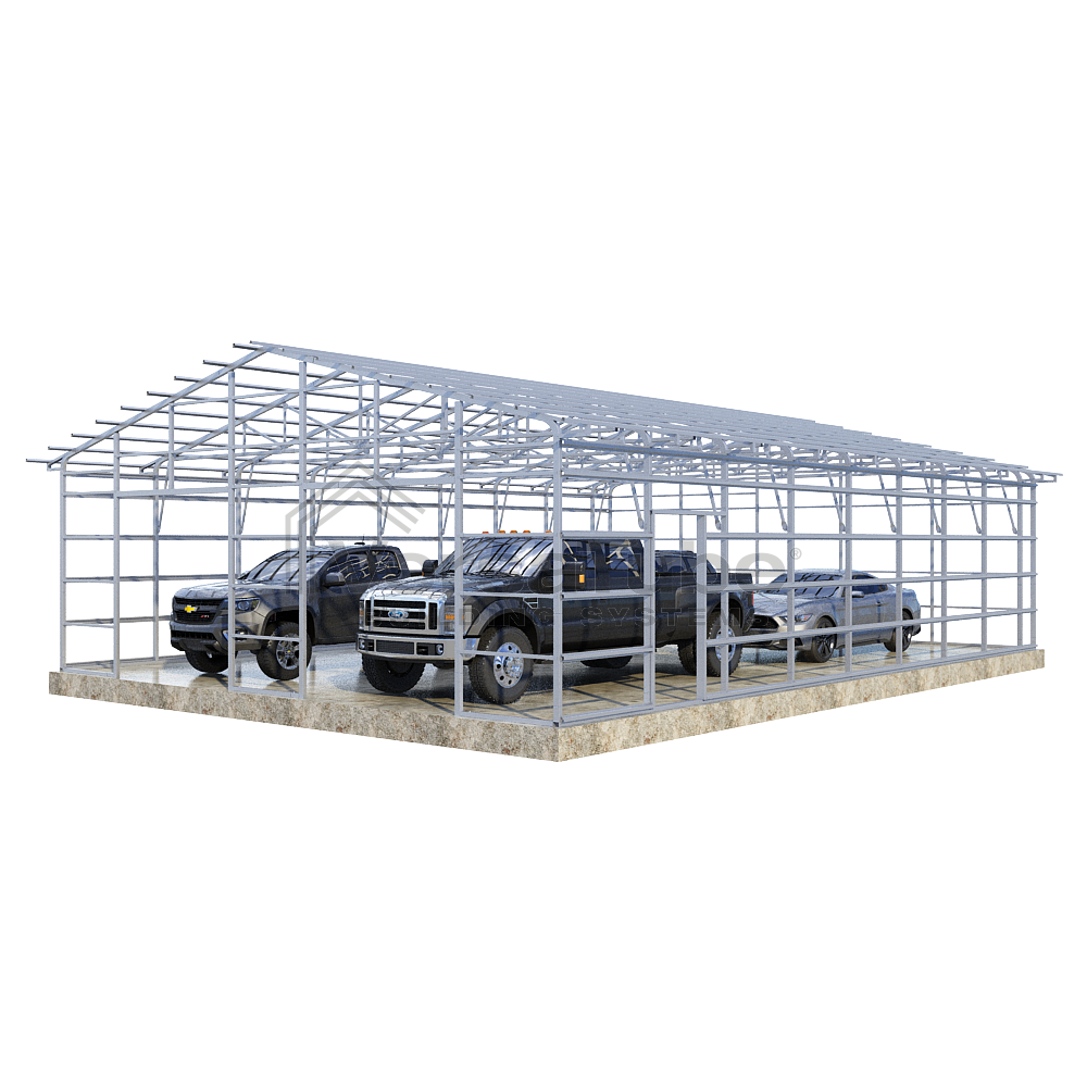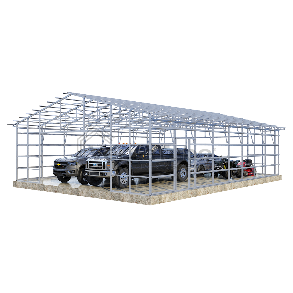 Summit Series DIY garage frame kit includes roof purlins and side girts for applying vertical sheet metal panels or other roofing or siding materials.