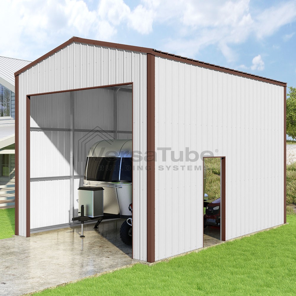 Summit Series DIY garage kit features vertical sheet metal roof and siding panels for a consistent look.