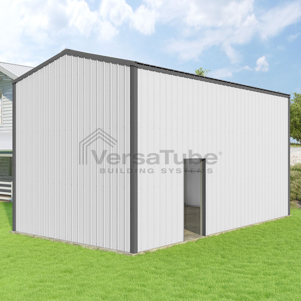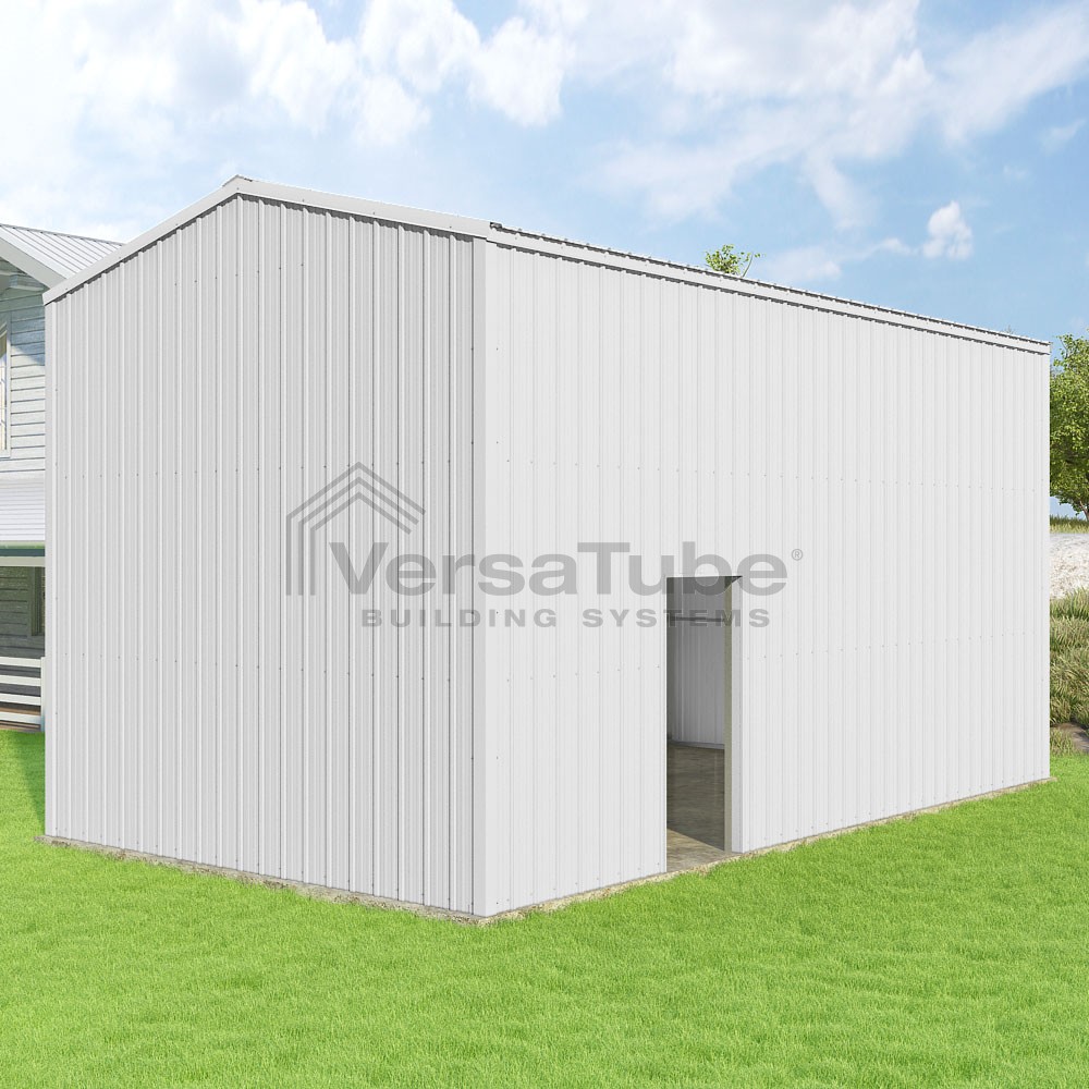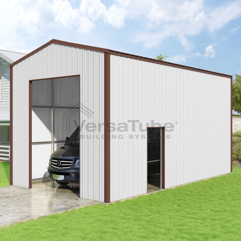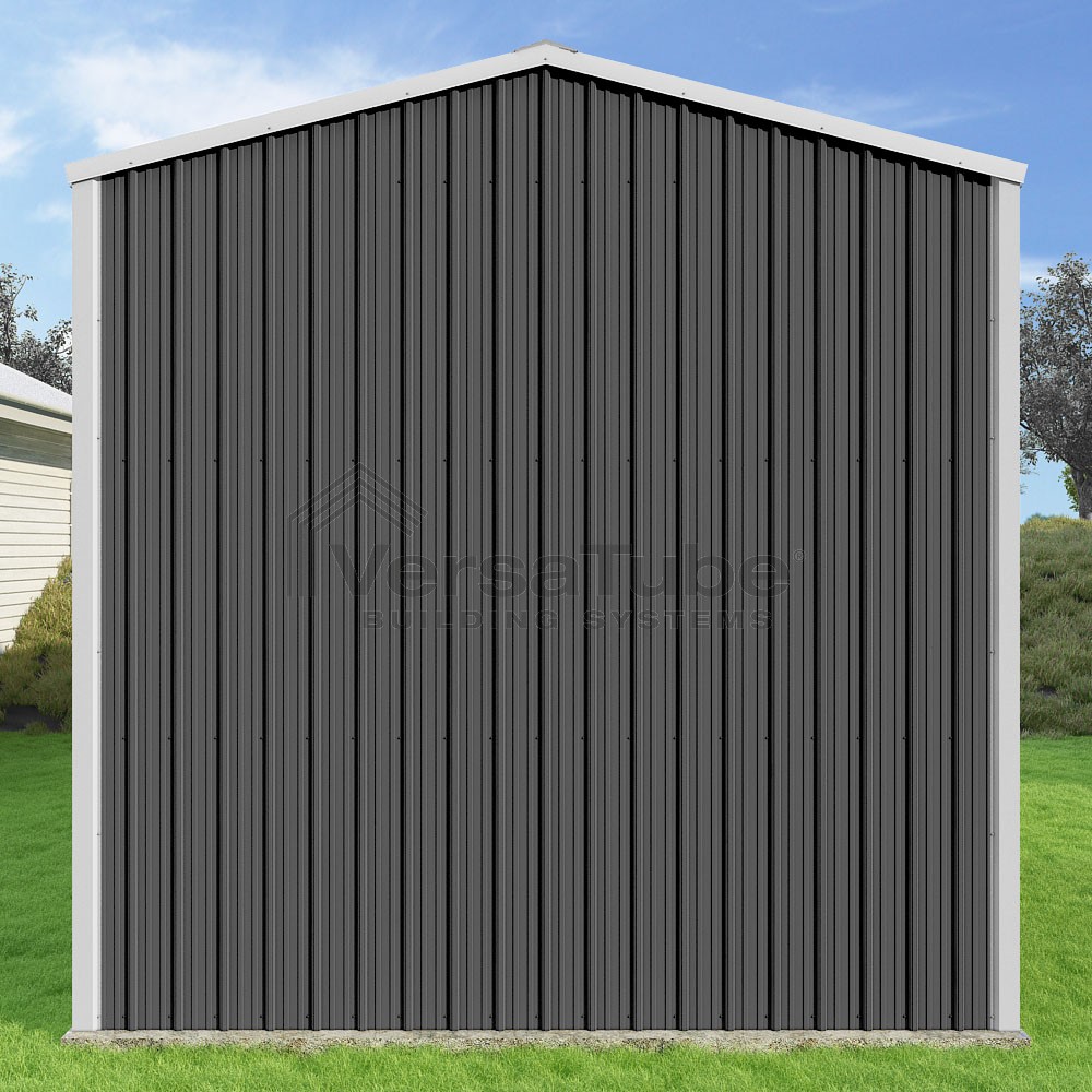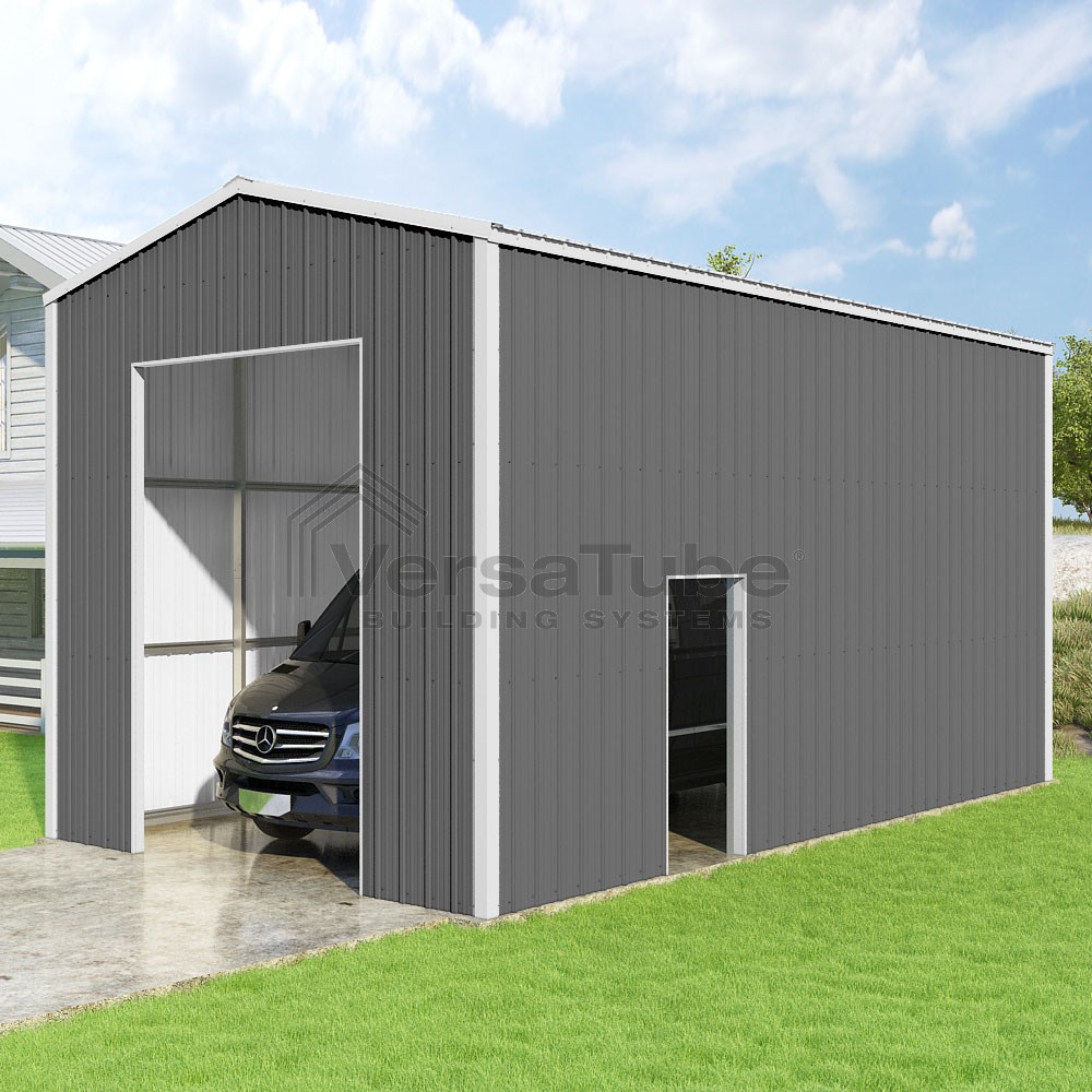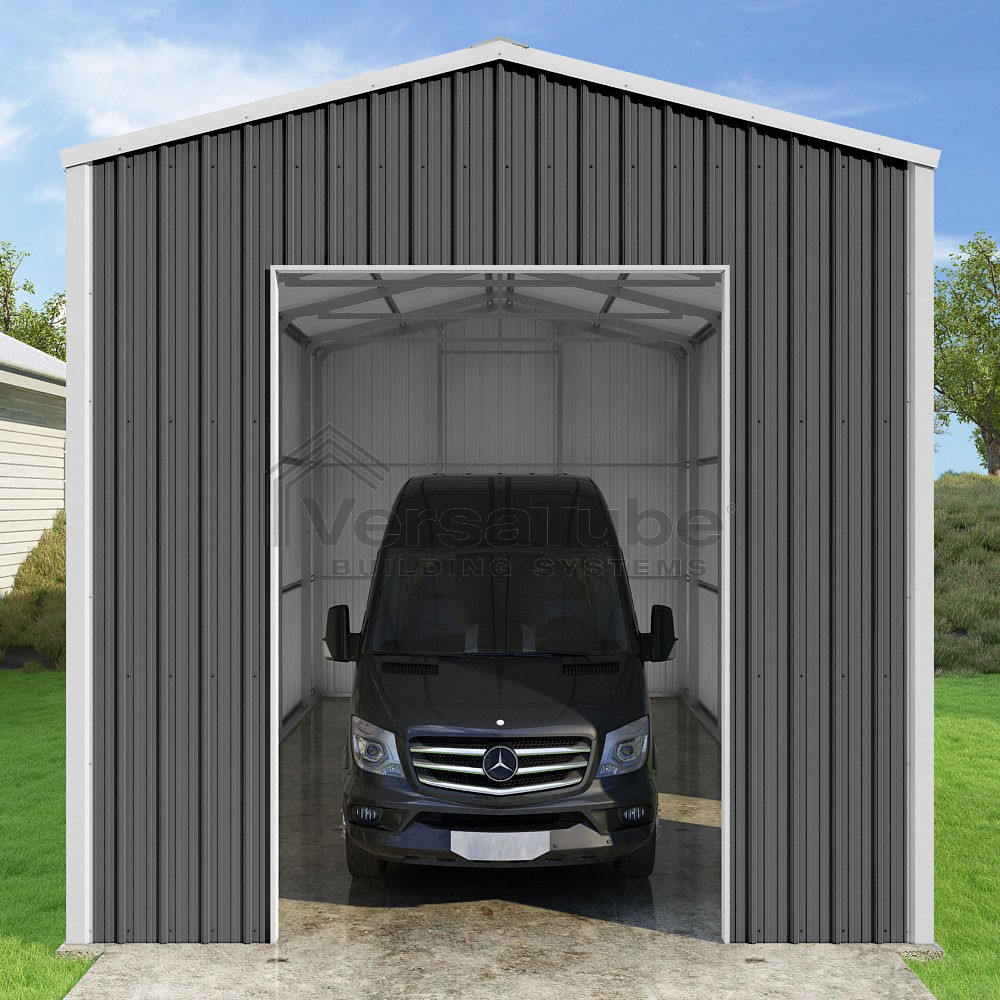 Summit Series DIY garage kit features vertical sheet metal roof and siding panels for a consistent look.