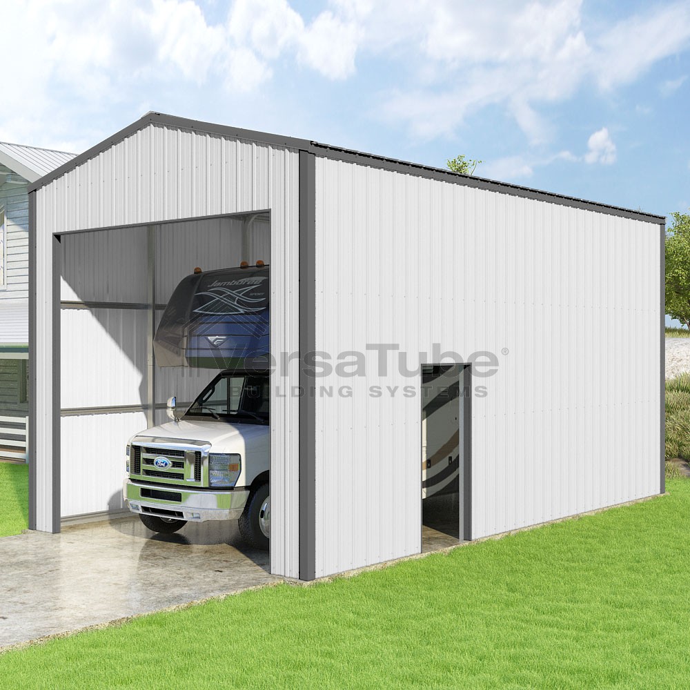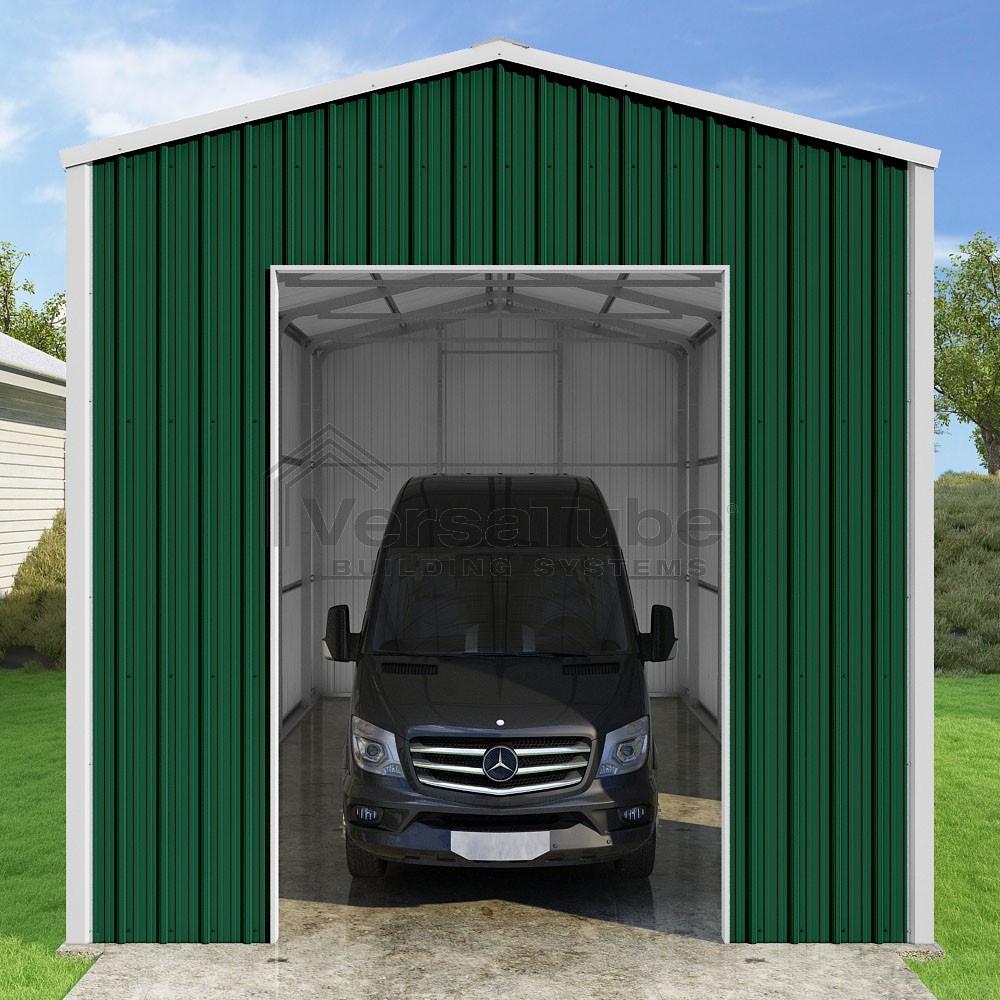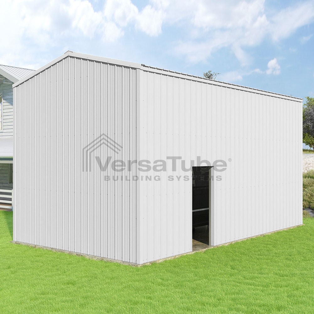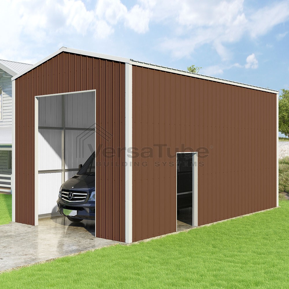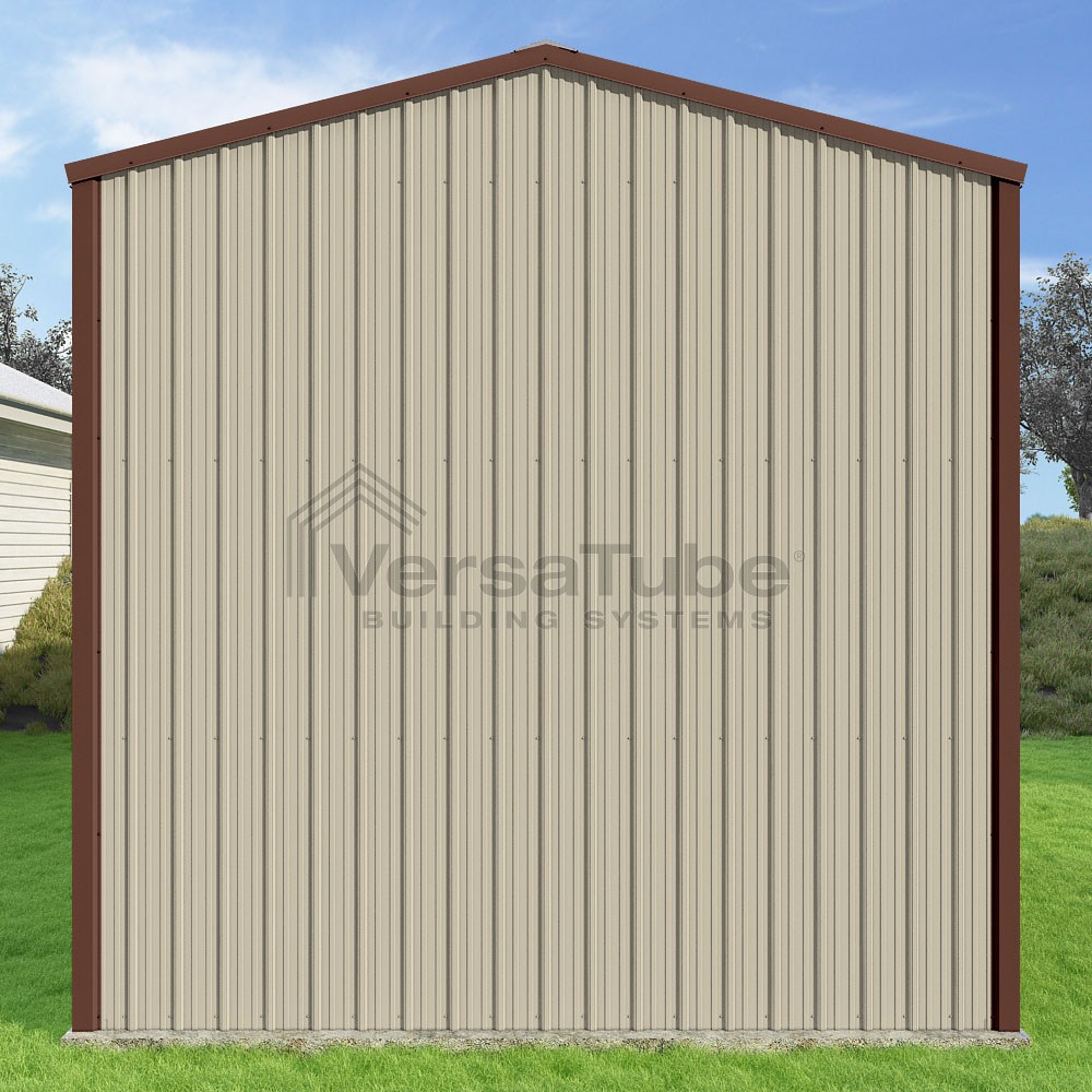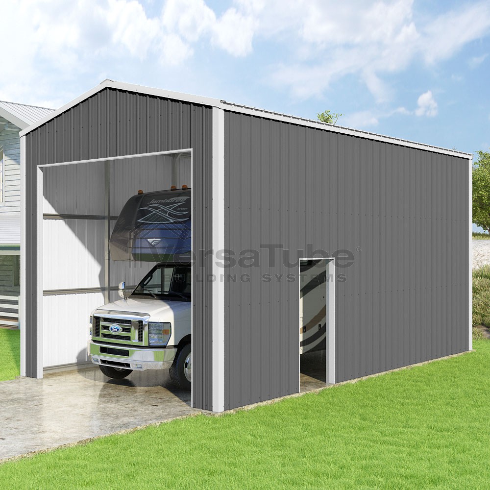 Summit Series DIY garage kit features vertical sheet metal roof and siding panels for a consistent look.