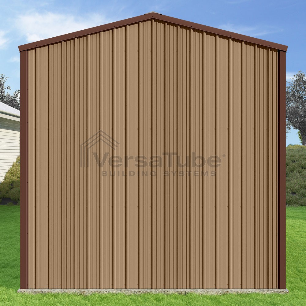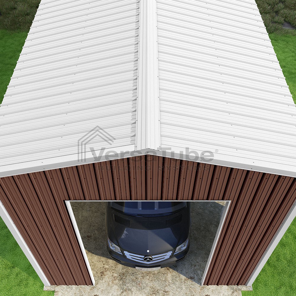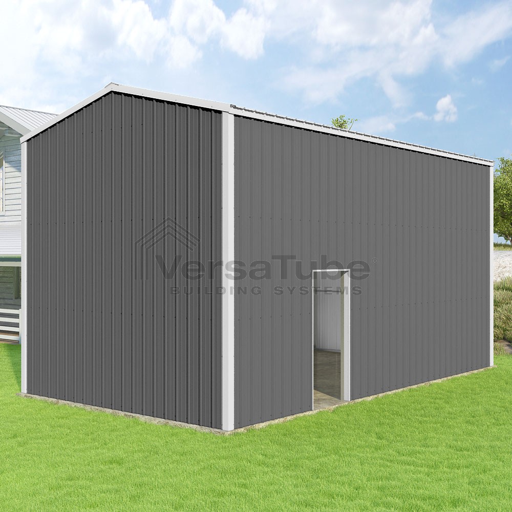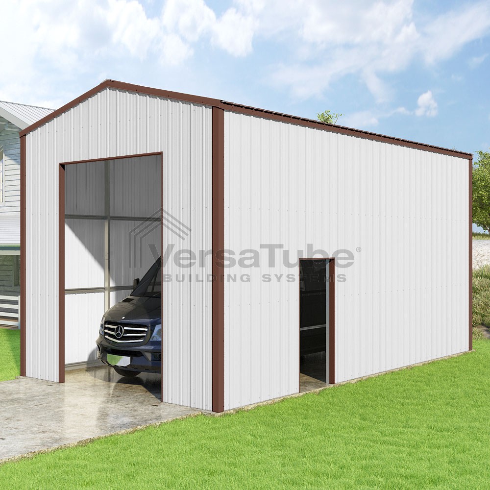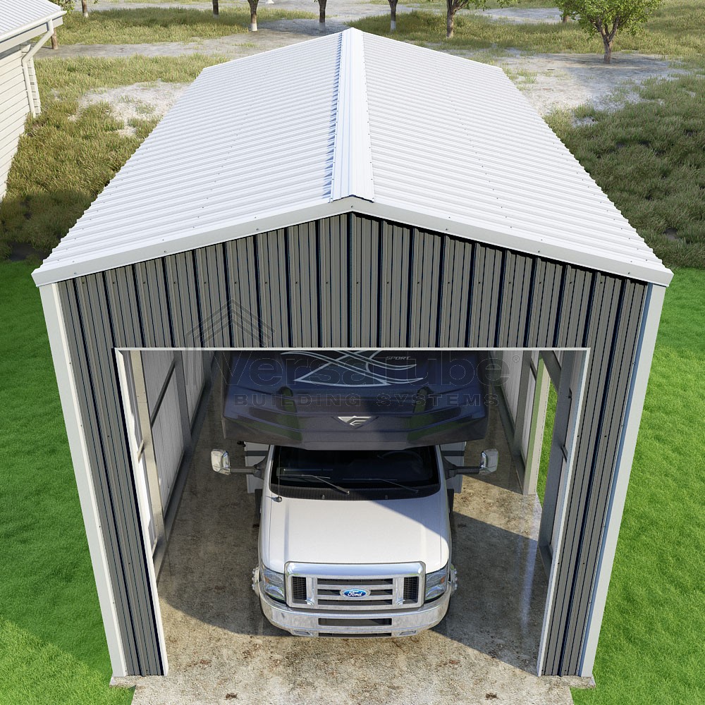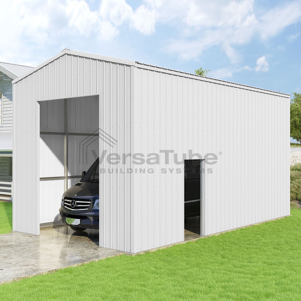 Summit Series DIY garage kit features vertical sheet metal roof and siding panels for a consistent look.