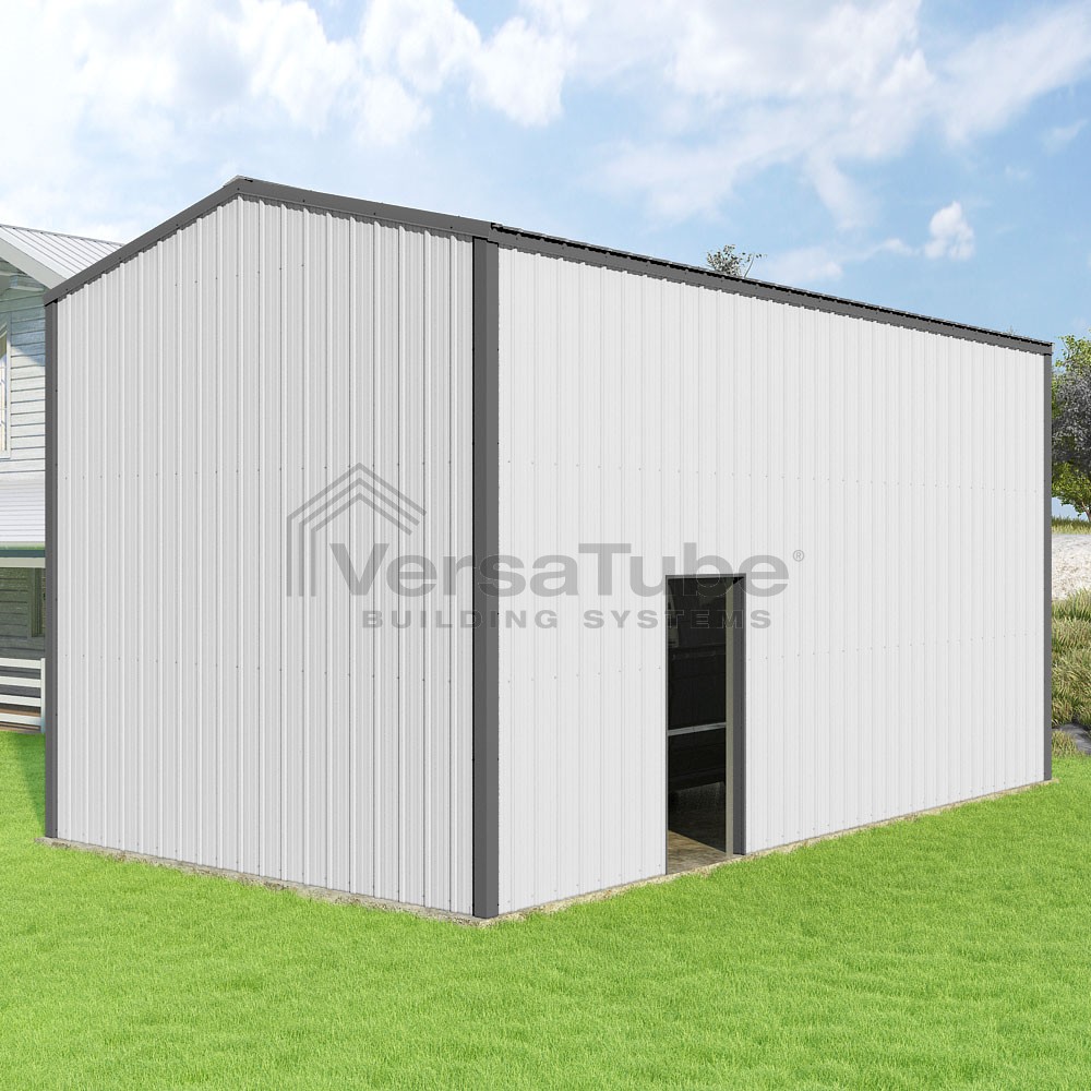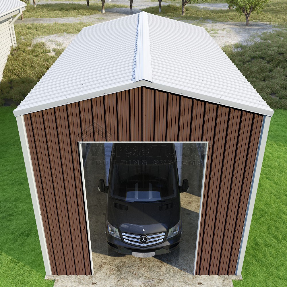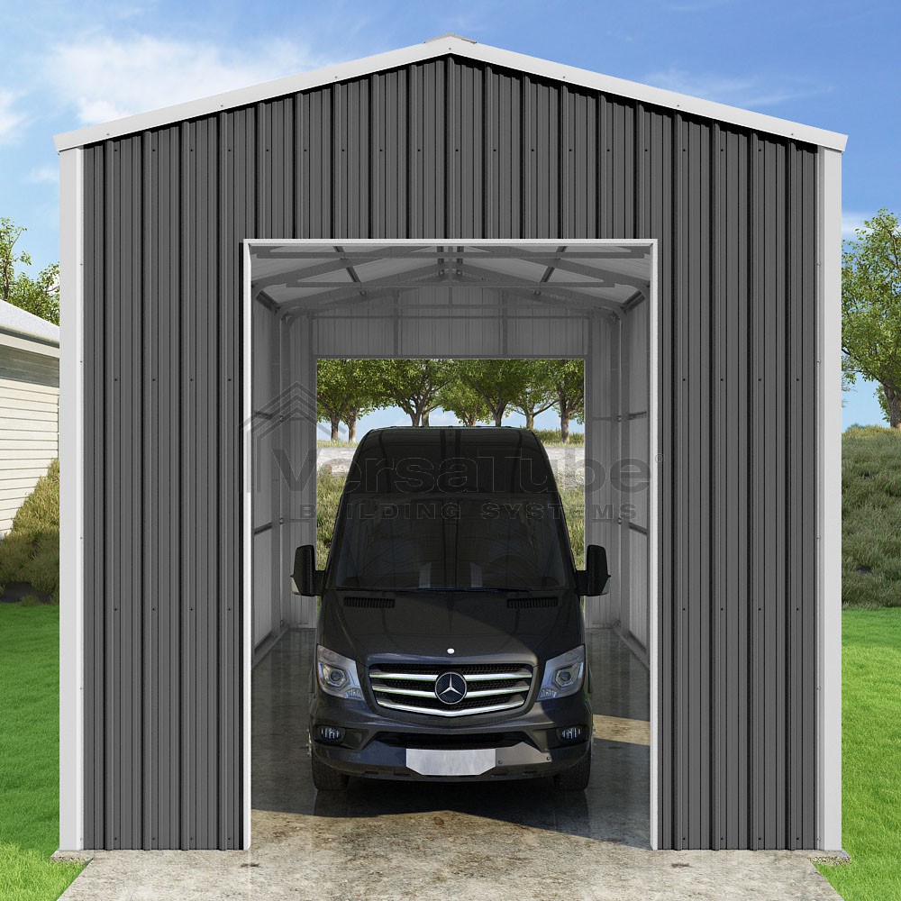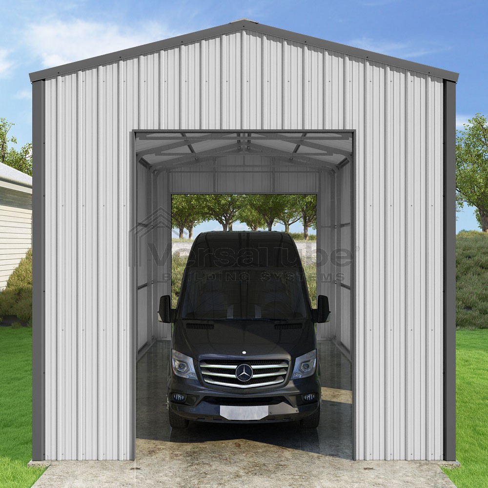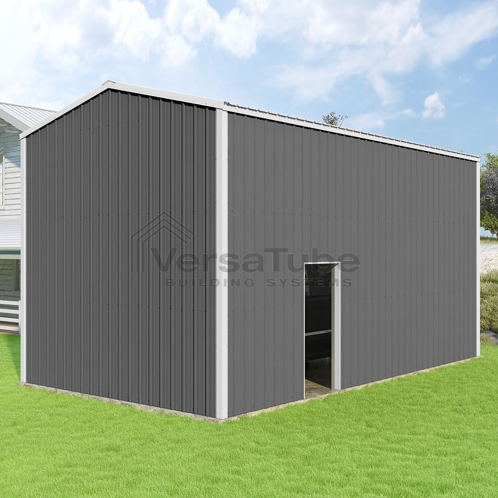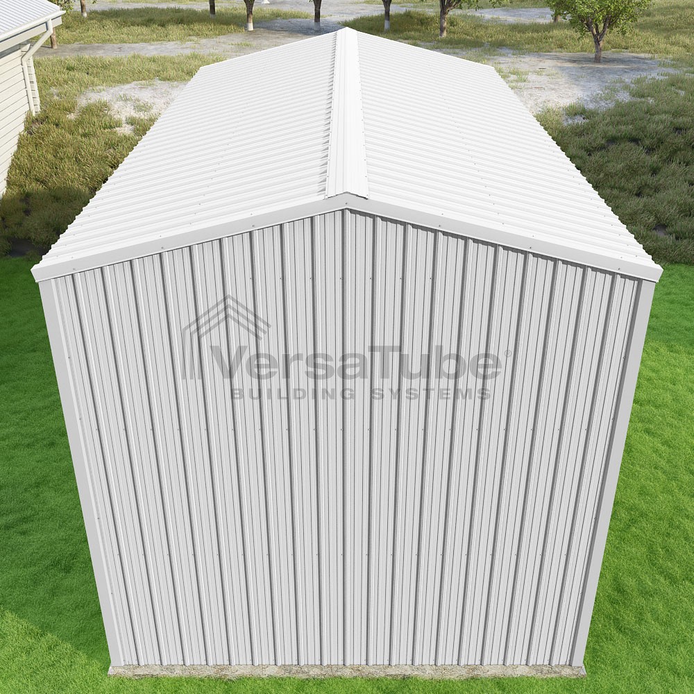 Summit Series DIY garage kit features vertical sheet metal roof and siding panels for a consistent look.
