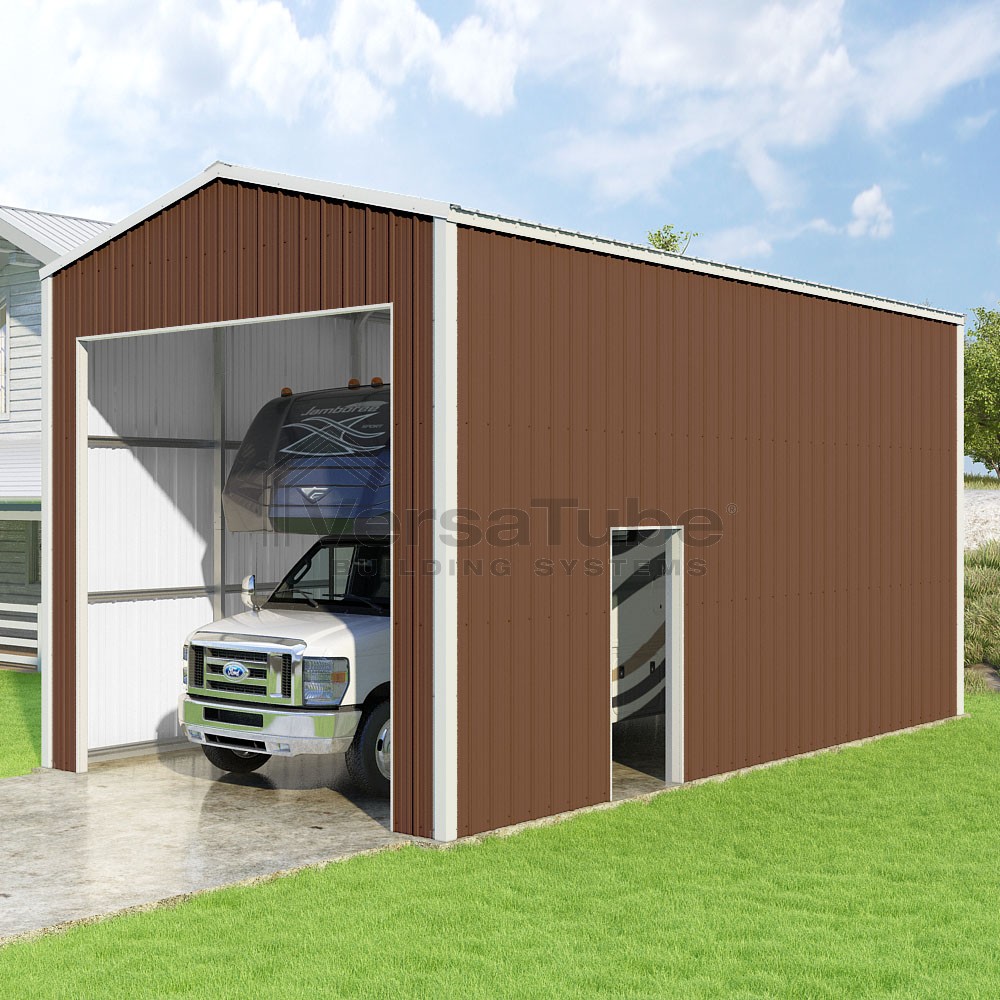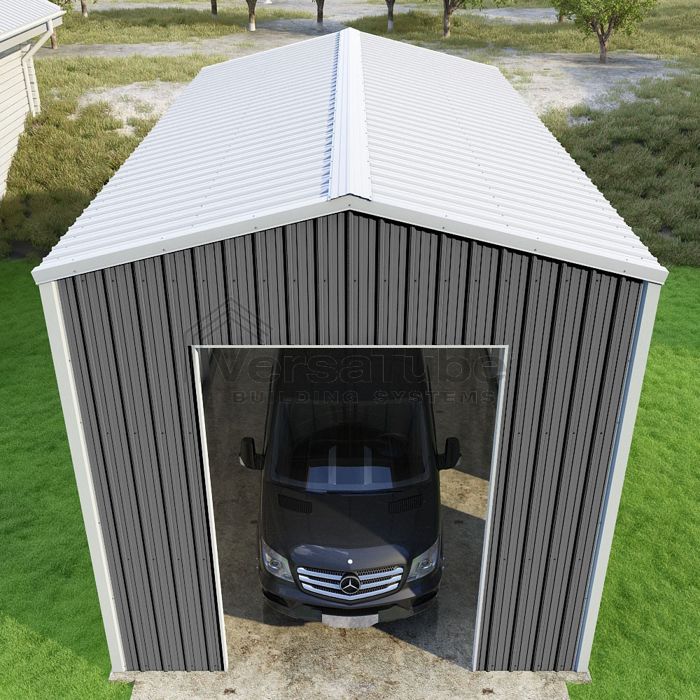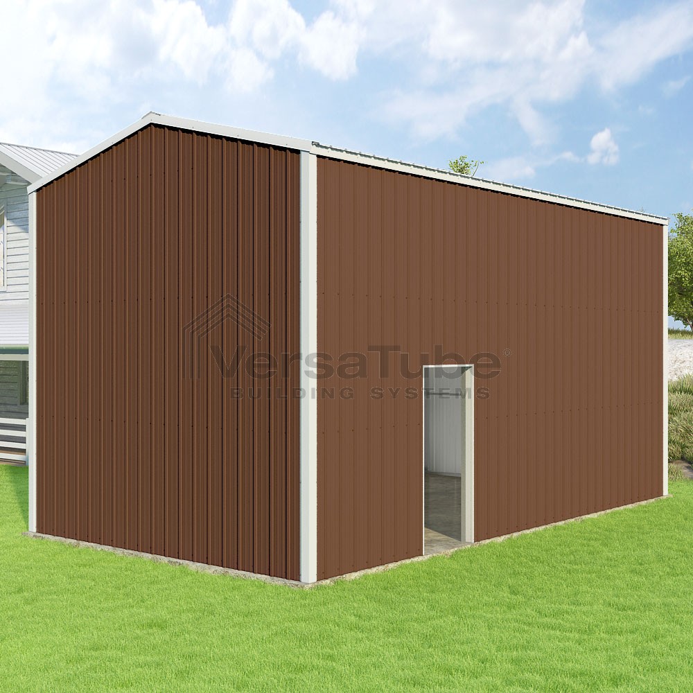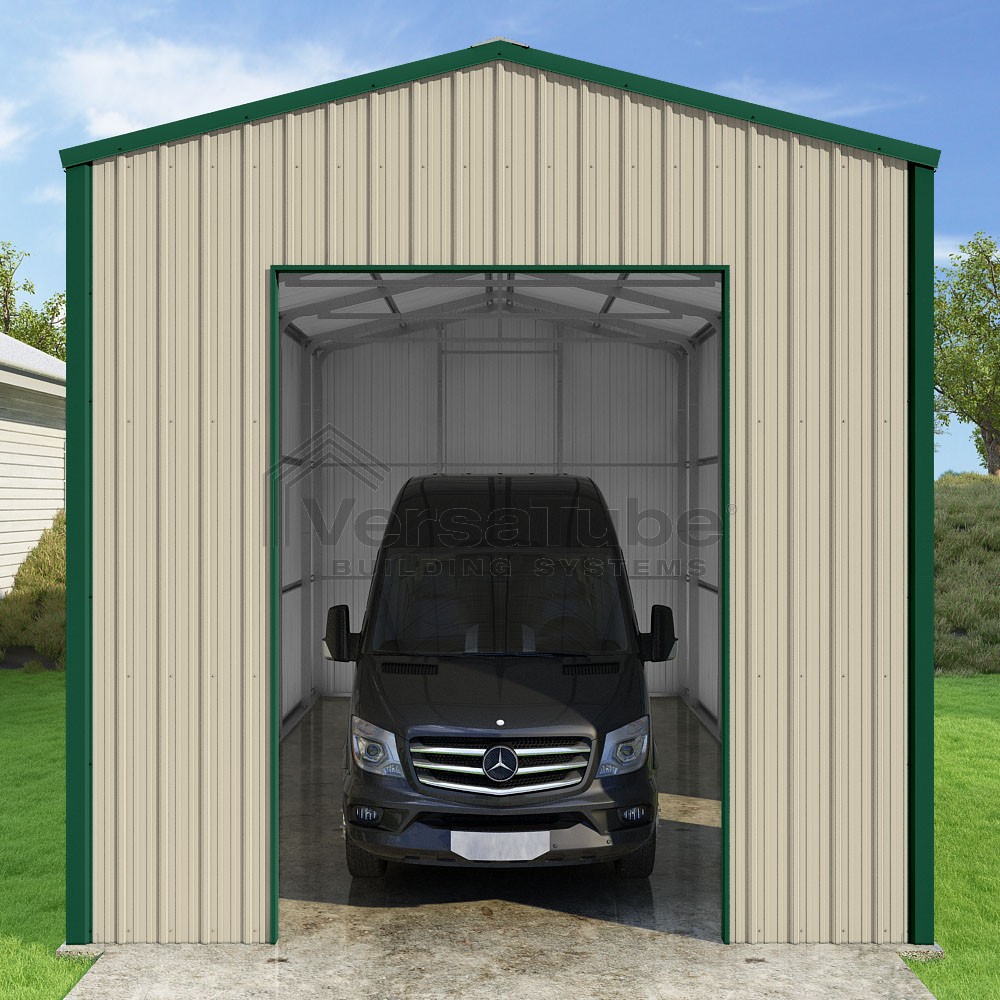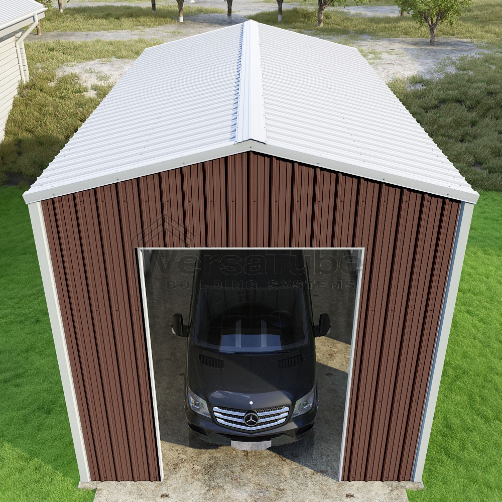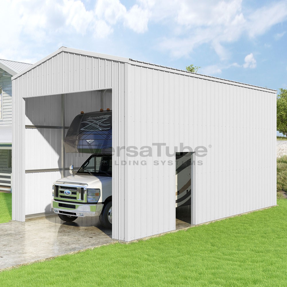 Summit Series DIY garage kit features vertical sheet metal roof and siding panels for a consistent look.