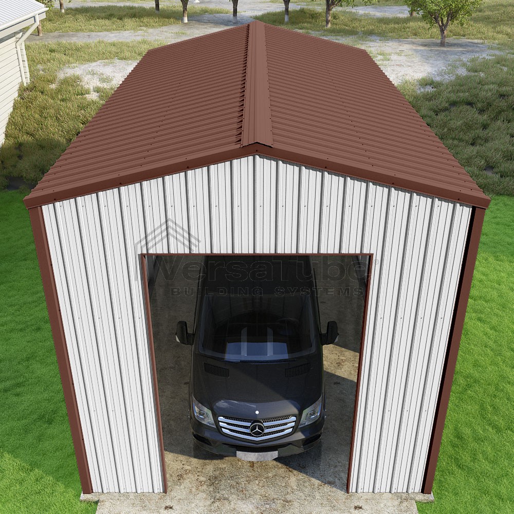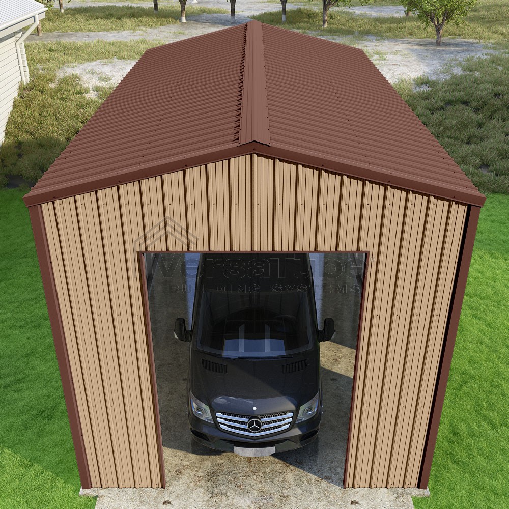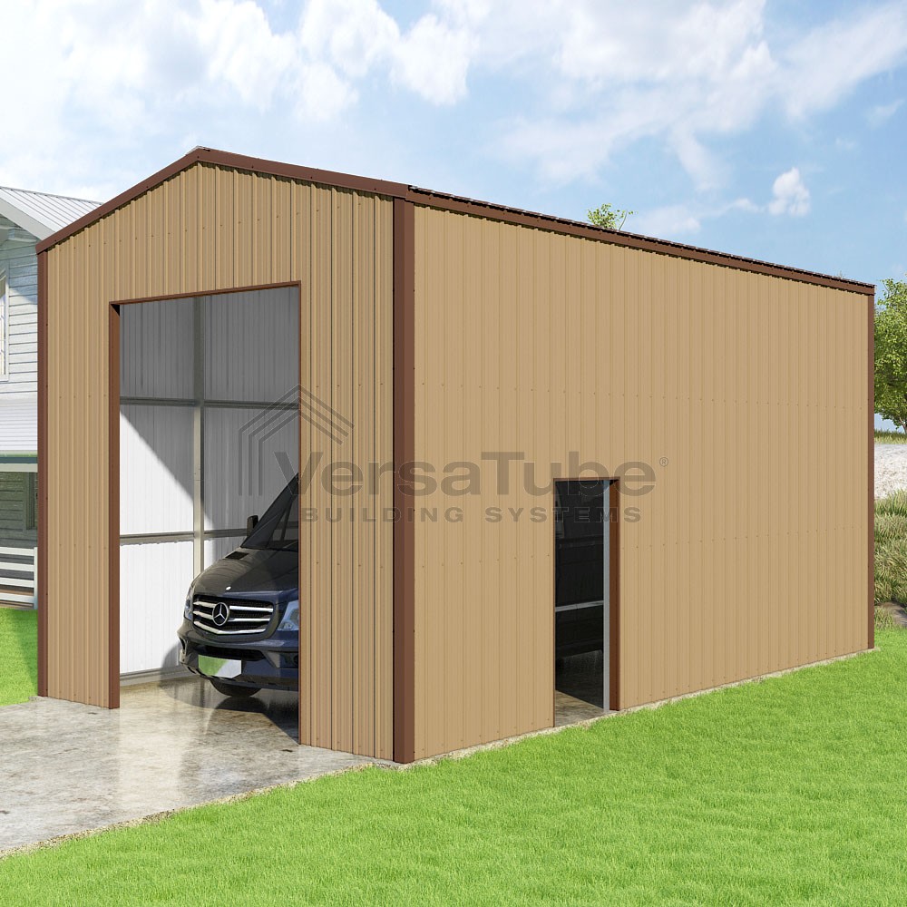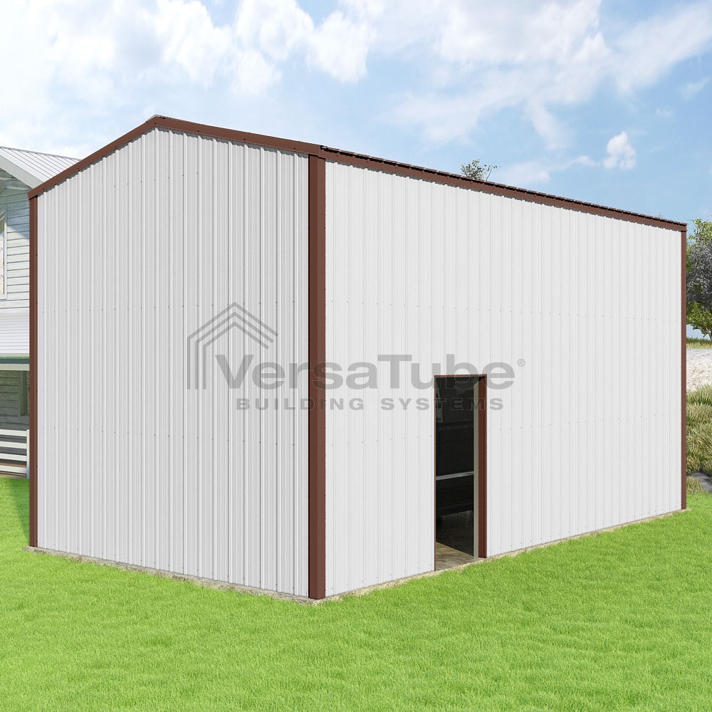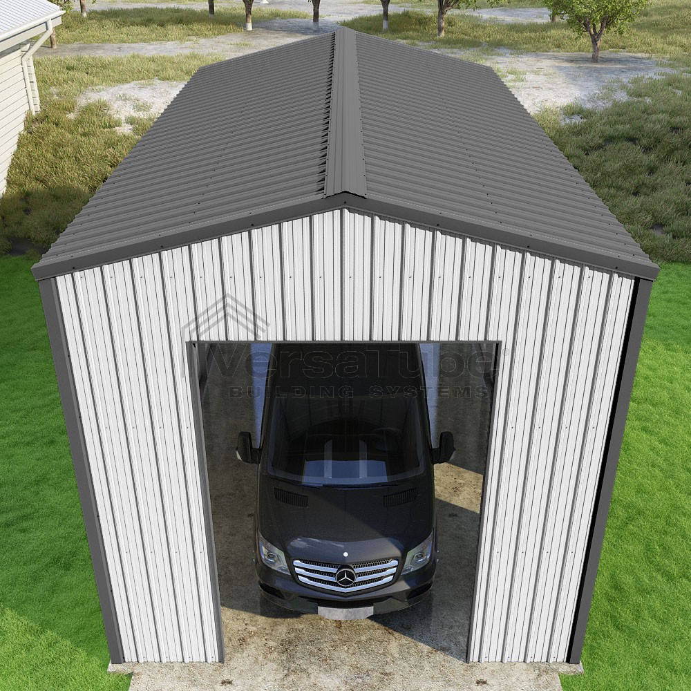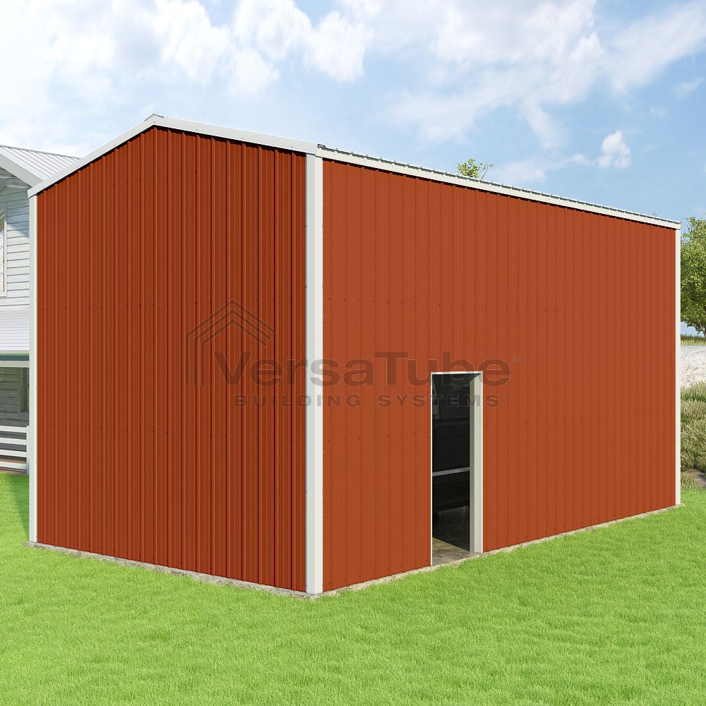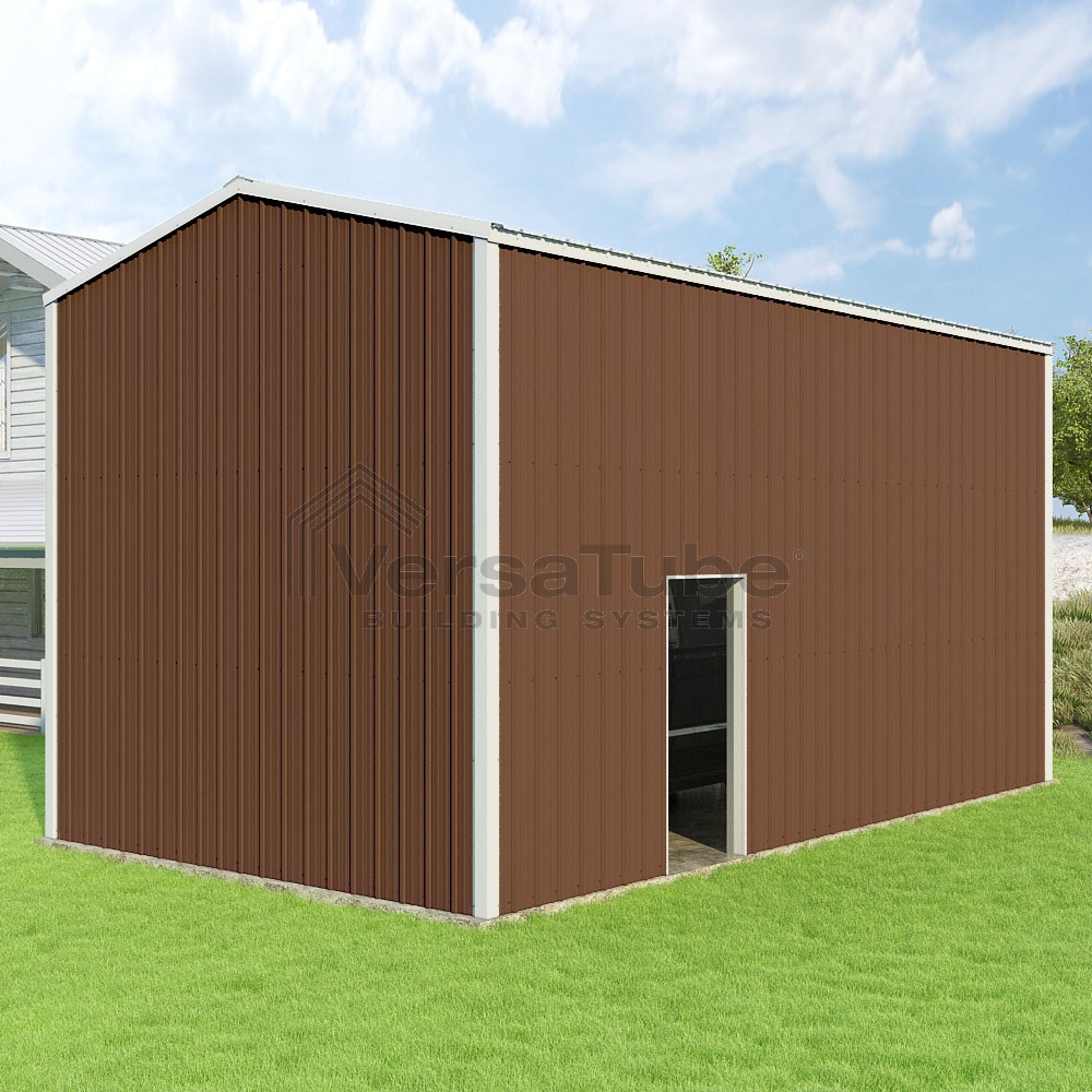 Summit Series DIY garage kit features vertical sheet metal roof and siding panels for a consistent look.