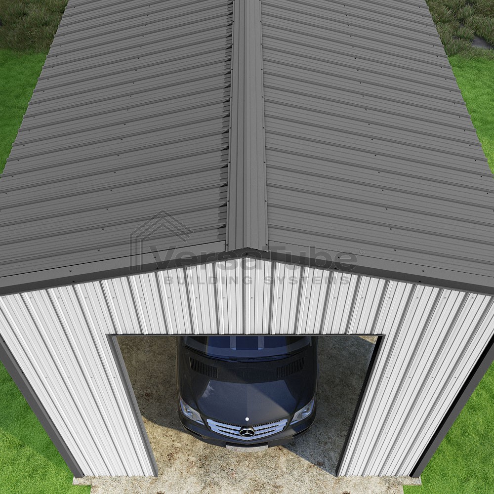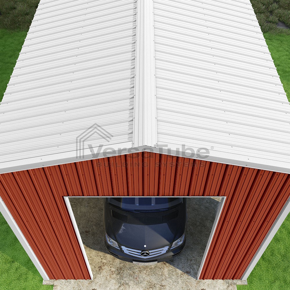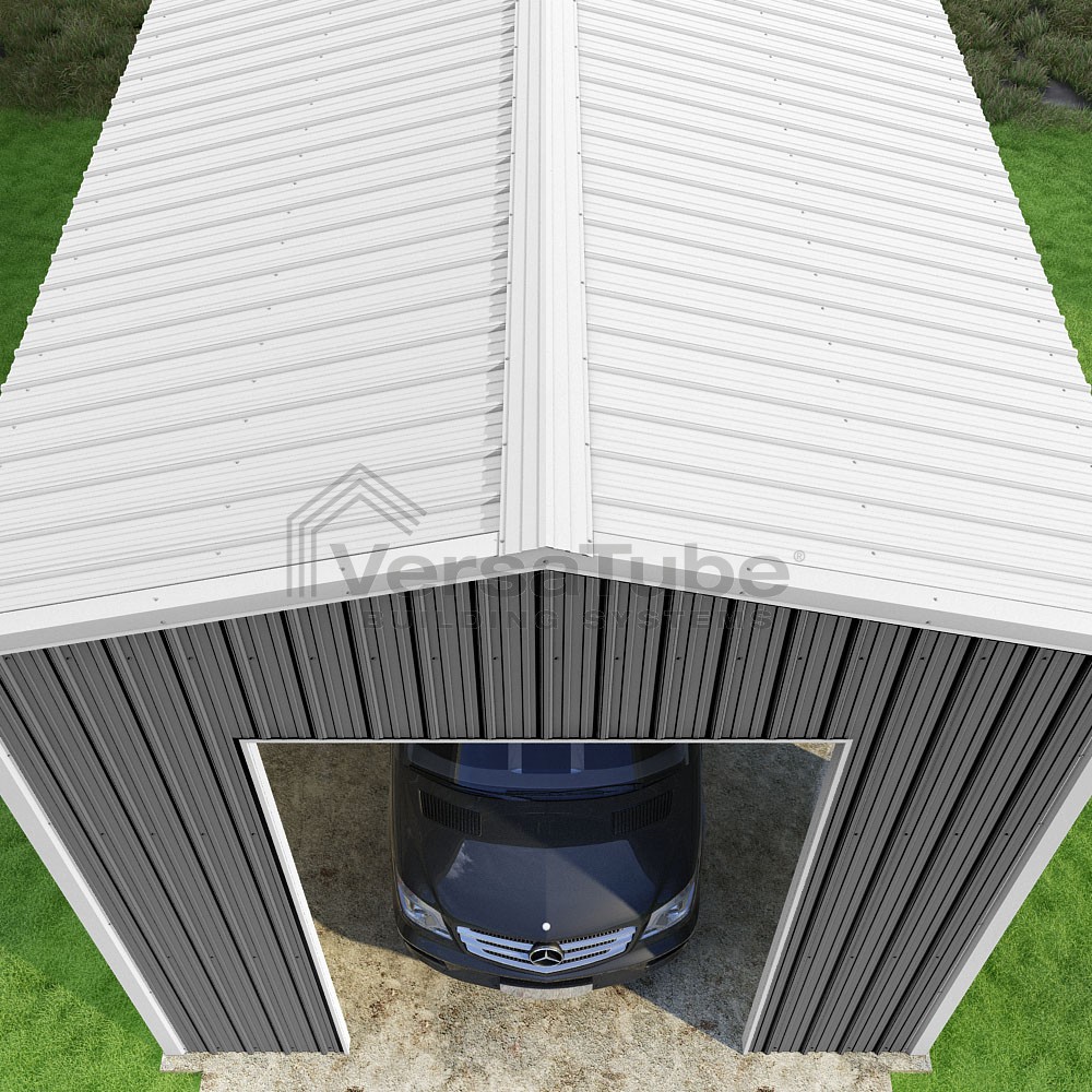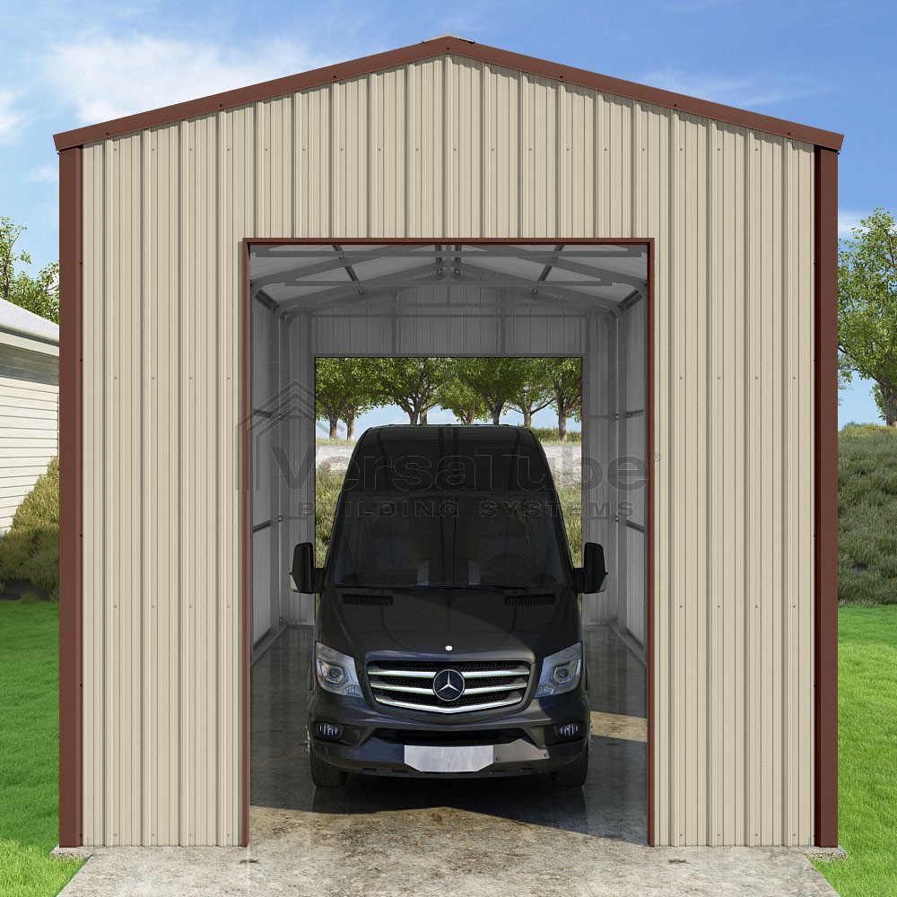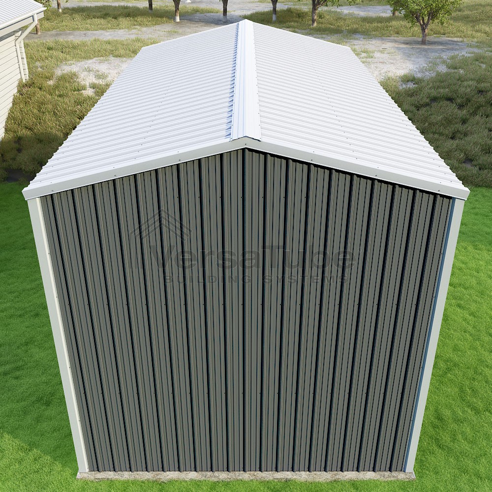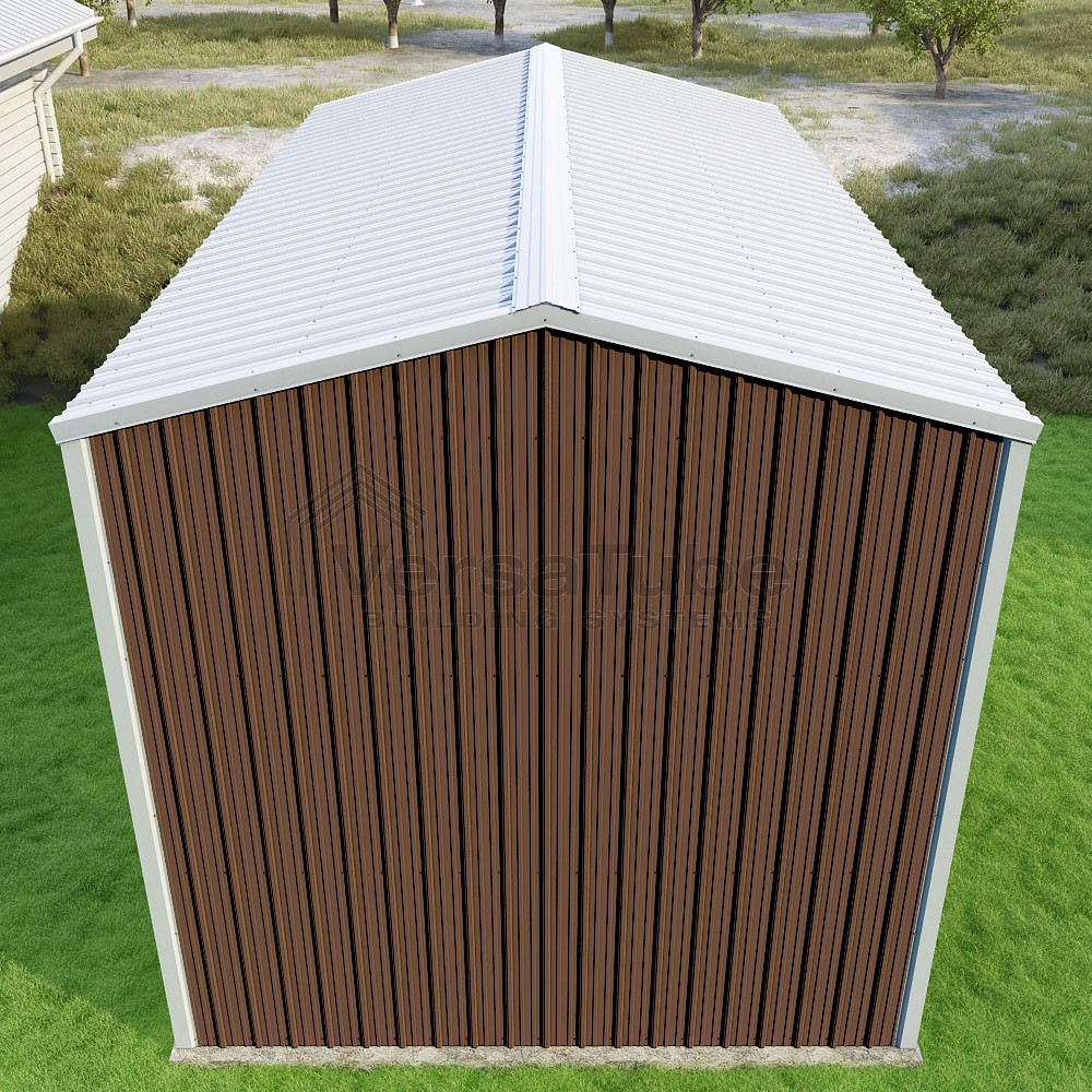 Summit Series DIY garage kit features vertical sheet metal roof and siding panels for a consistent look.