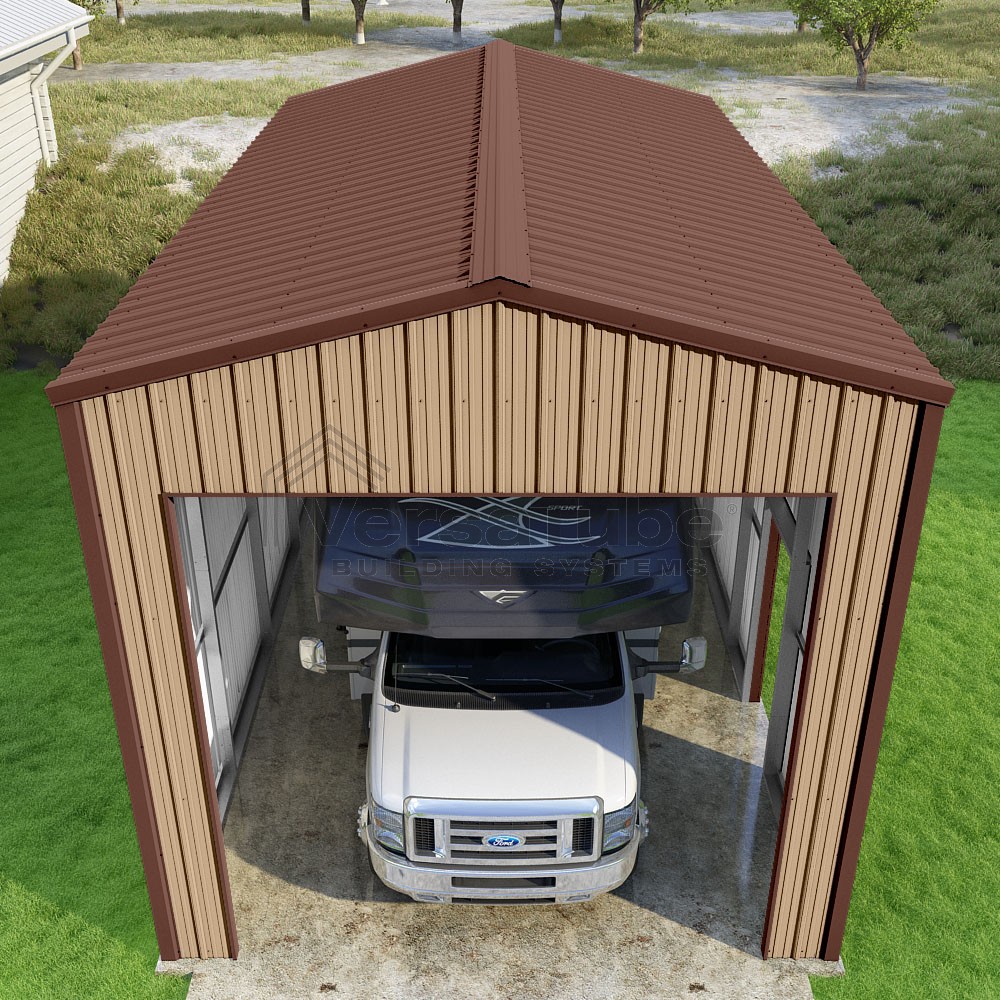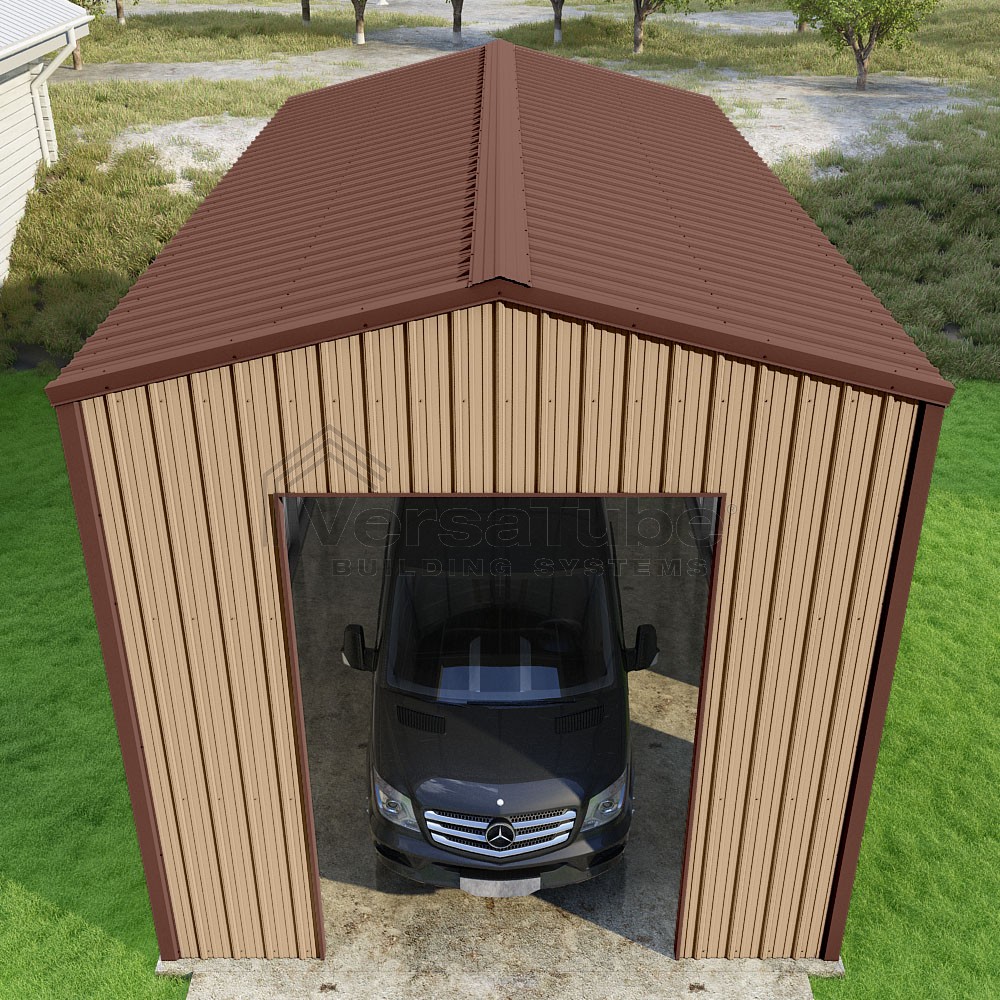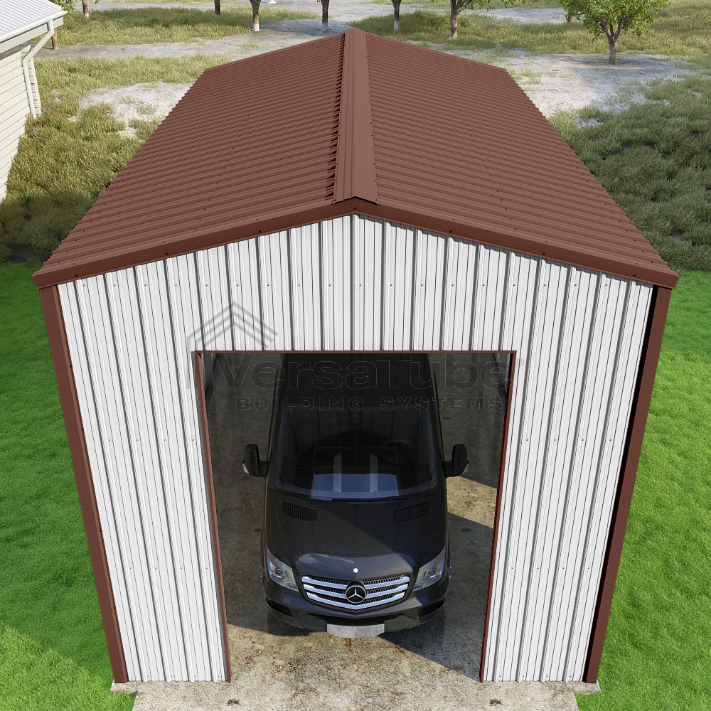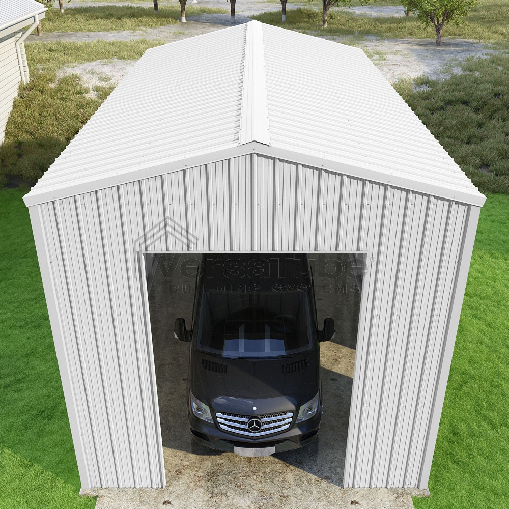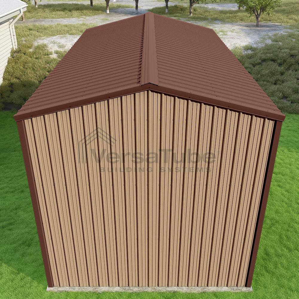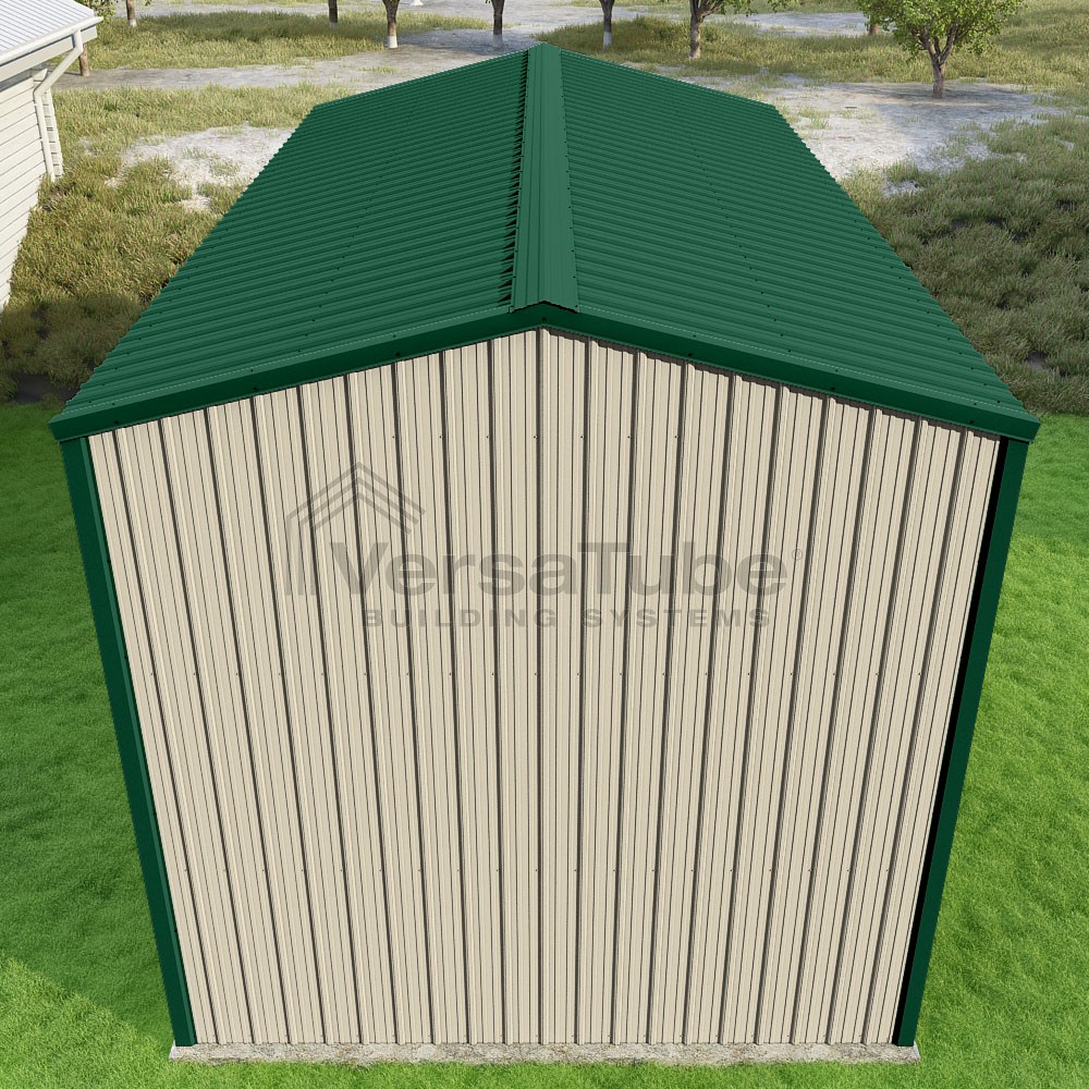 Summit Series DIY garage kit features vertical sheet metal roof and siding panels for a consistent look.