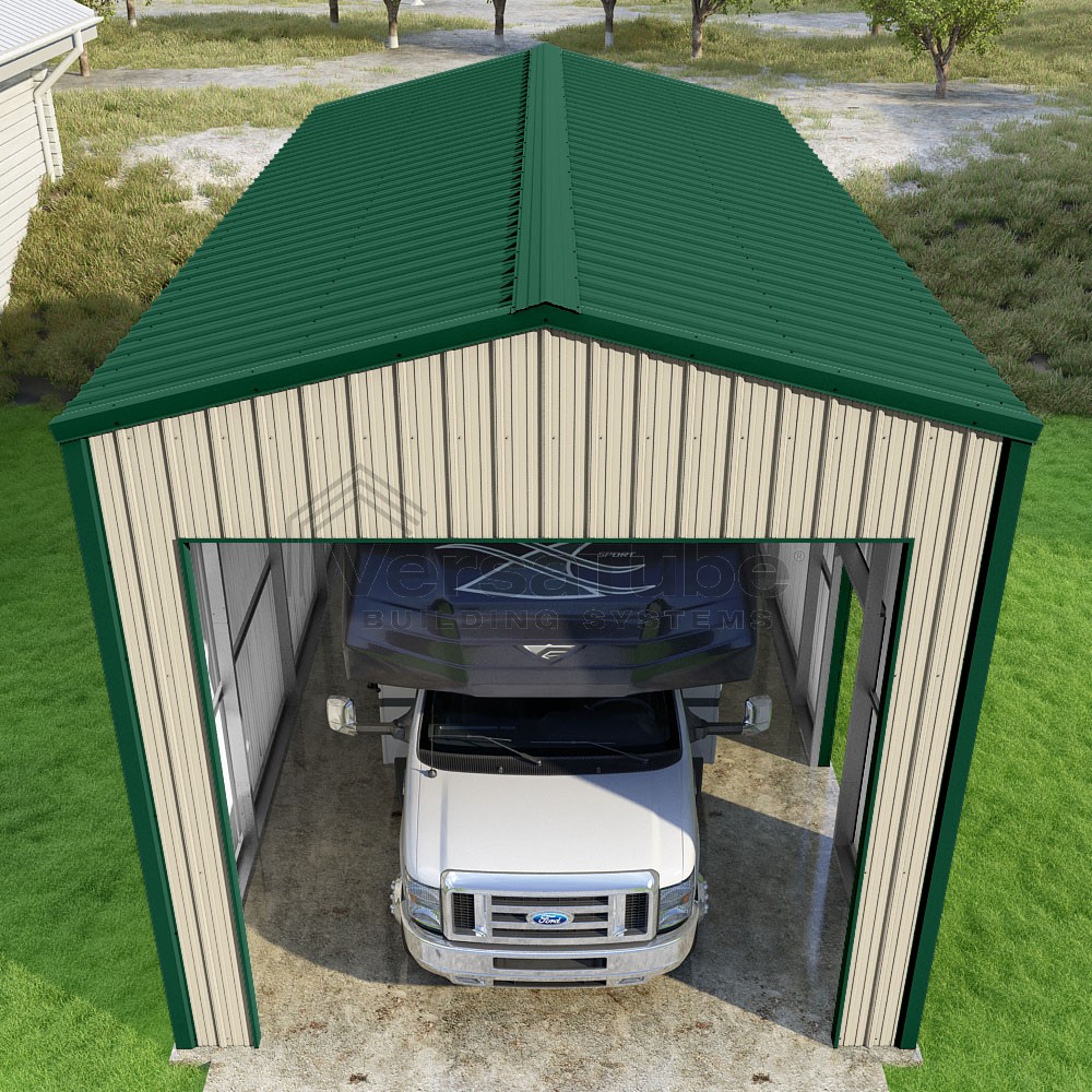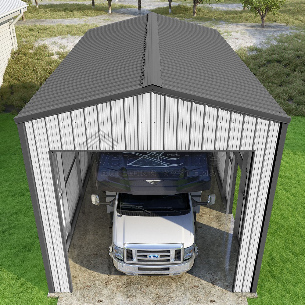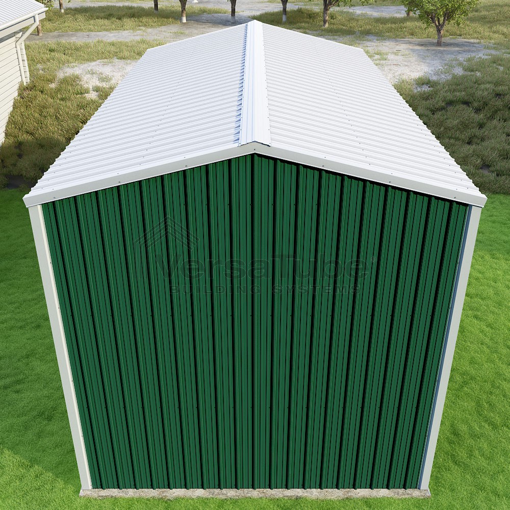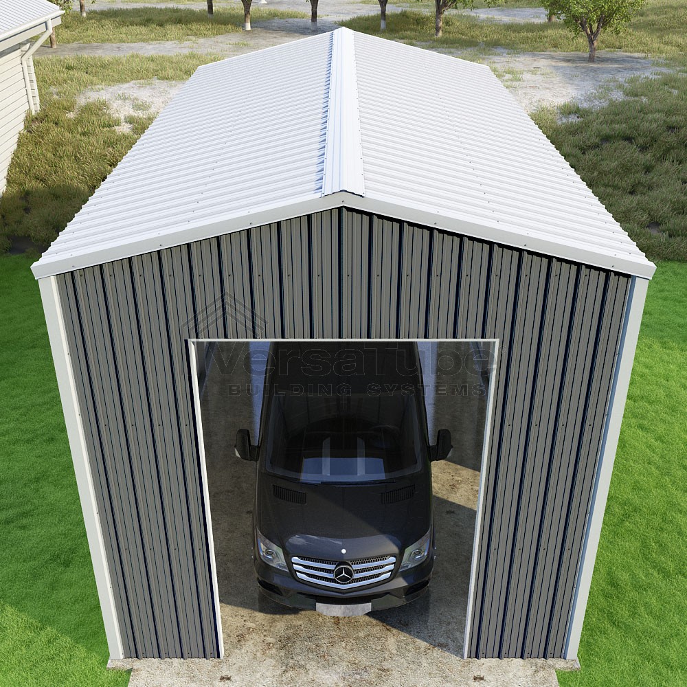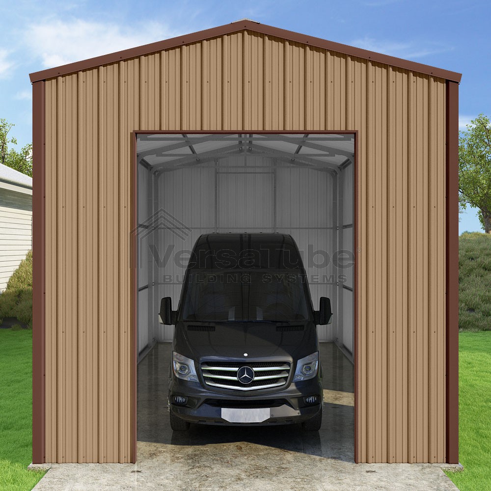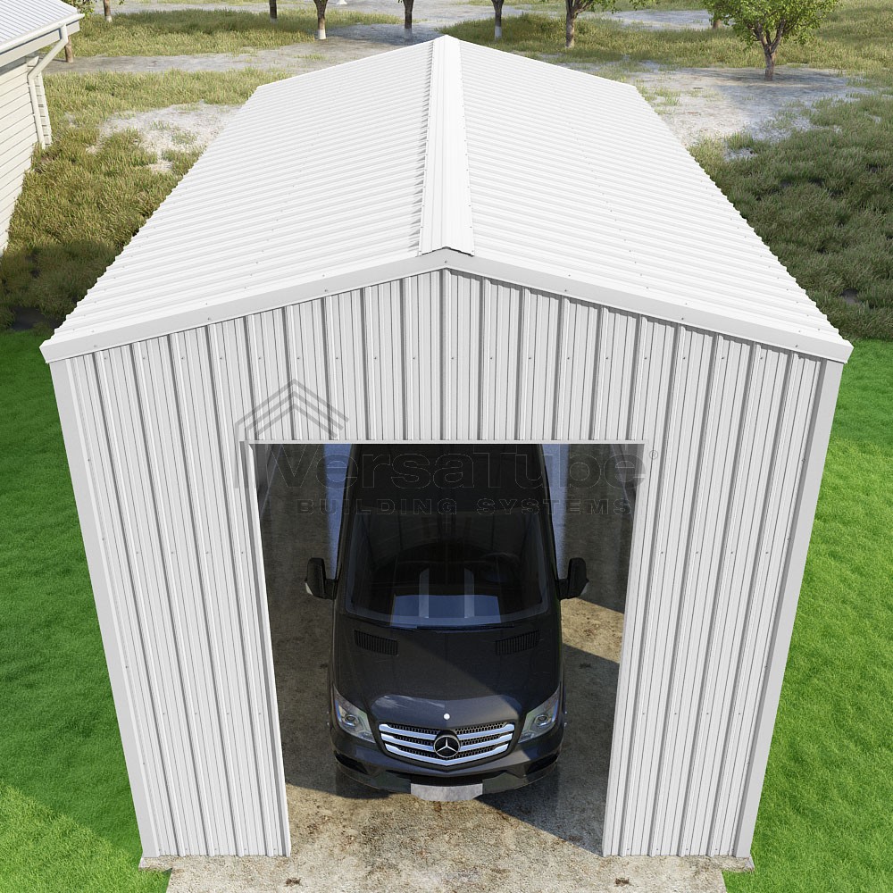 Summit Series DIY garage kit features vertical sheet metal roof and siding panels for a consistent look.