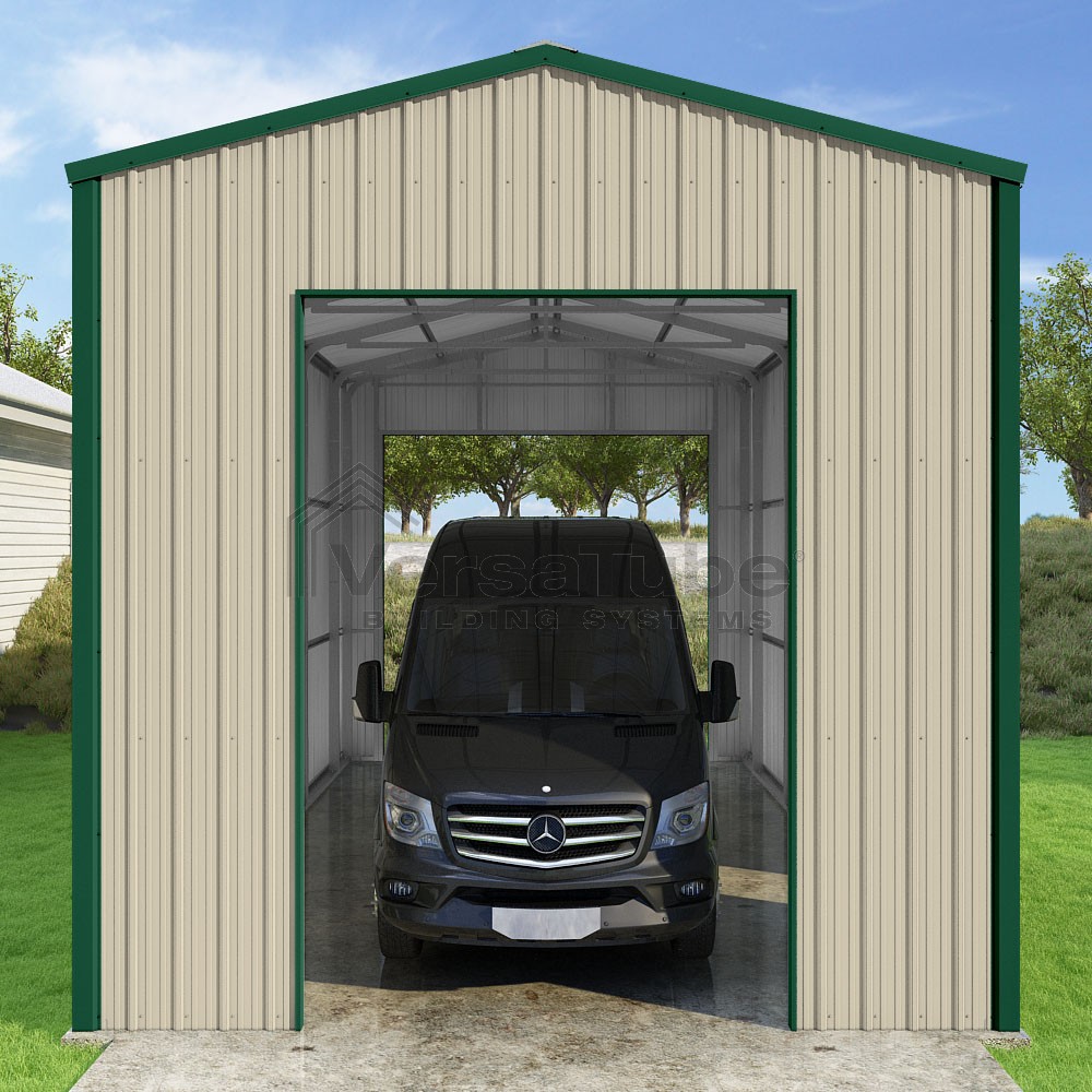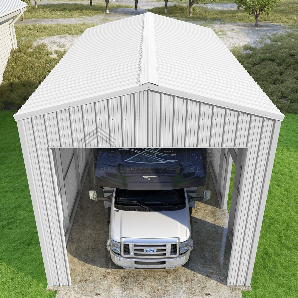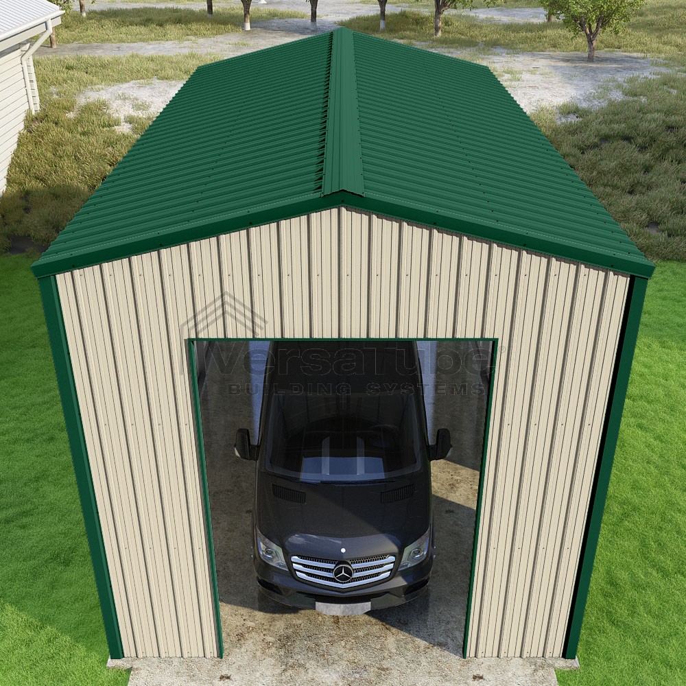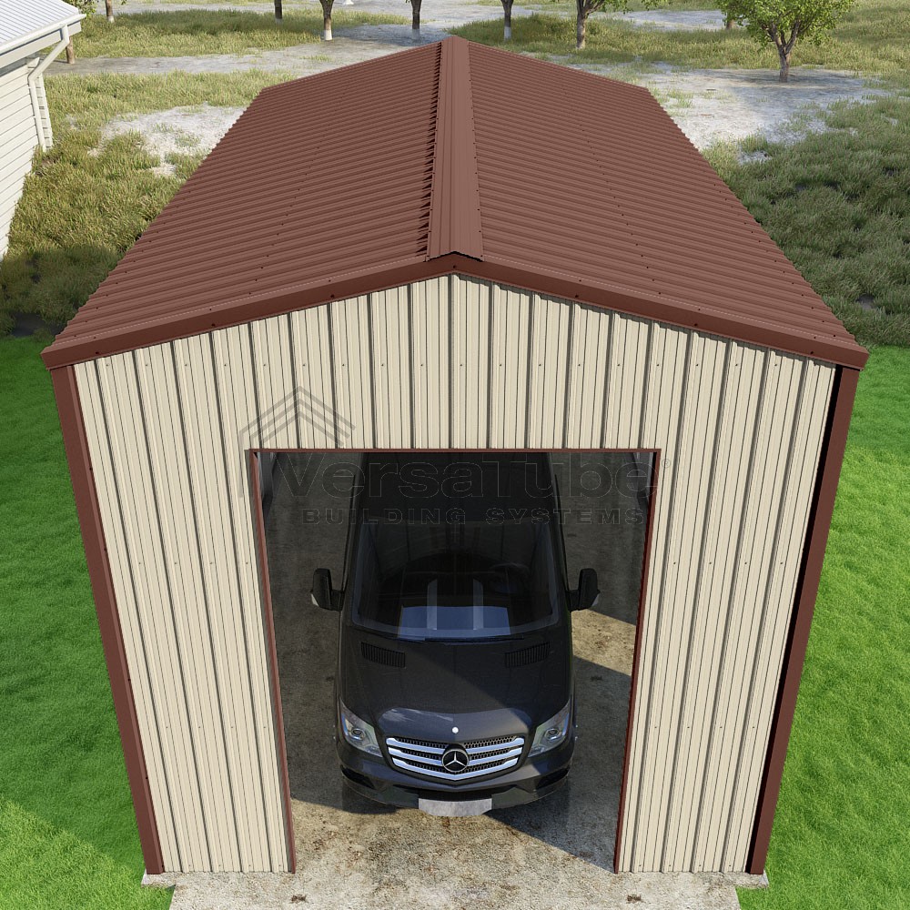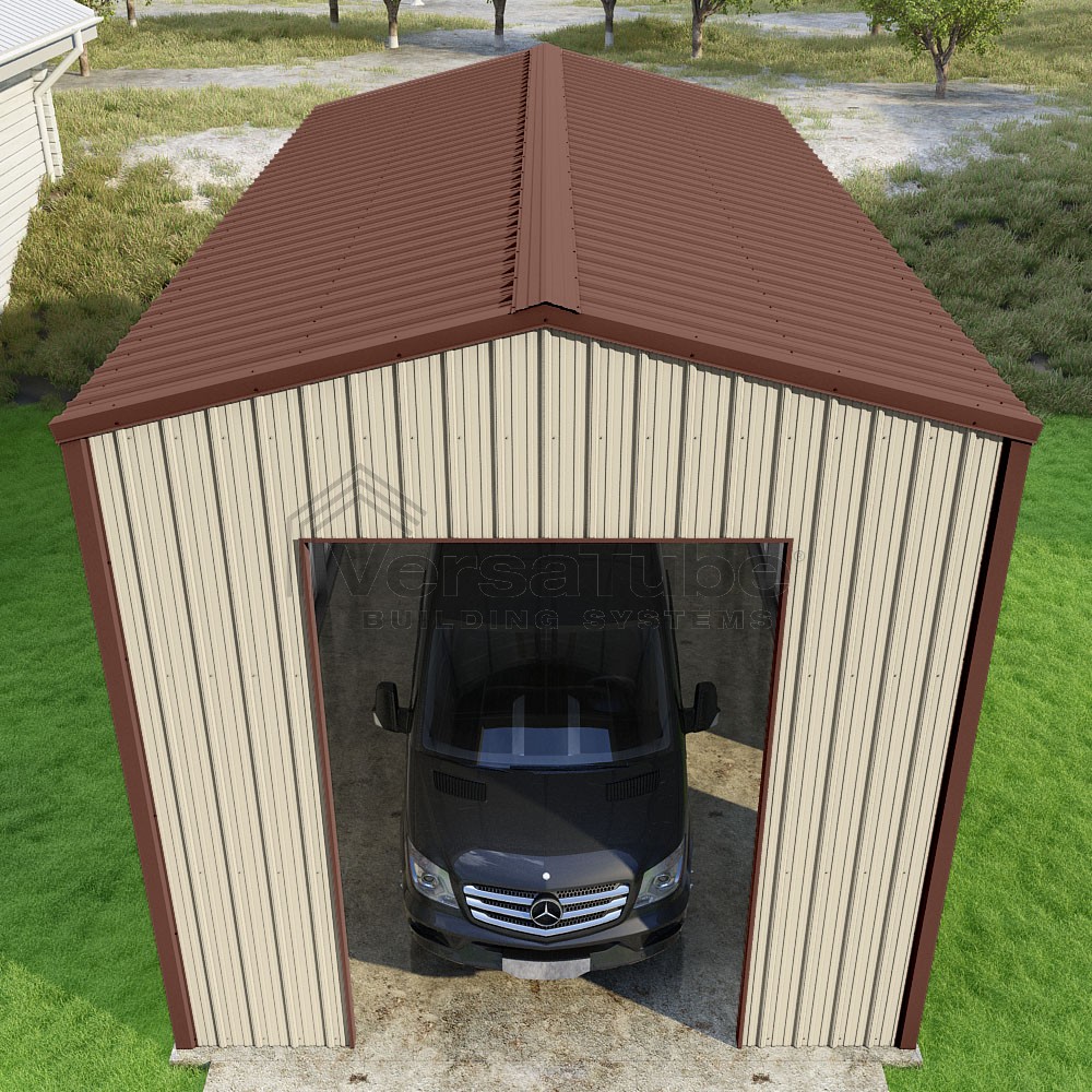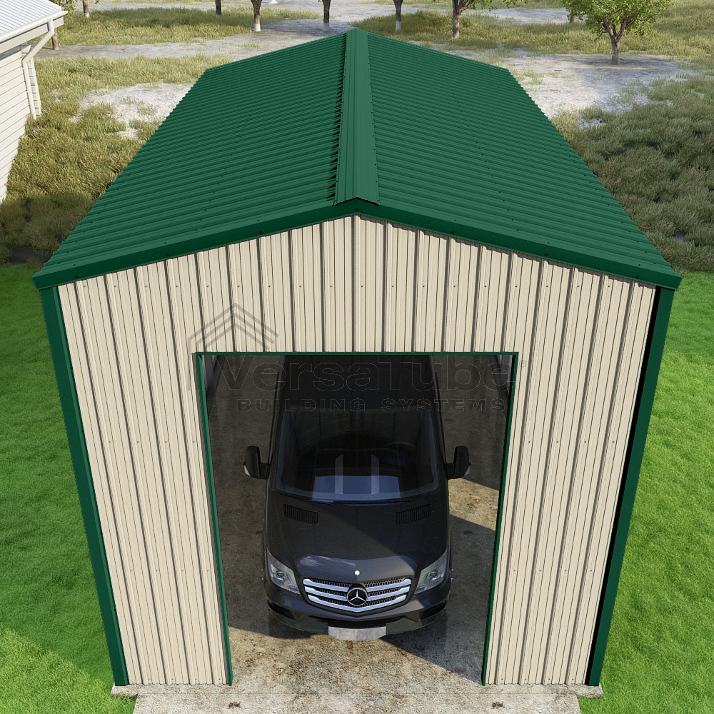 Summit Series DIY garage kit features vertical sheet metal roof and siding panels for a consistent look.
