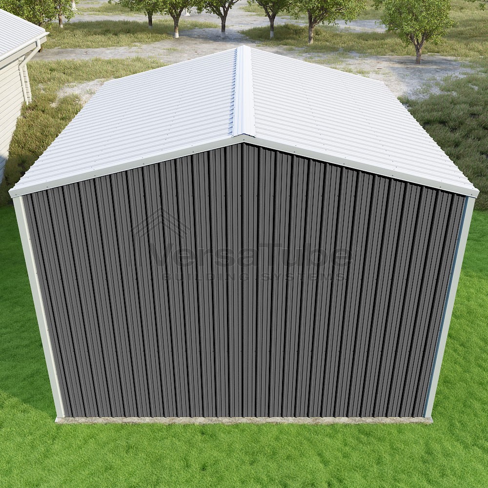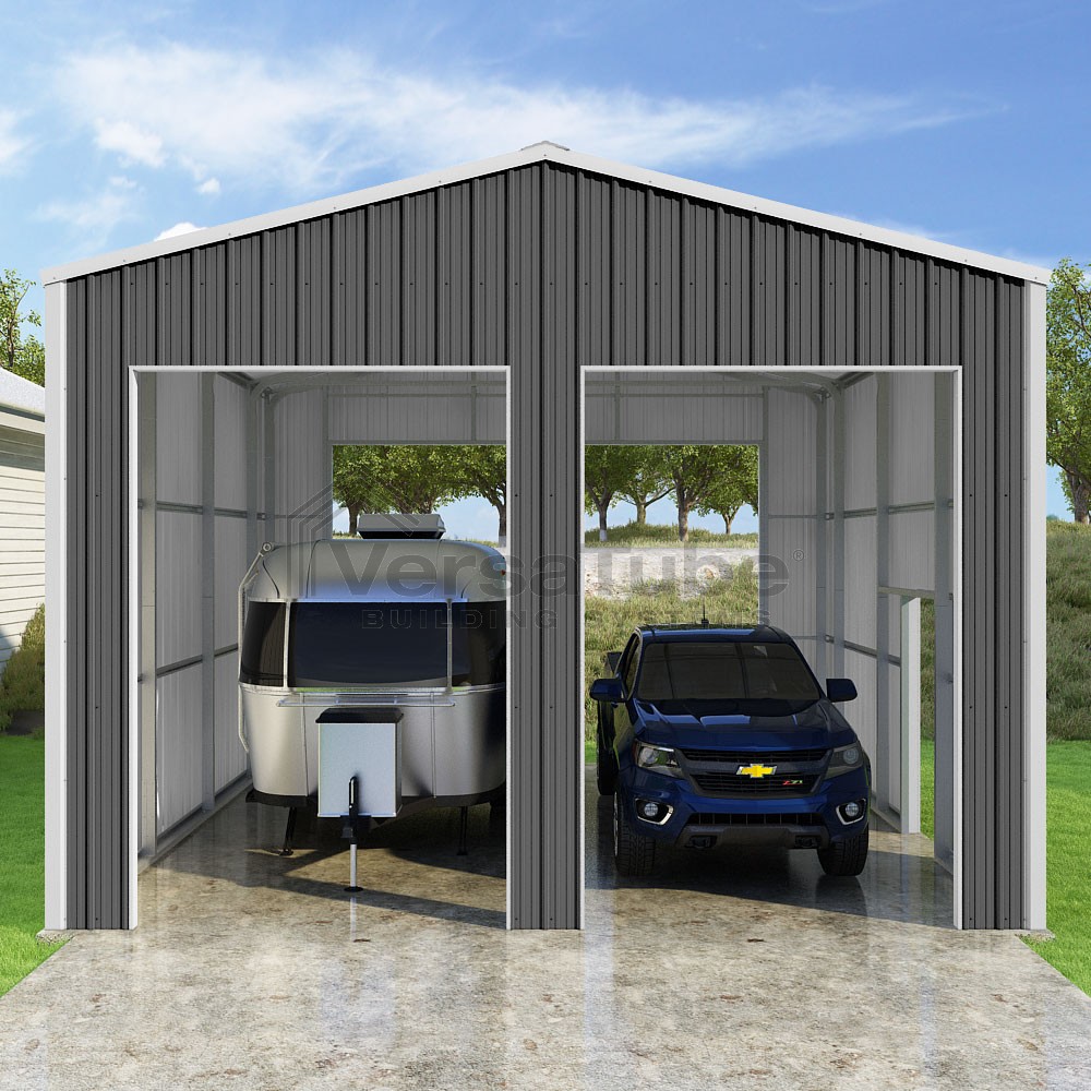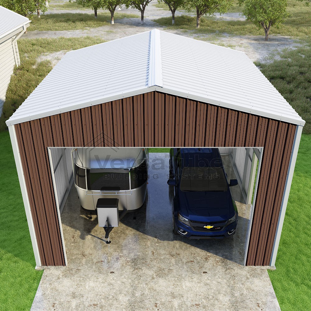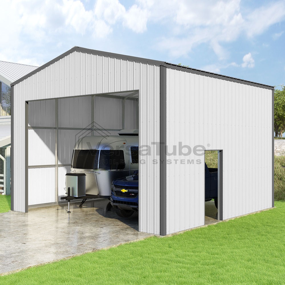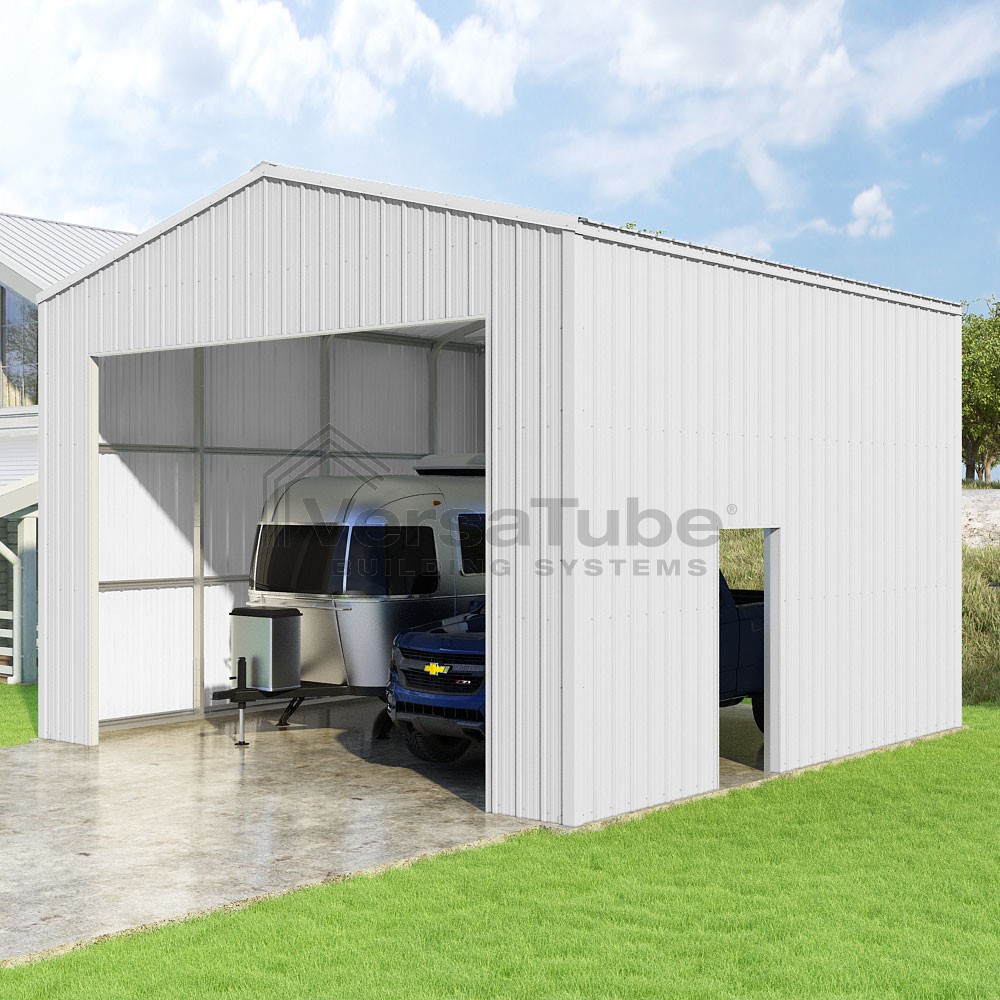Summit Series DIY garage kit features vertical sheet metal roof and siding panels for a consistent look.