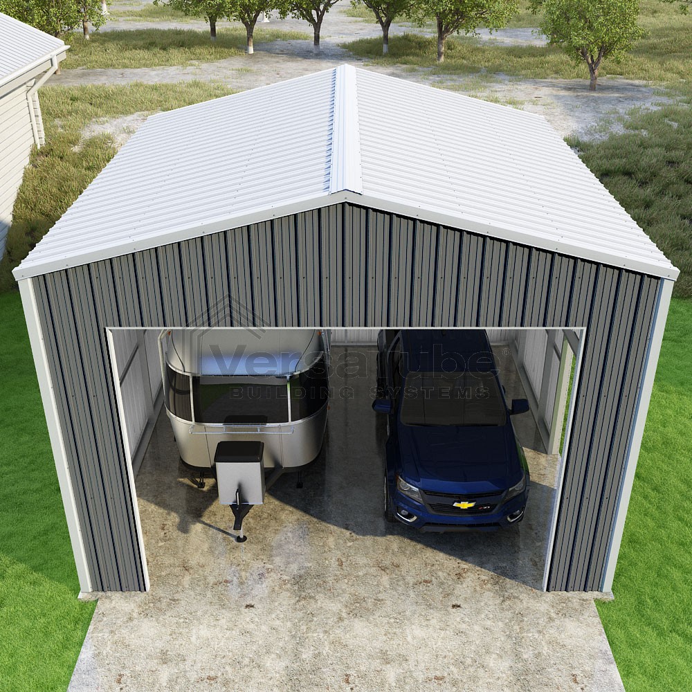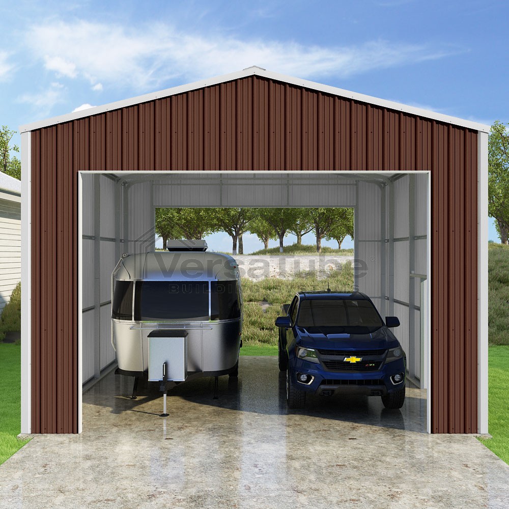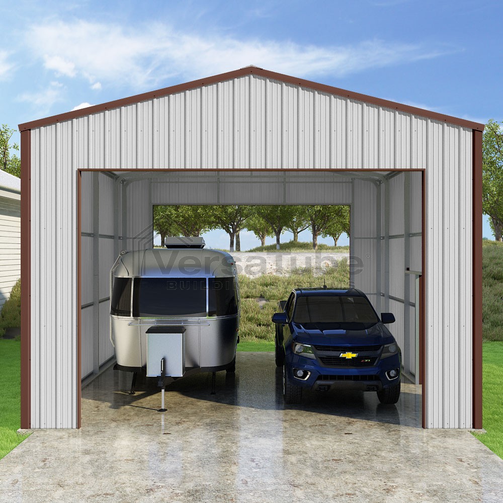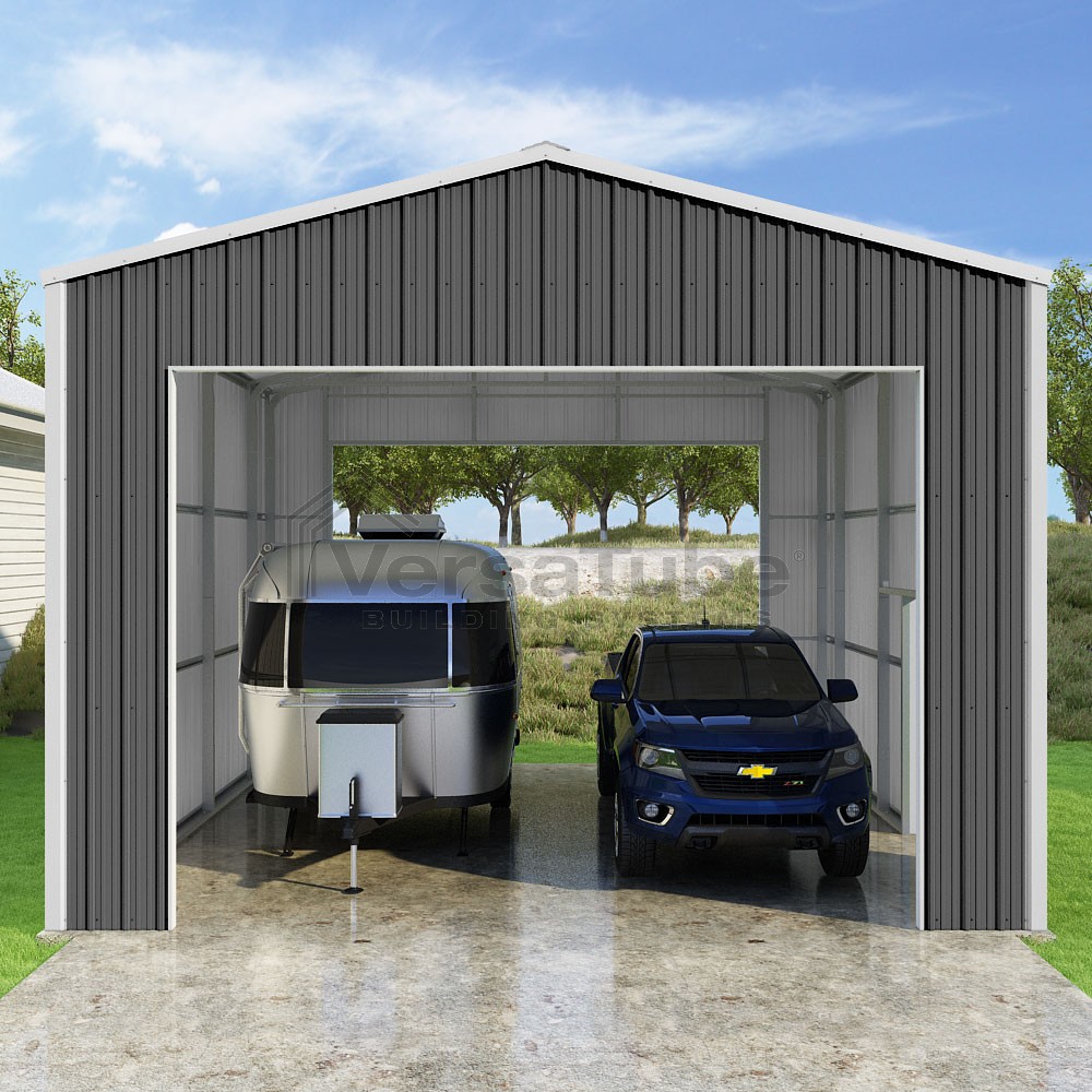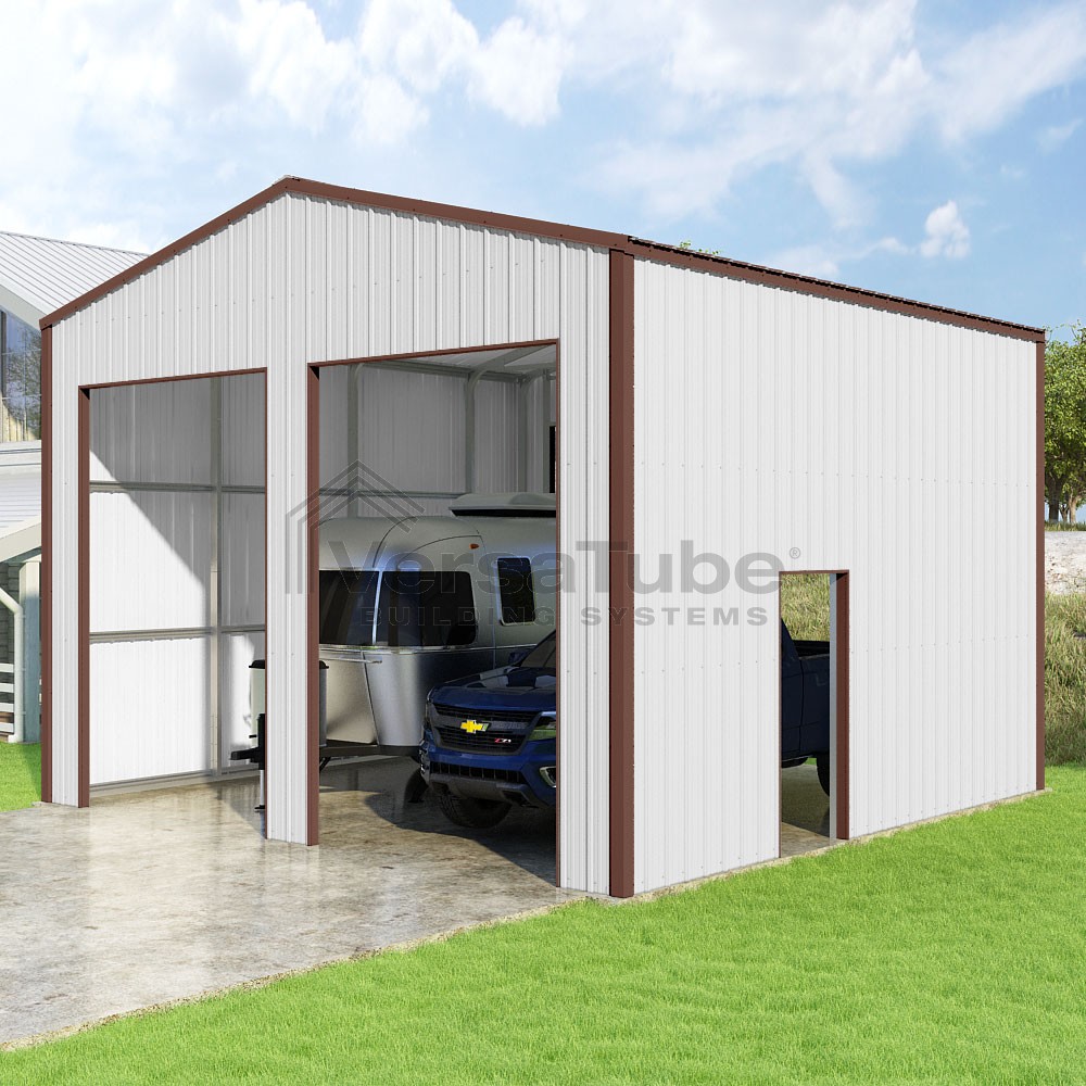 Summit Series DIY garage kit features vertical sheet metal roof and siding panels for a consistent look.