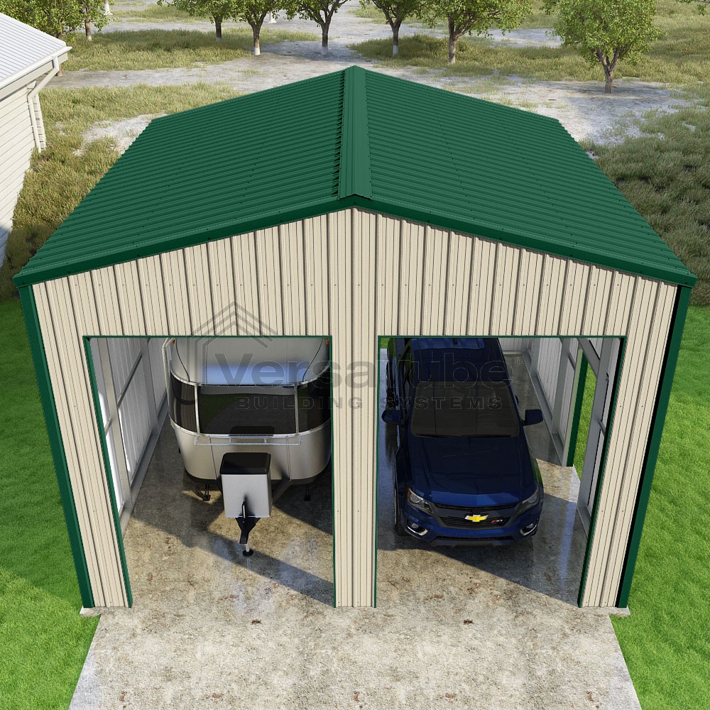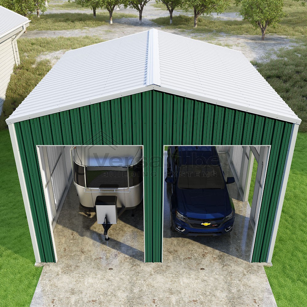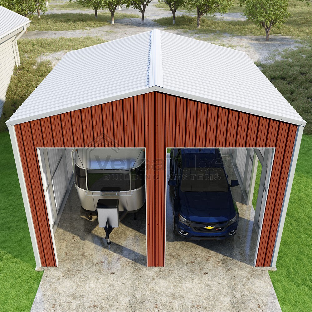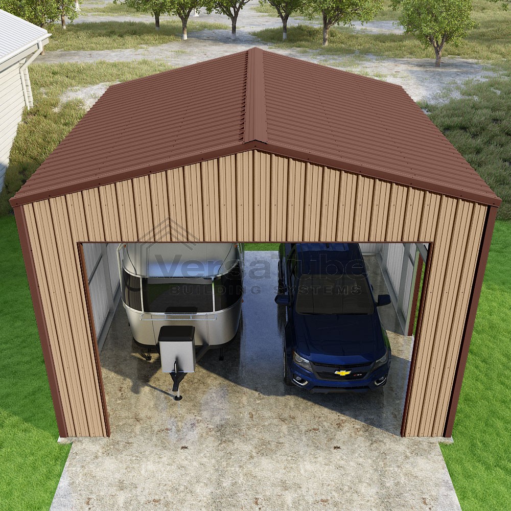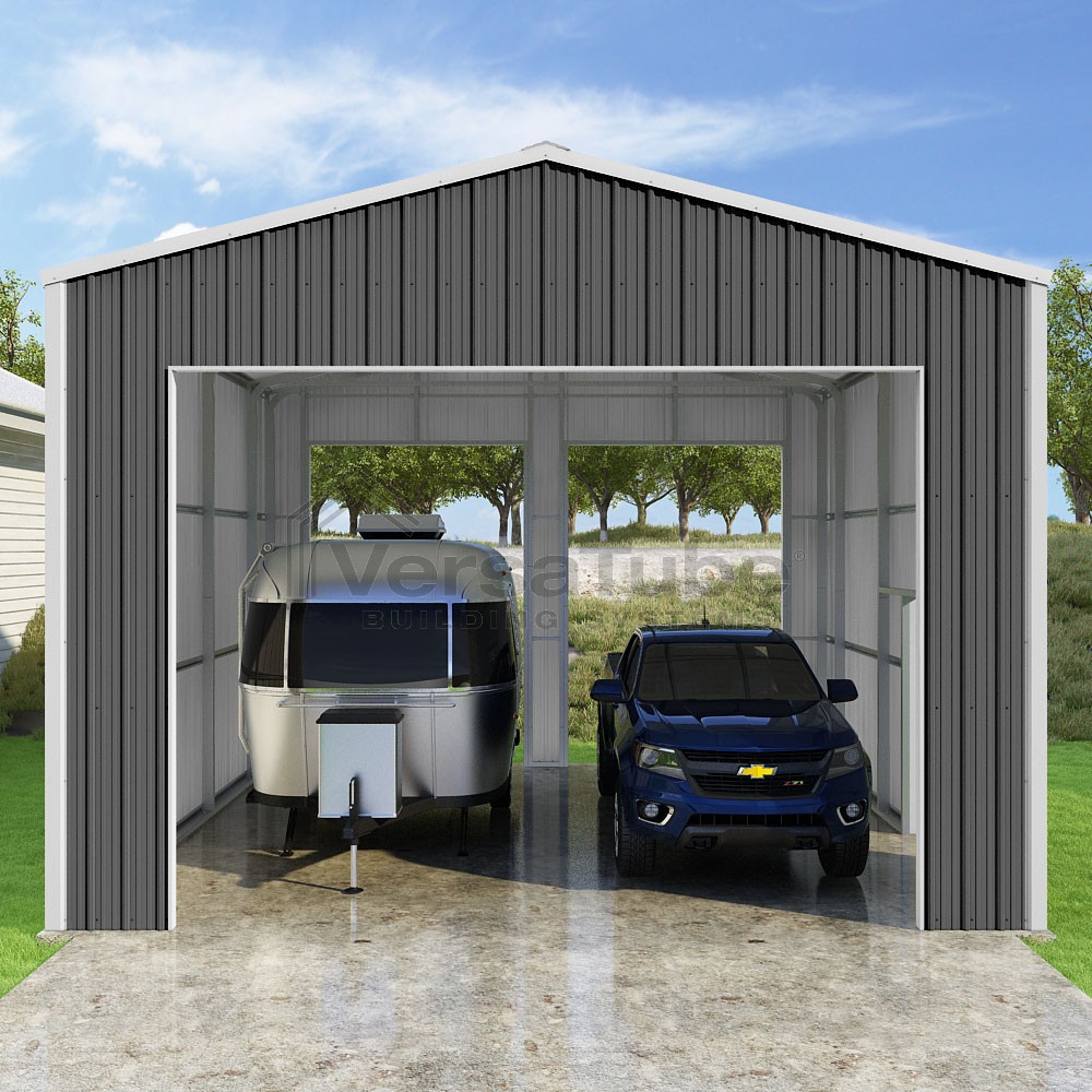 Summit Series DIY garage kit features vertical sheet metal roof and siding panels for a consistent look.