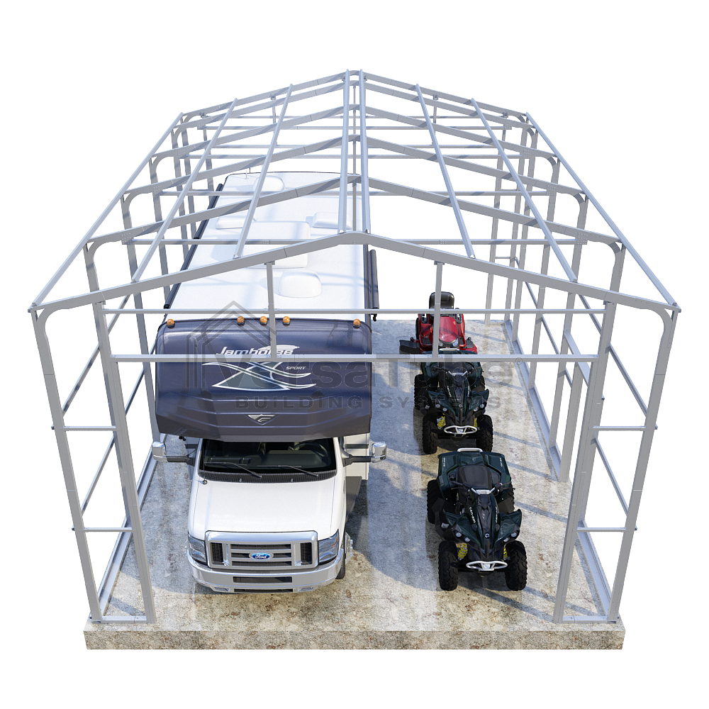 Summit Series DIY garage frame kit includes roof purlins and side girts for applying vertical sheet metal panels or other roofing or siding materials.