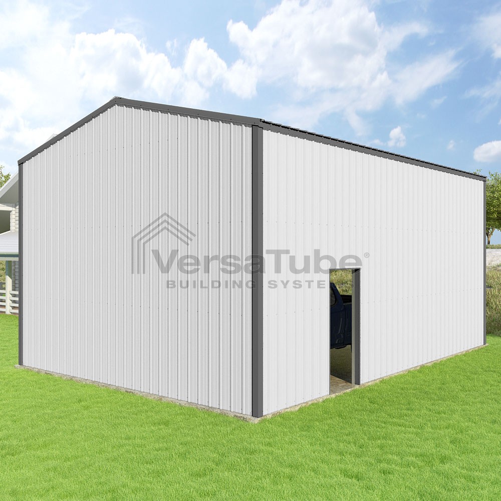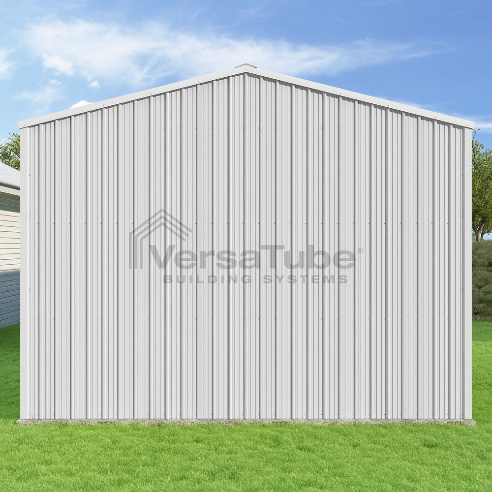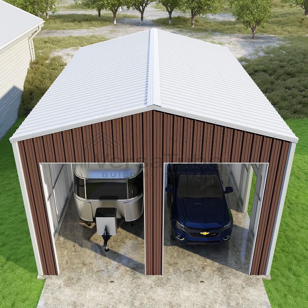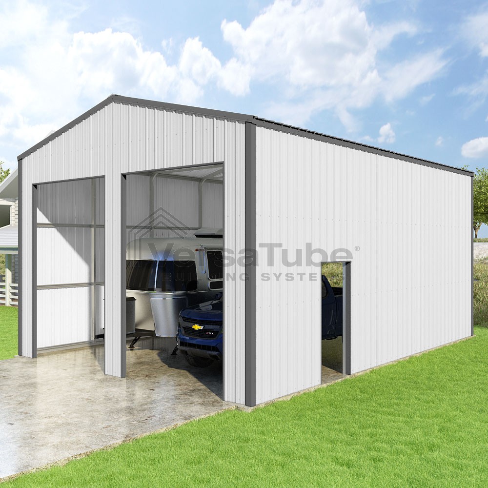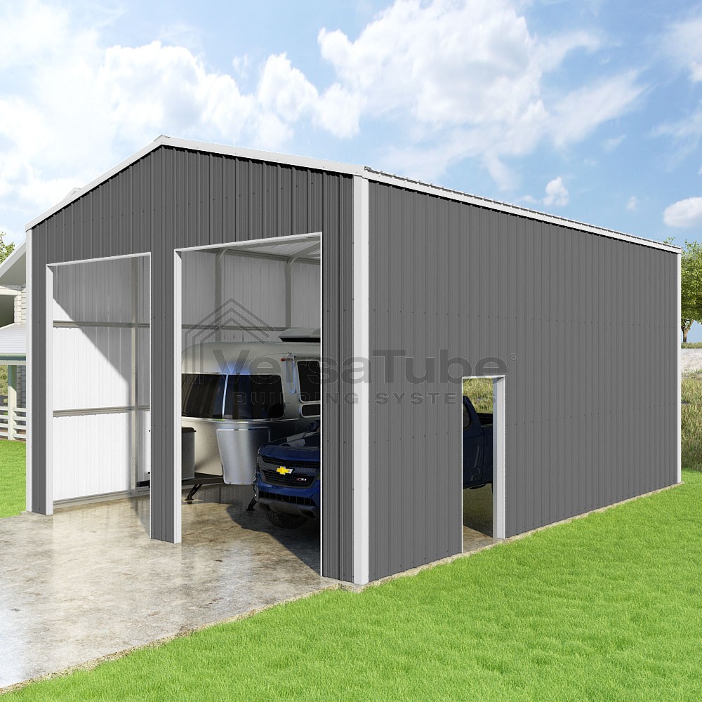 Summit Series DIY garage kit features vertical sheet metal roof and siding panels for a consistent look.