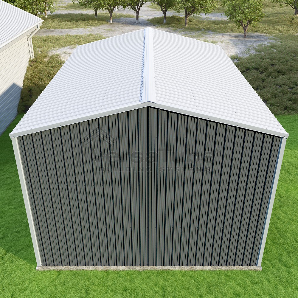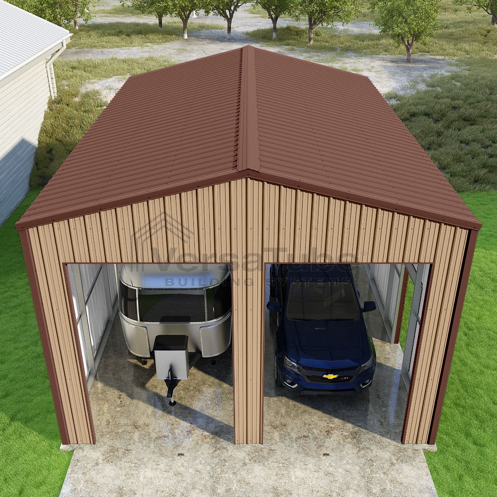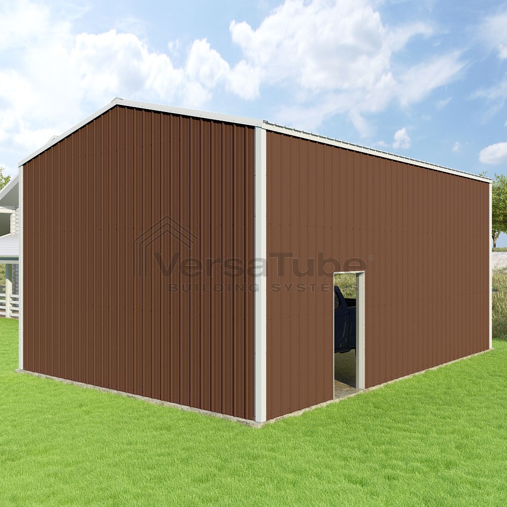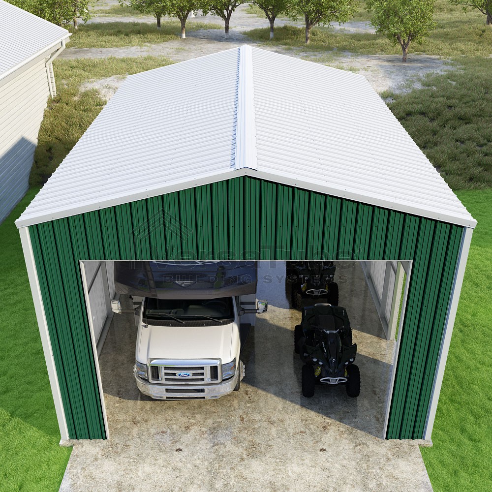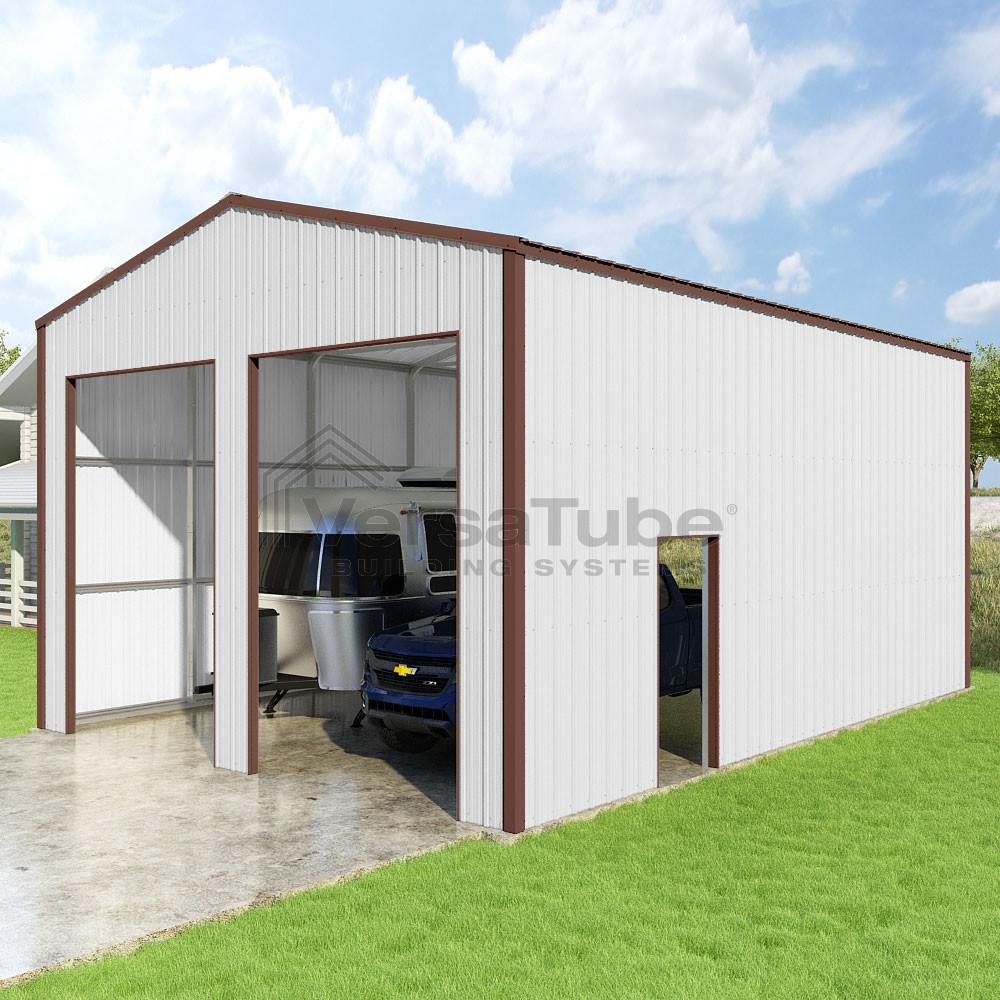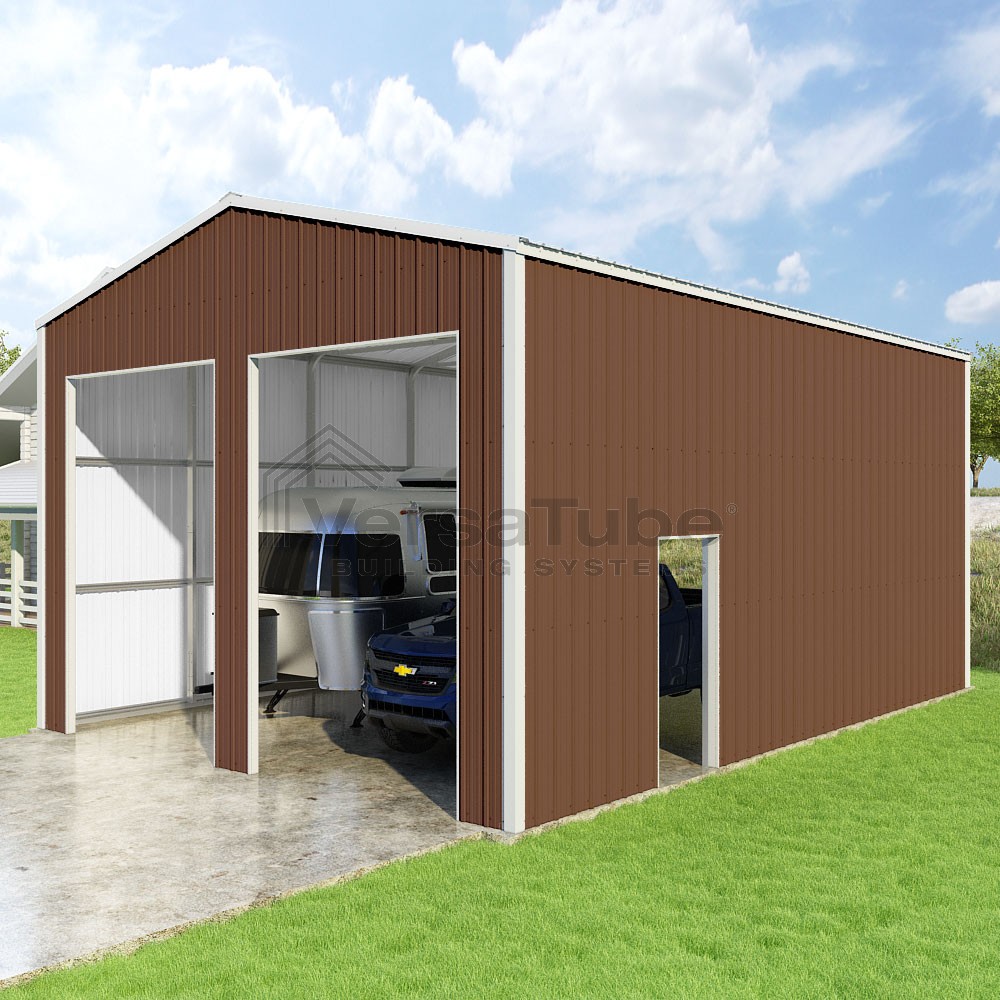 Summit Series DIY garage kit features vertical sheet metal roof and siding panels for a consistent look.