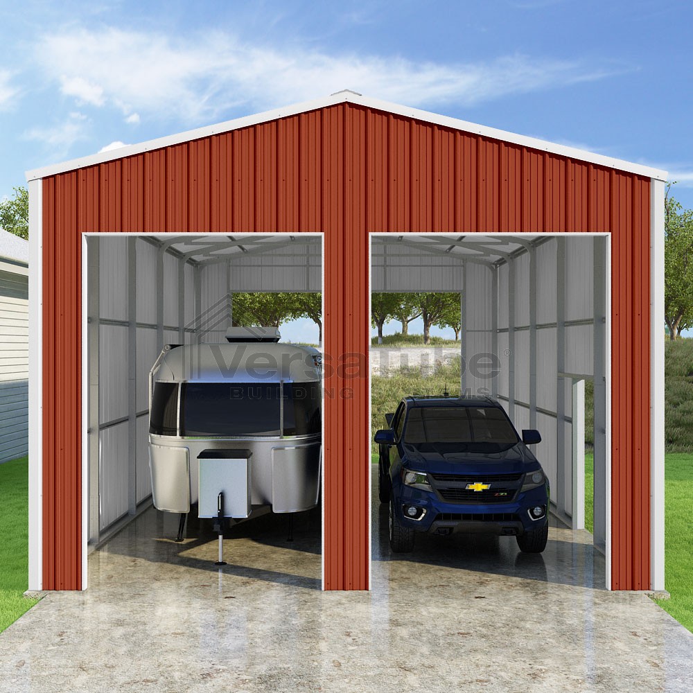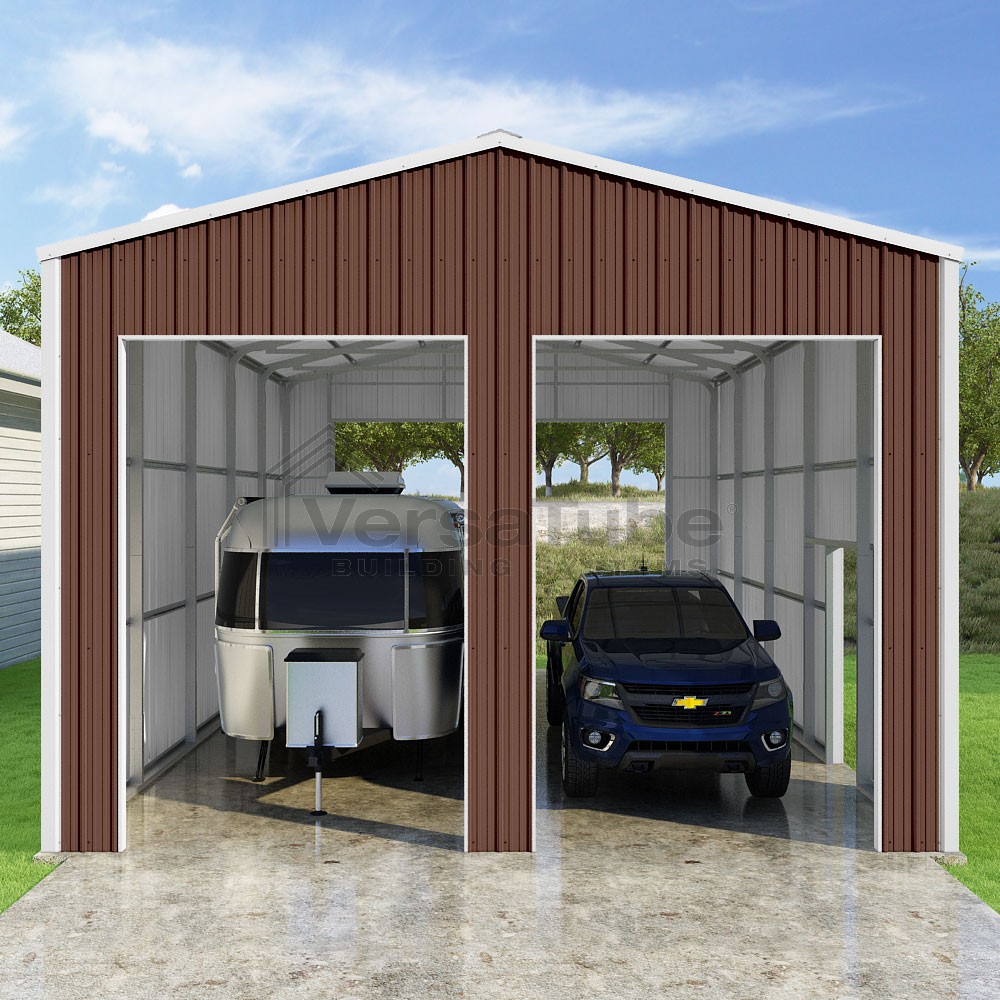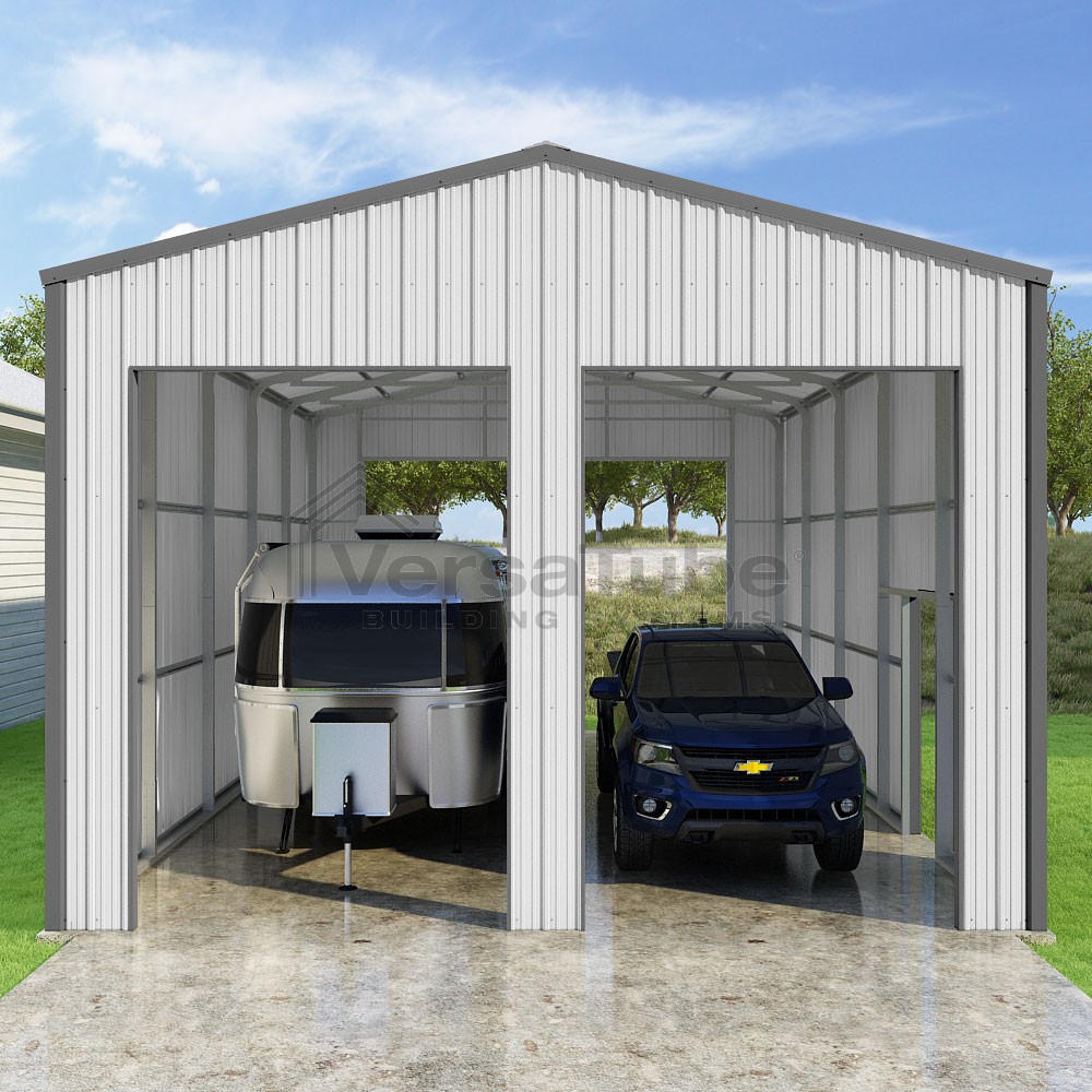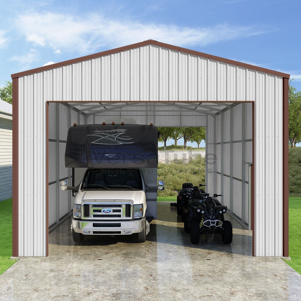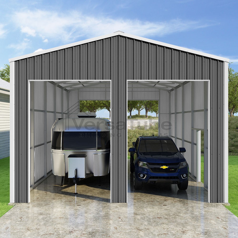 Summit Series DIY garage kit features vertical sheet metal roof and siding panels for a consistent look.
