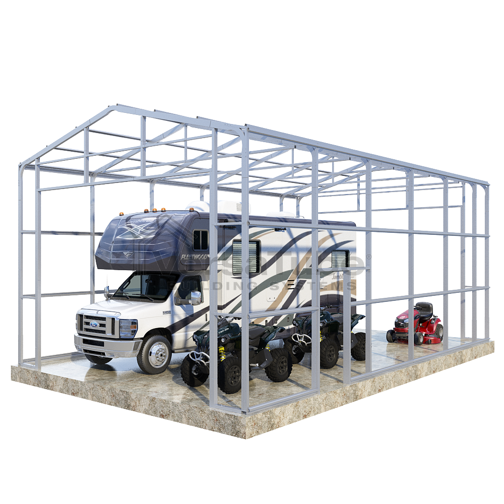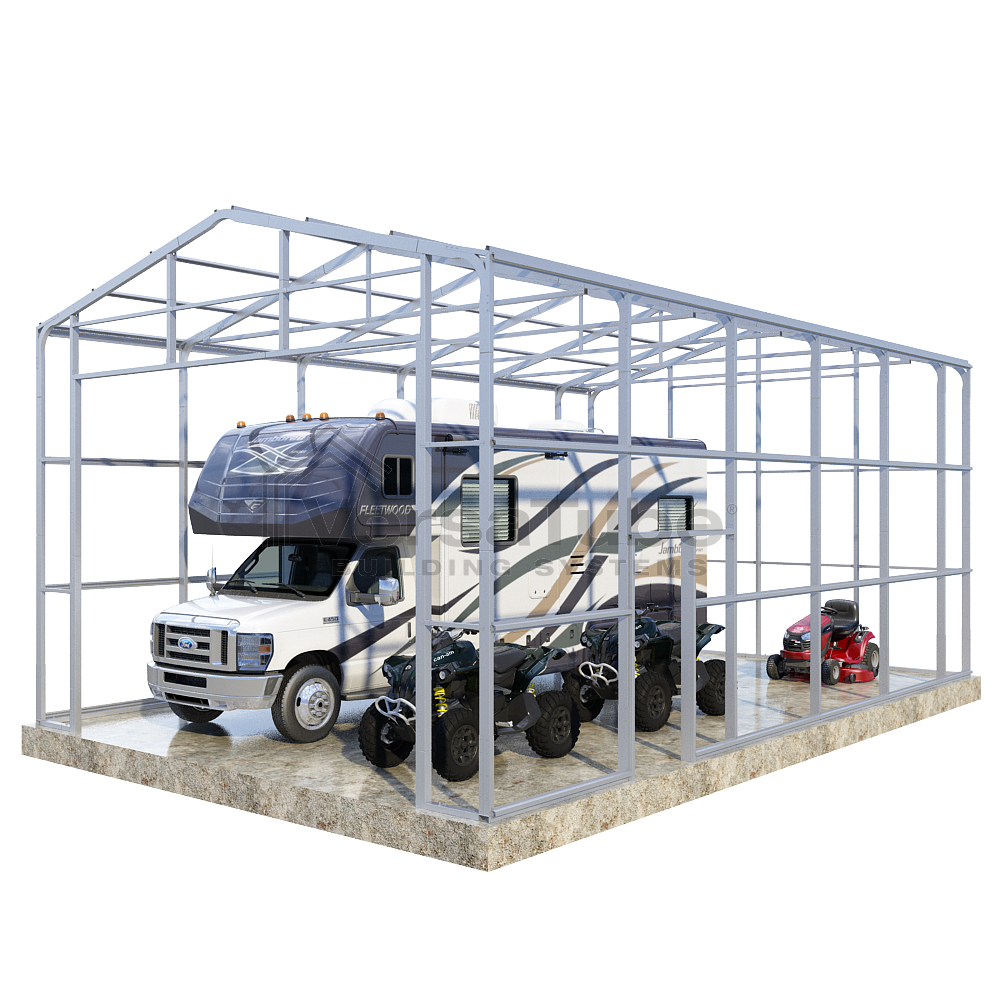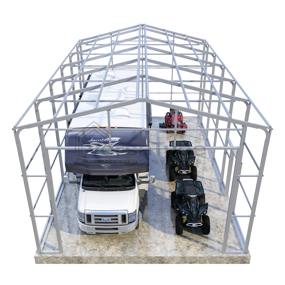 Summit Series DIY garage frame kit includes roof purlins and side girts for applying vertical sheet metal panels or other roofing or siding materials.